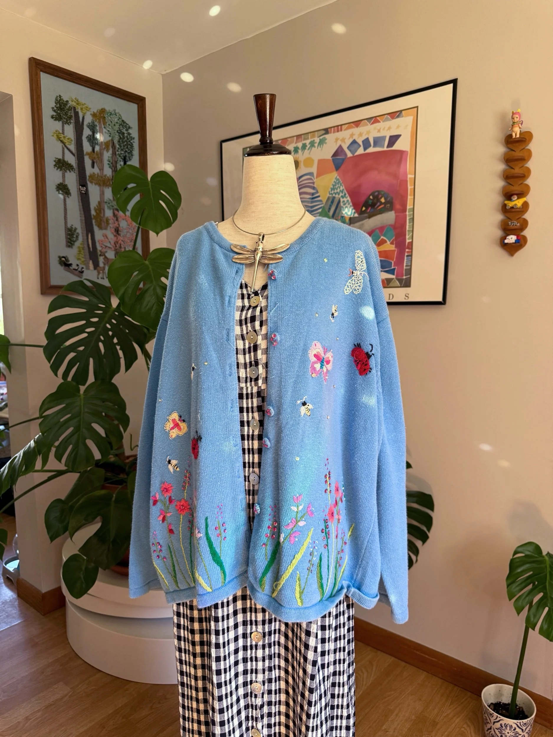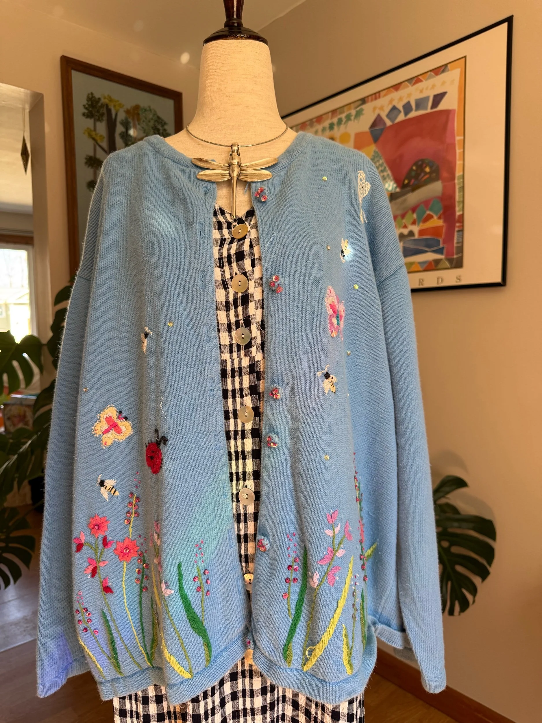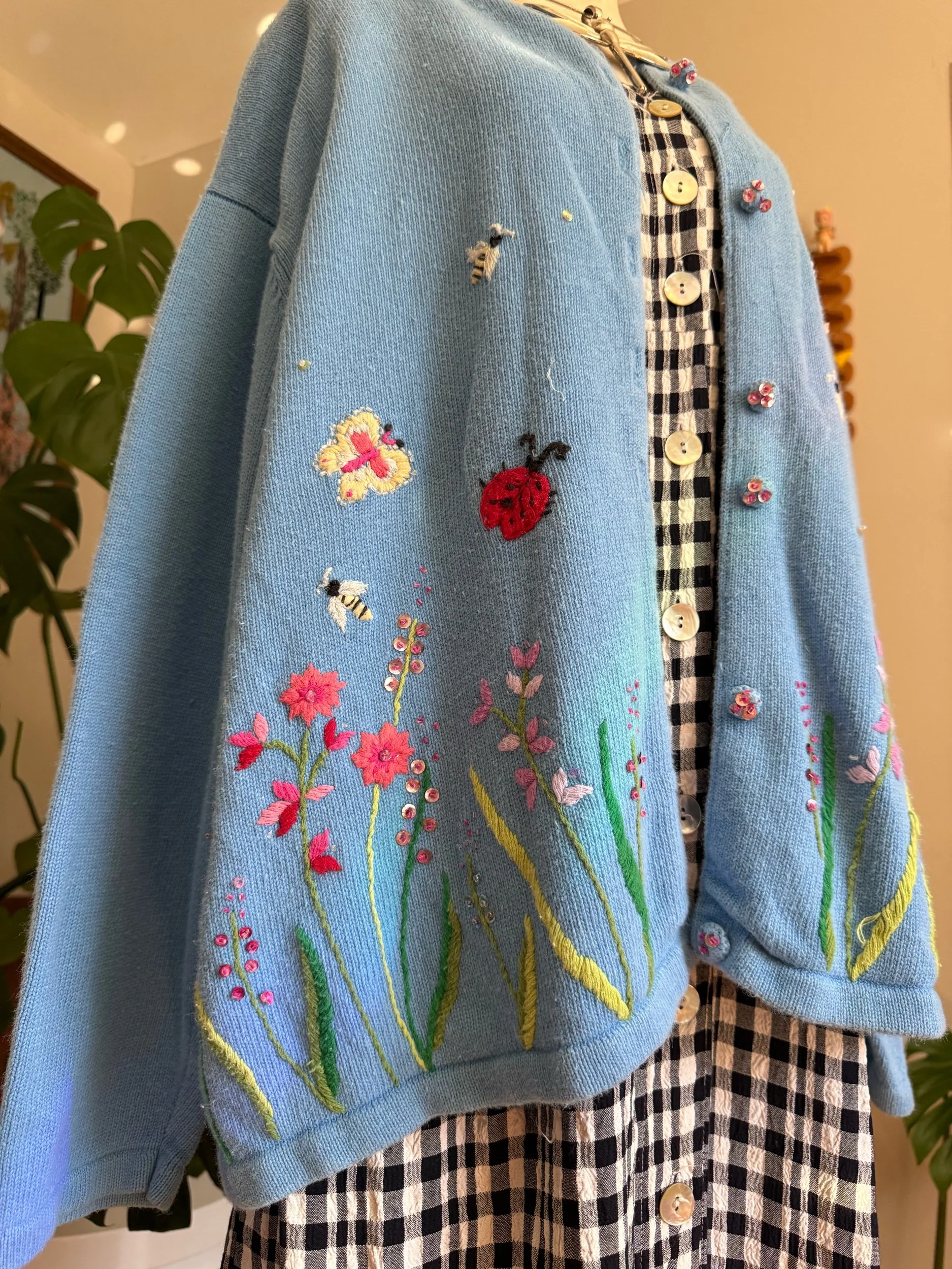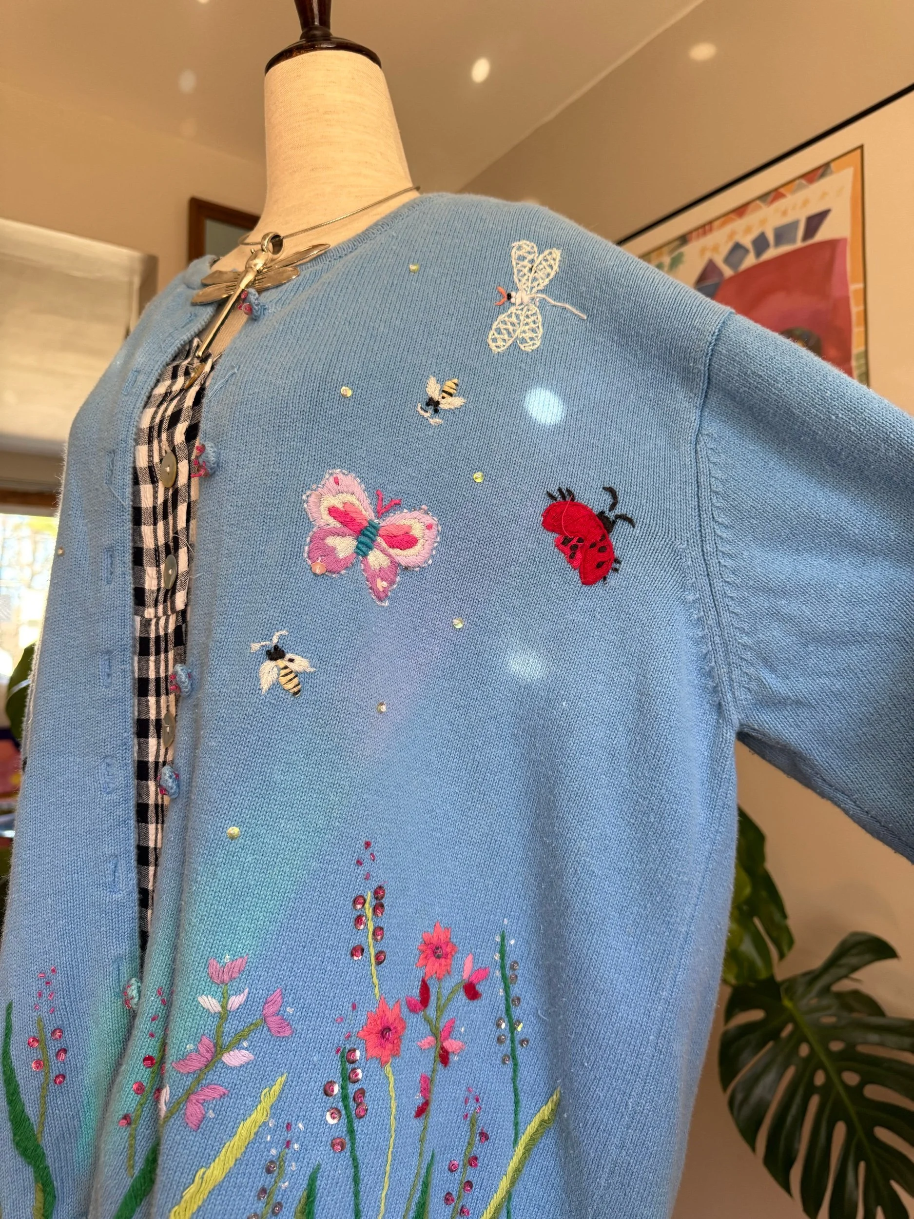 the sweetest spring cardigan with insects, embroidery, and beading :)