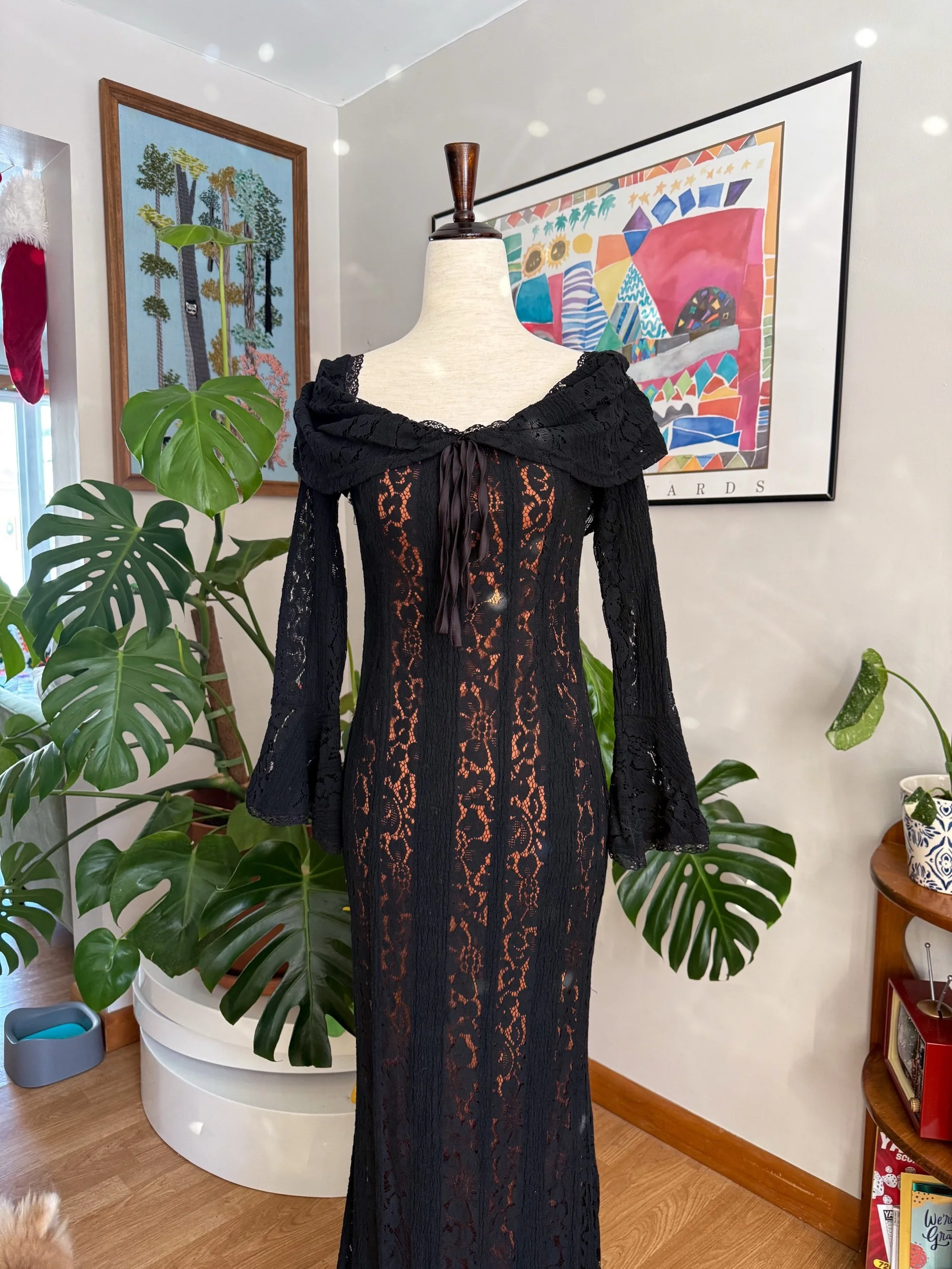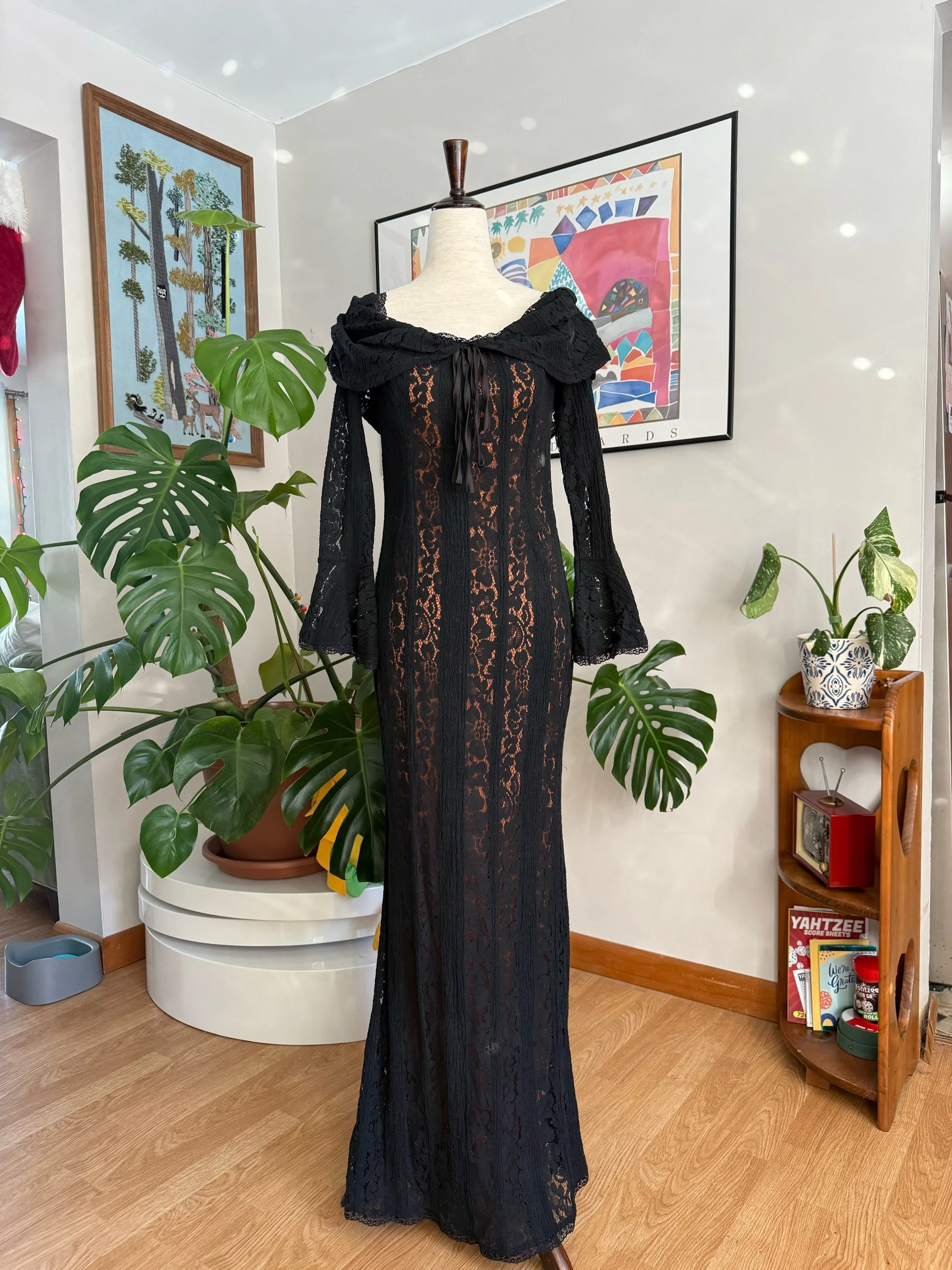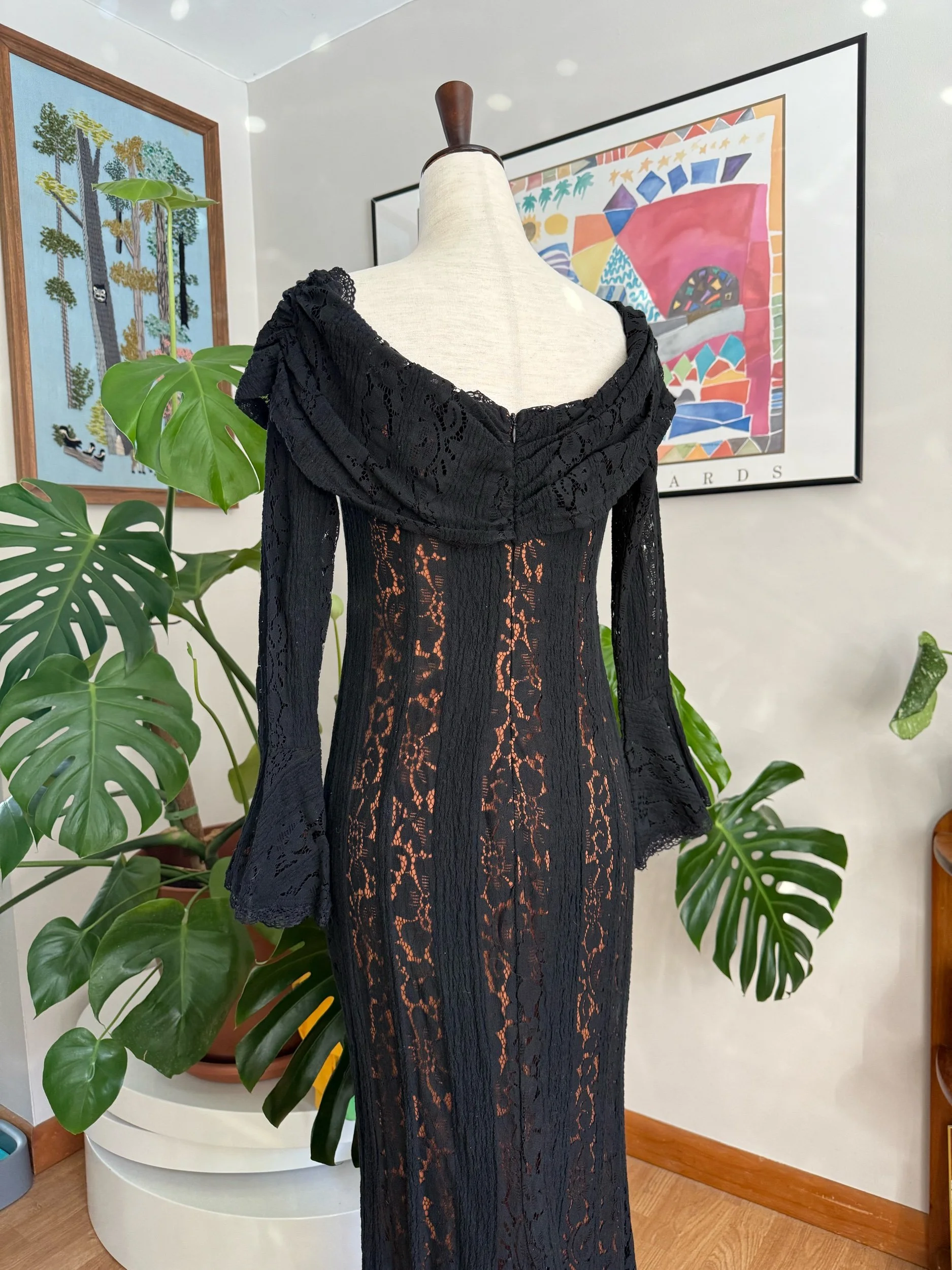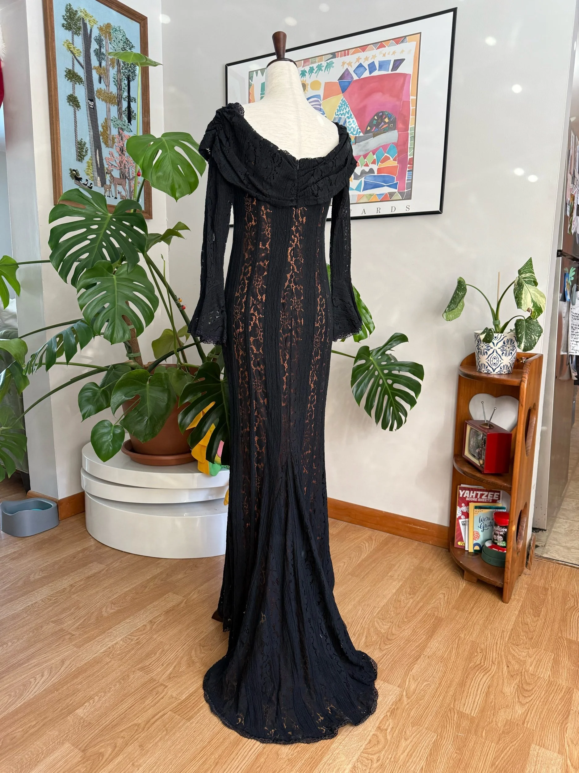STUNNING floor length lace gown / has under-layer so it’s not see through / flare sleeves / zipper backing / there’s no tag for brand or material sadly