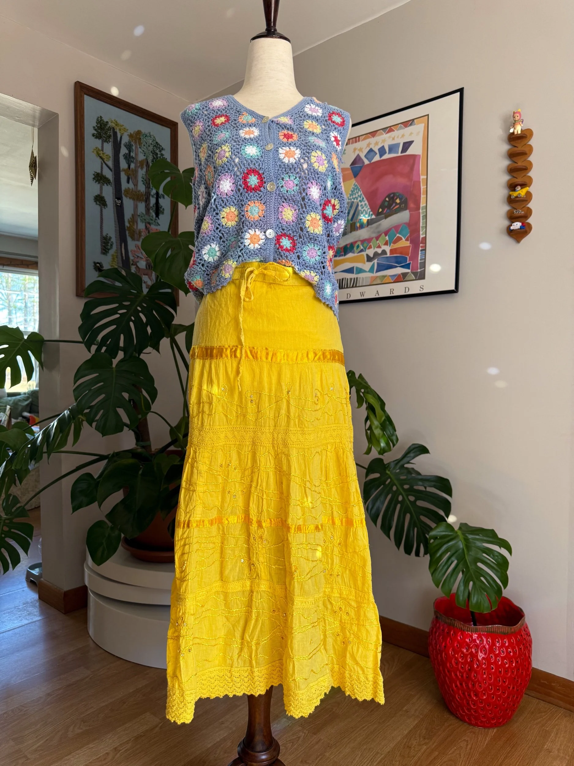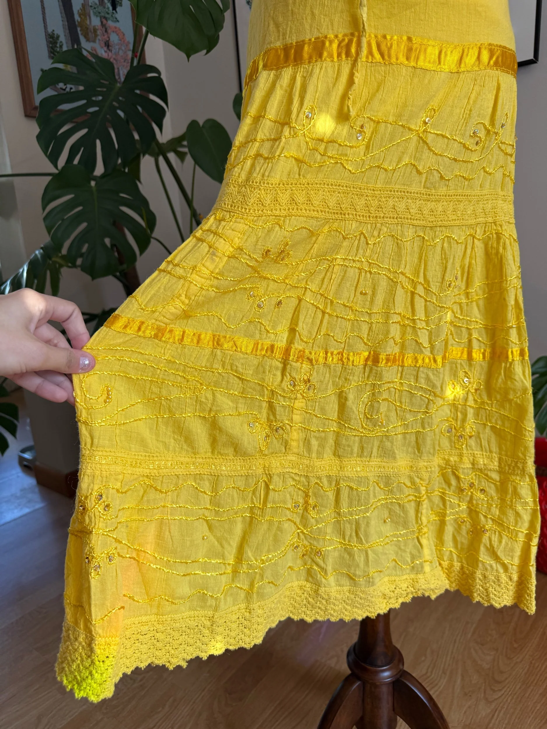 beautiful spring yellow skirt with embellishments & embroidery! Has waist tie