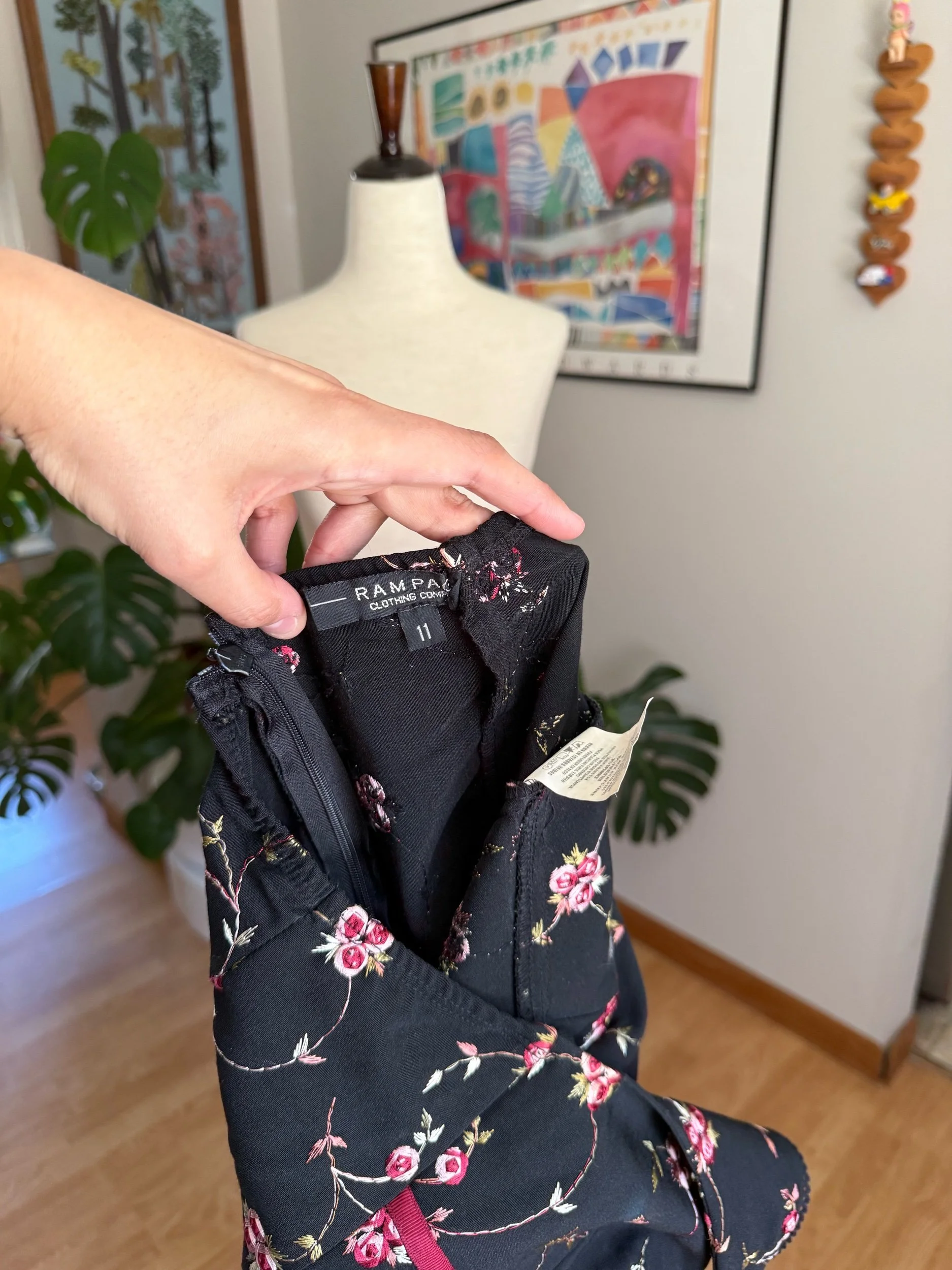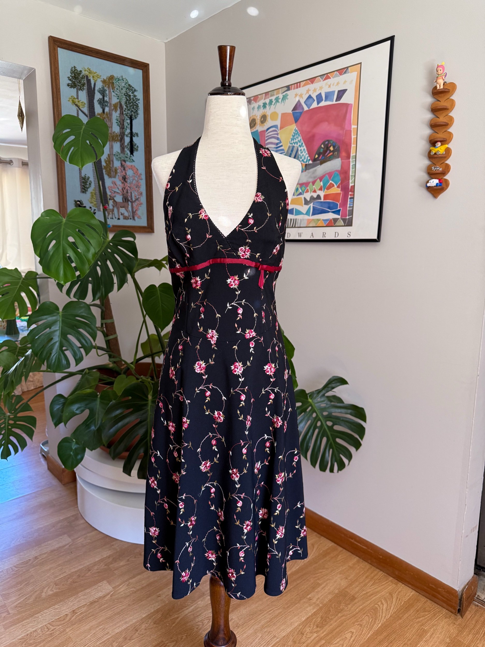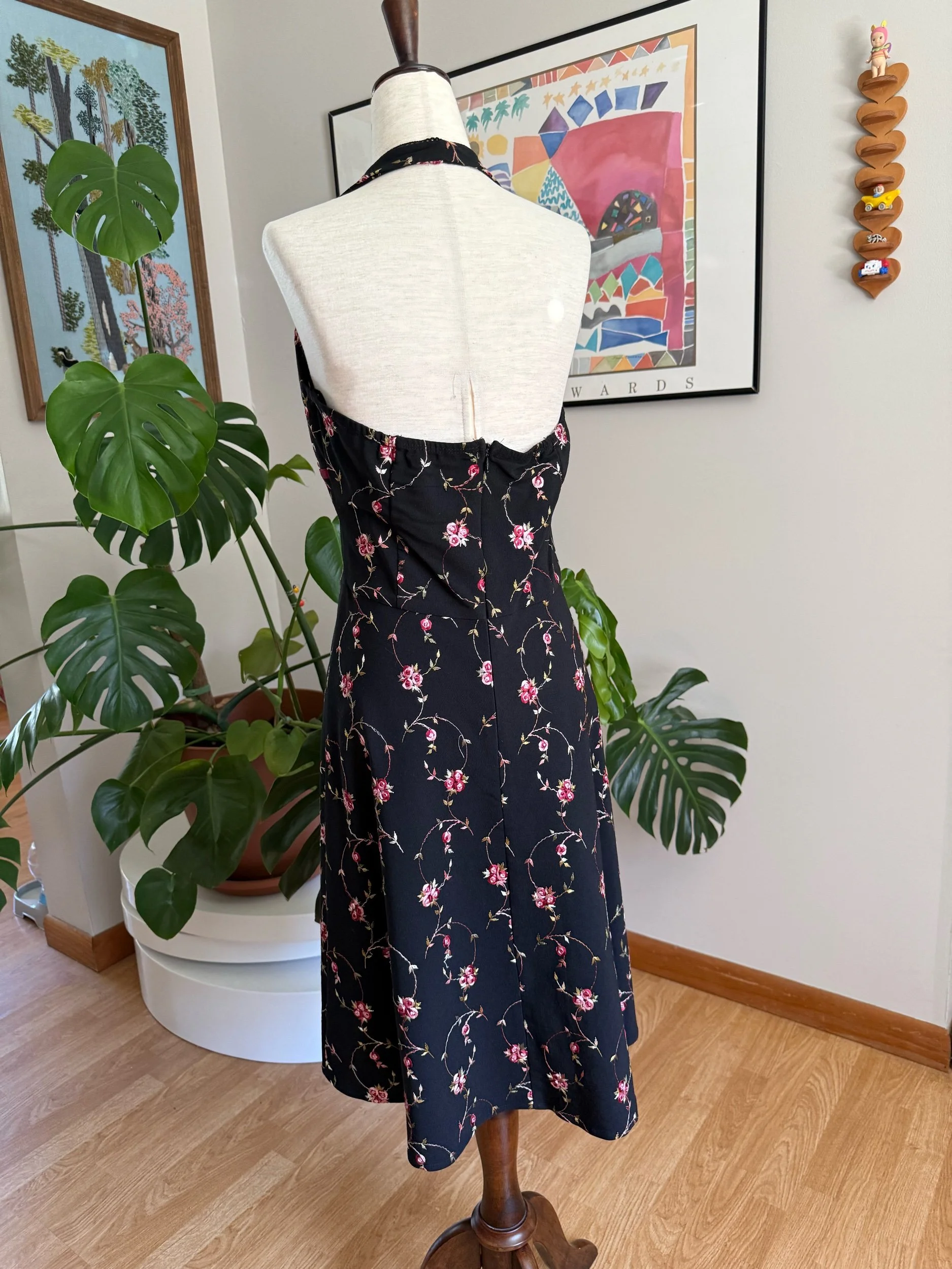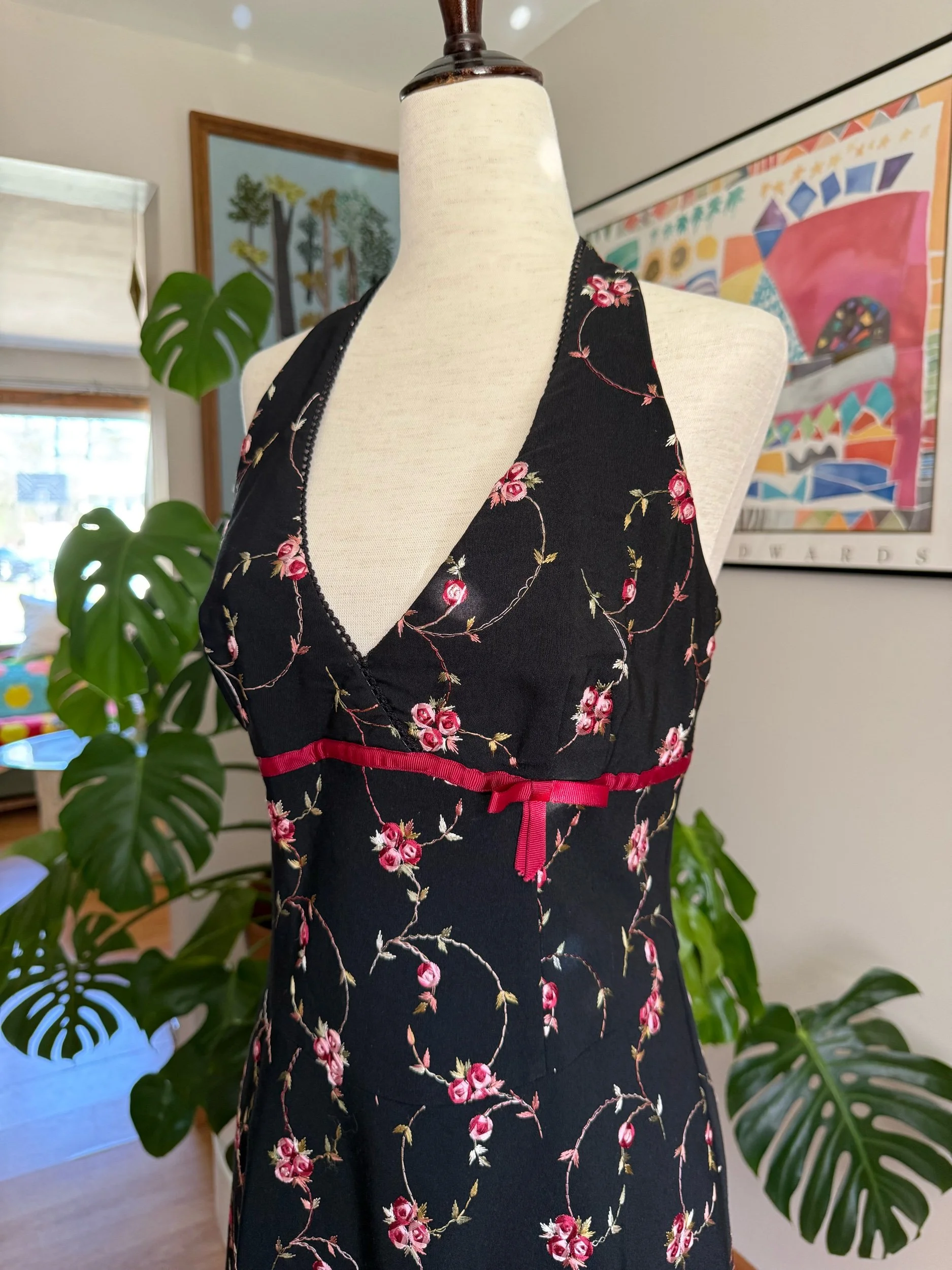 Beautiful 90s/early 2000s halter dress, with an open back, floral embroidery throughout, and sweet little bow detailing - has a zipper closure in the back!