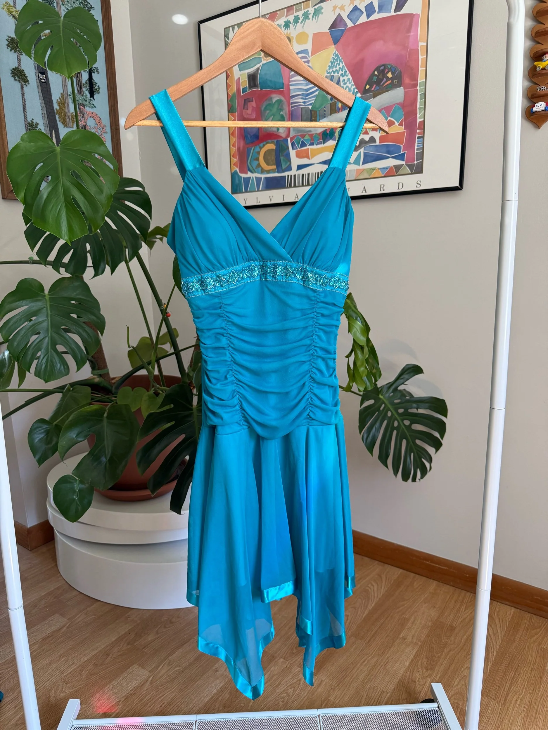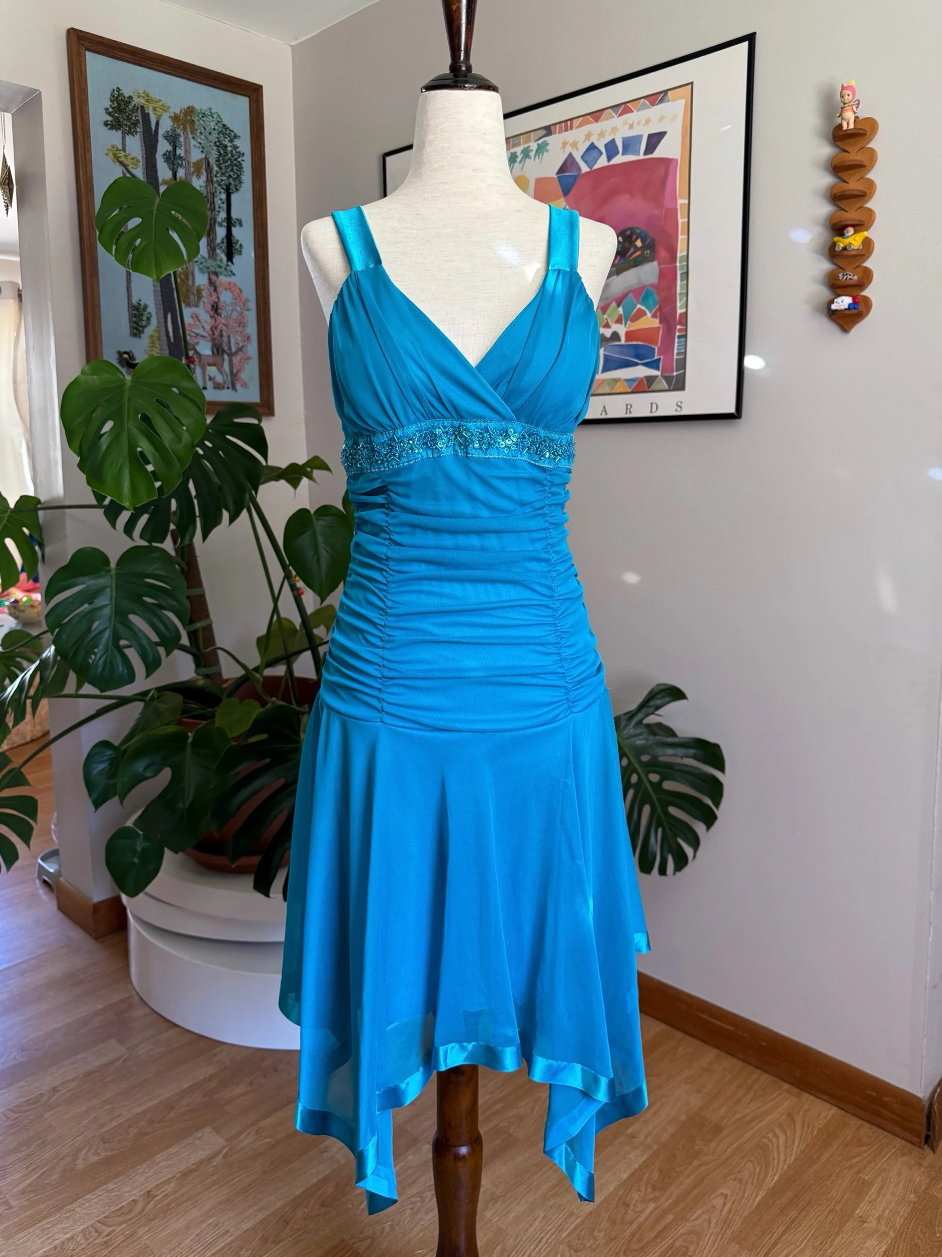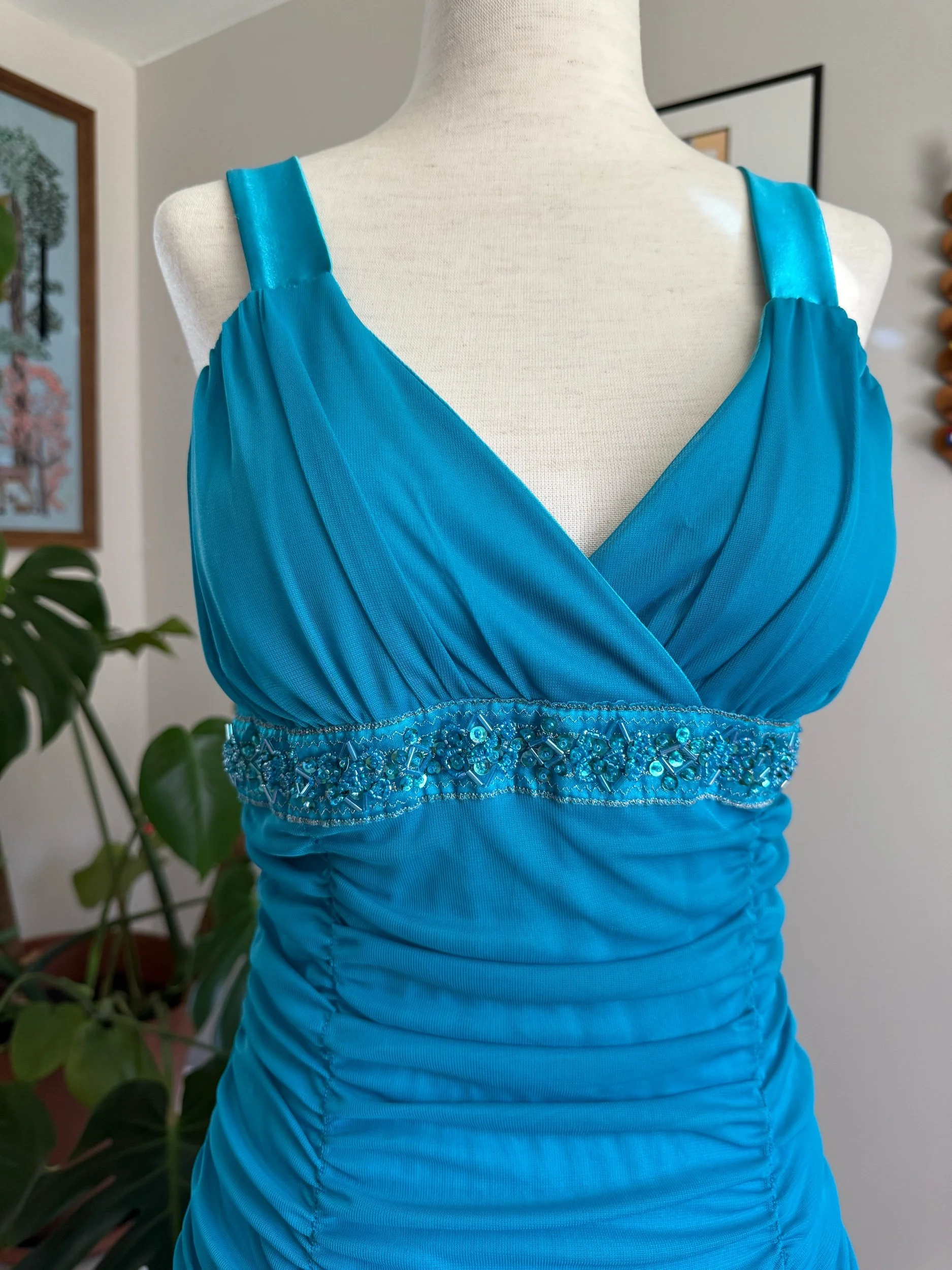 I adore this teal color, and the beading is so gorgeous! Beautiful asymmetrical hem, so fairy-like. *Please note slight discoloration on straps and small pulls shown in photo