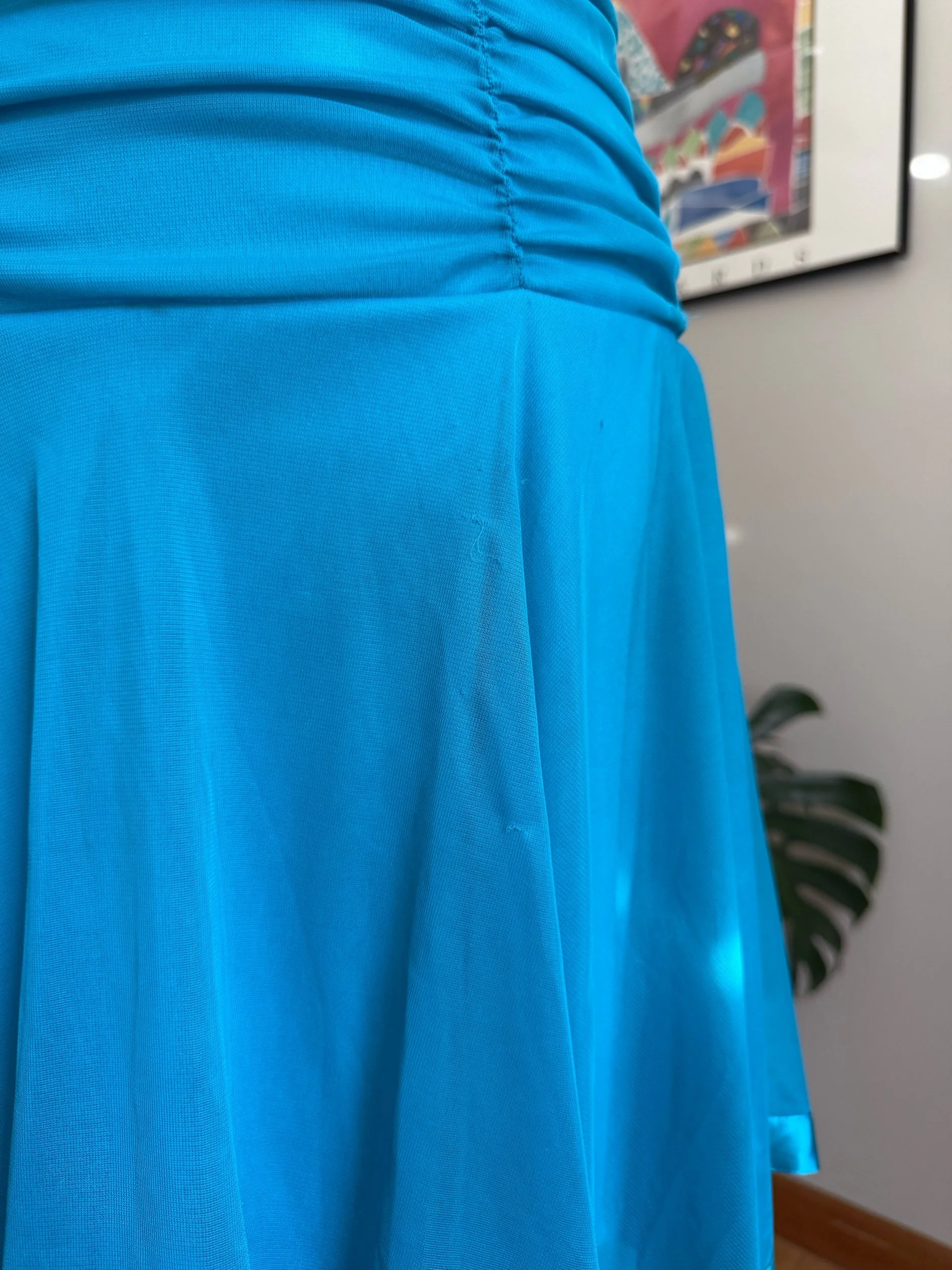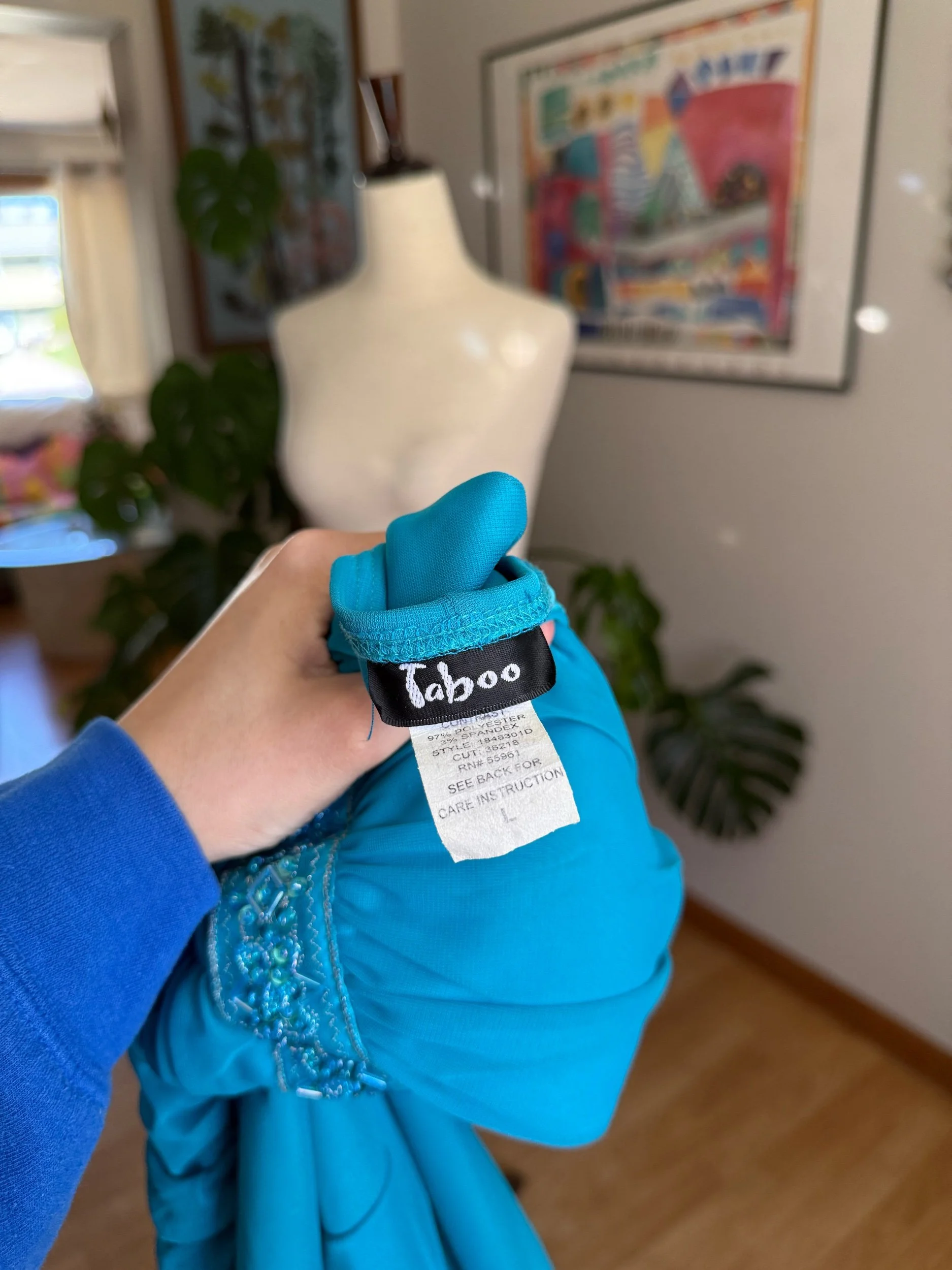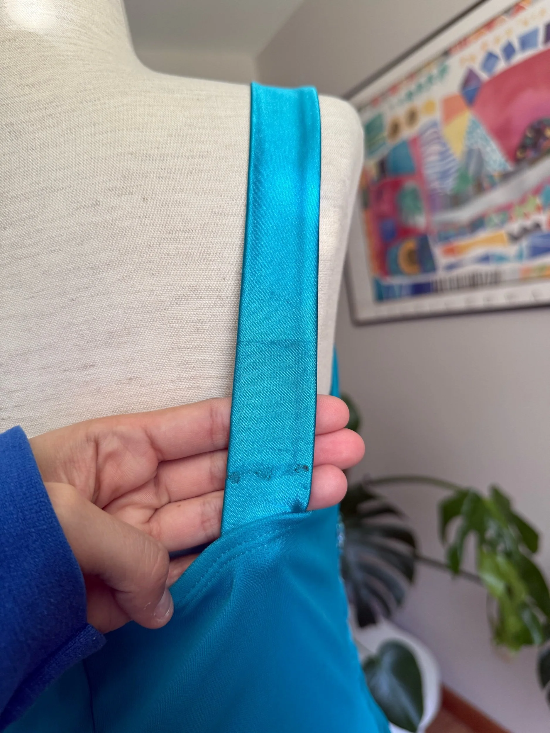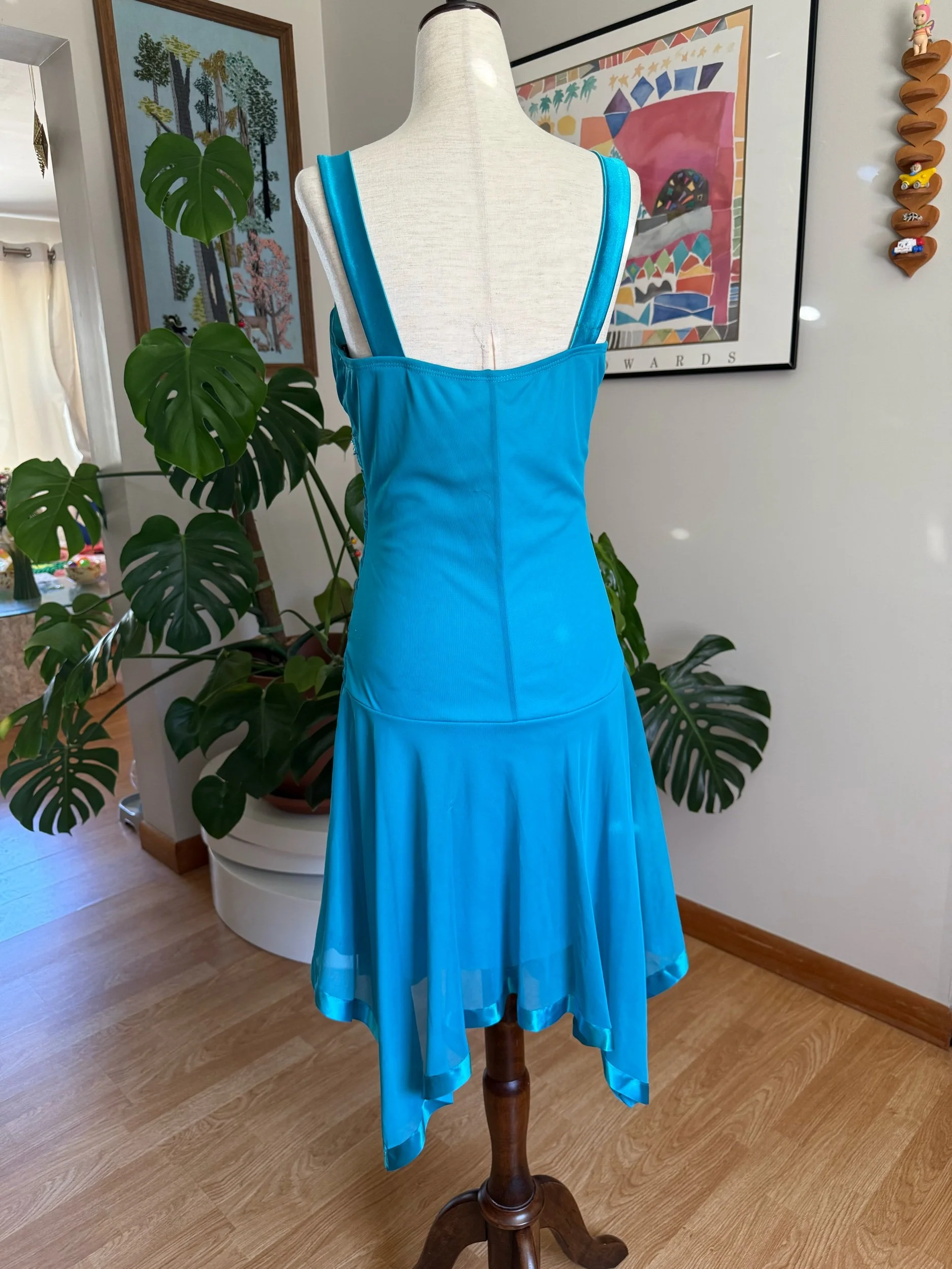 I adore this teal color, and the beading is so gorgeous! Beautiful asymmetrical hem, so fairy-like. *Please note slight discoloration on straps and small pulls shown in photo