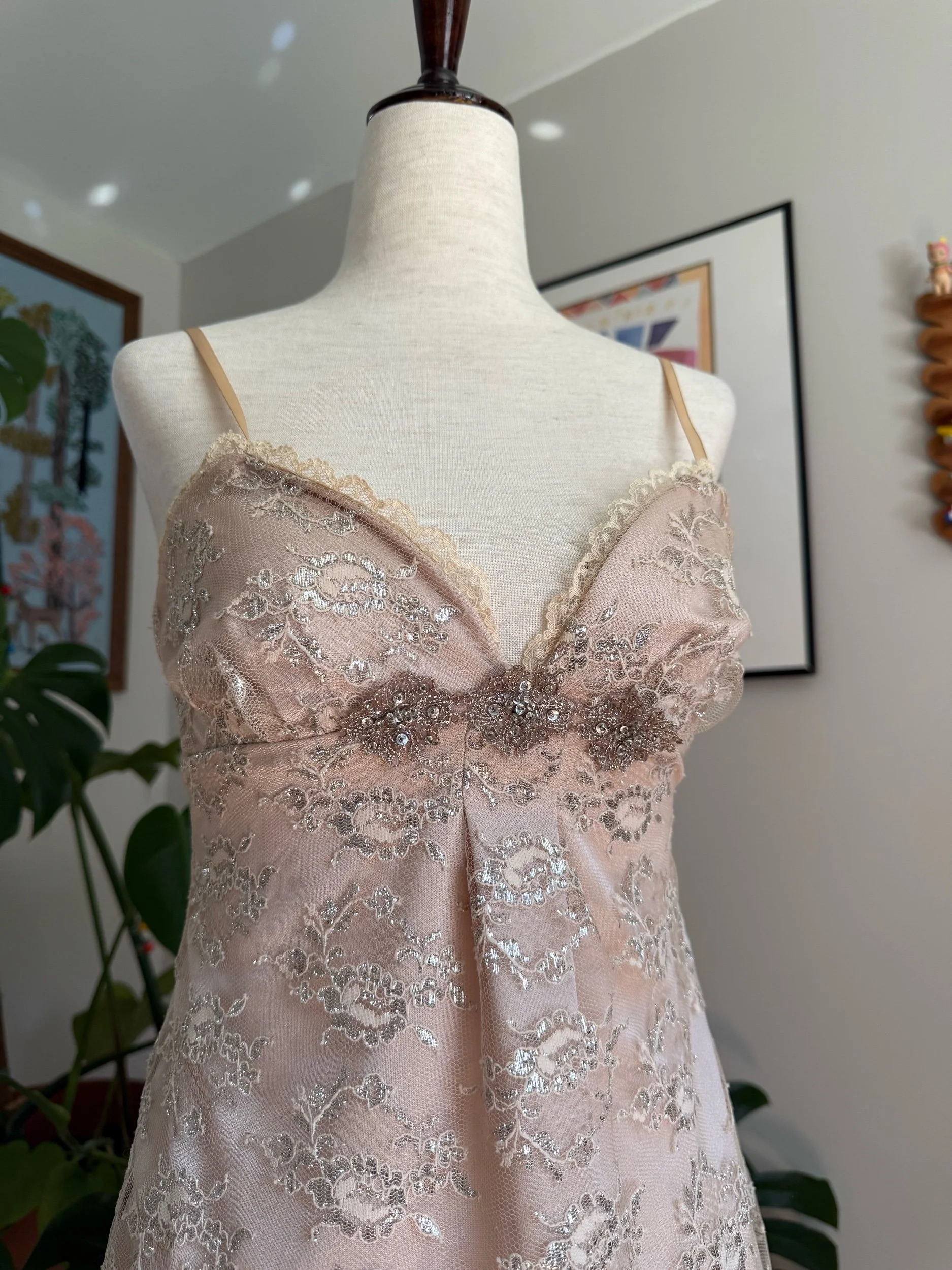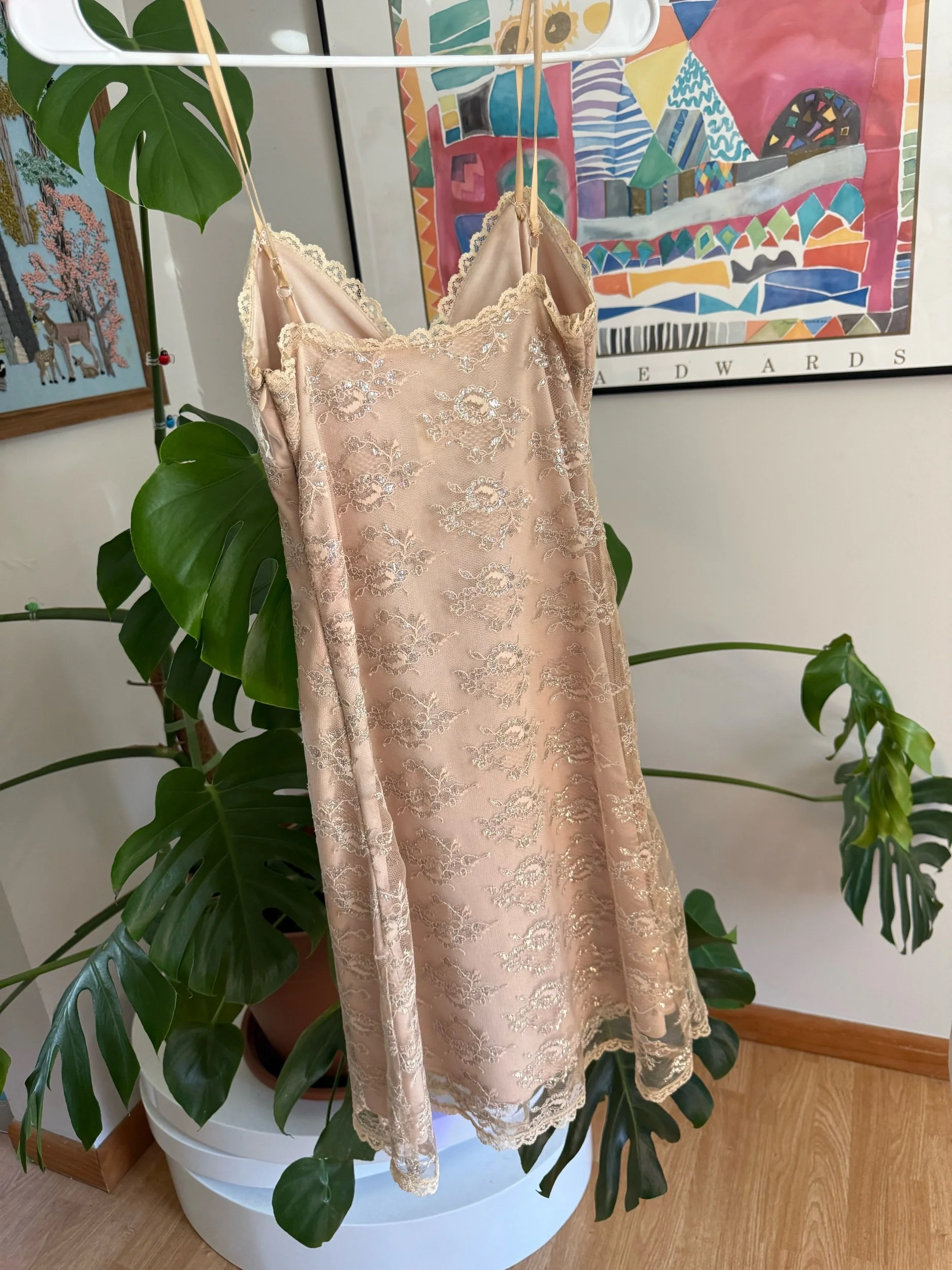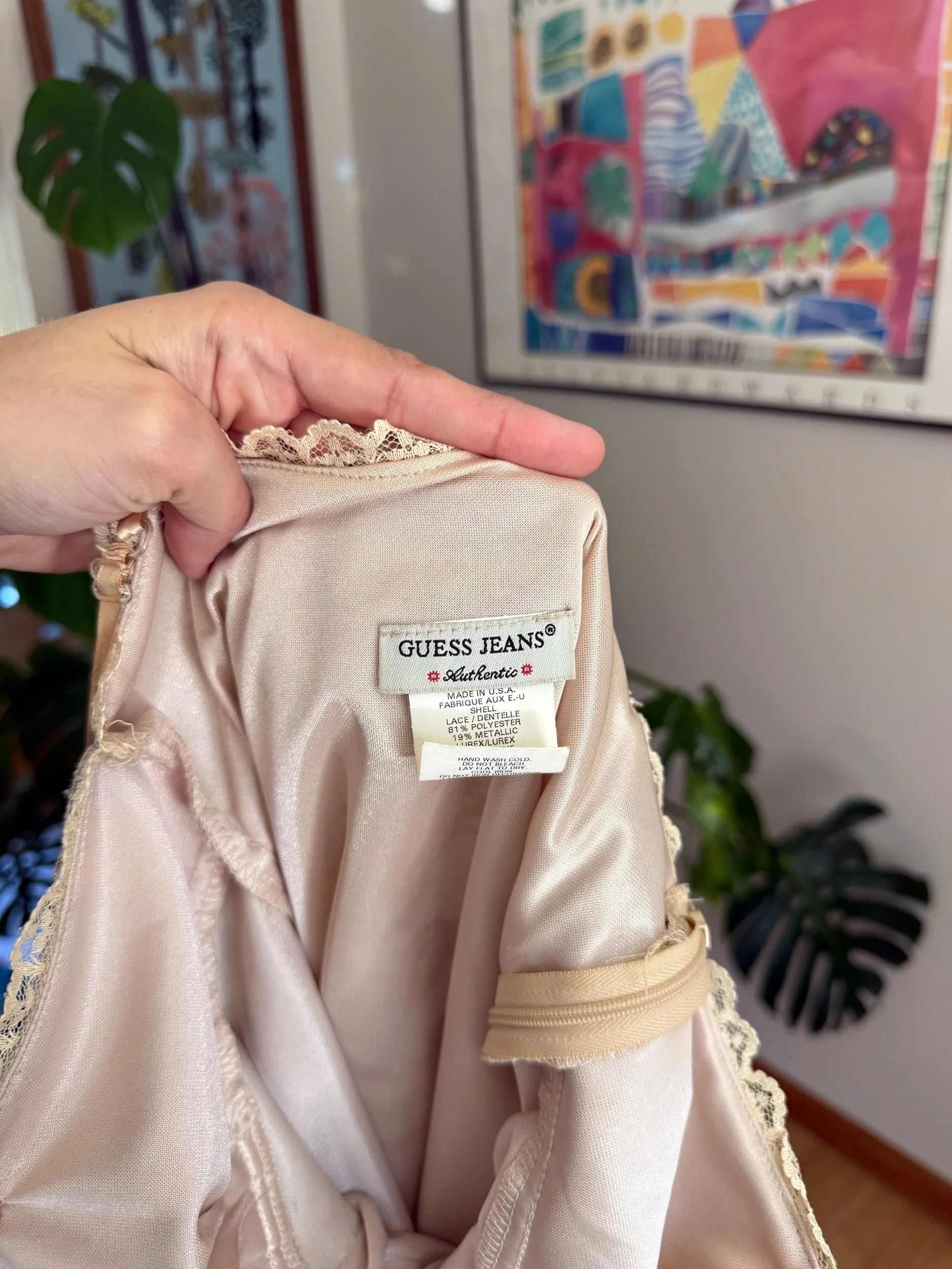 Beautiful & timeless vintage paper tag “Guess” dress, with detailed top & metallic lace all over / has adjustable straps / *Please note there is a small flaw in the lace fabric, as shown in last photo