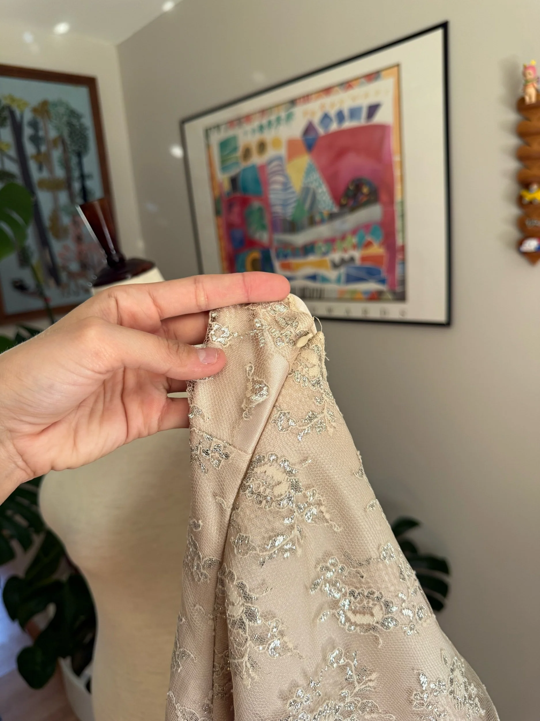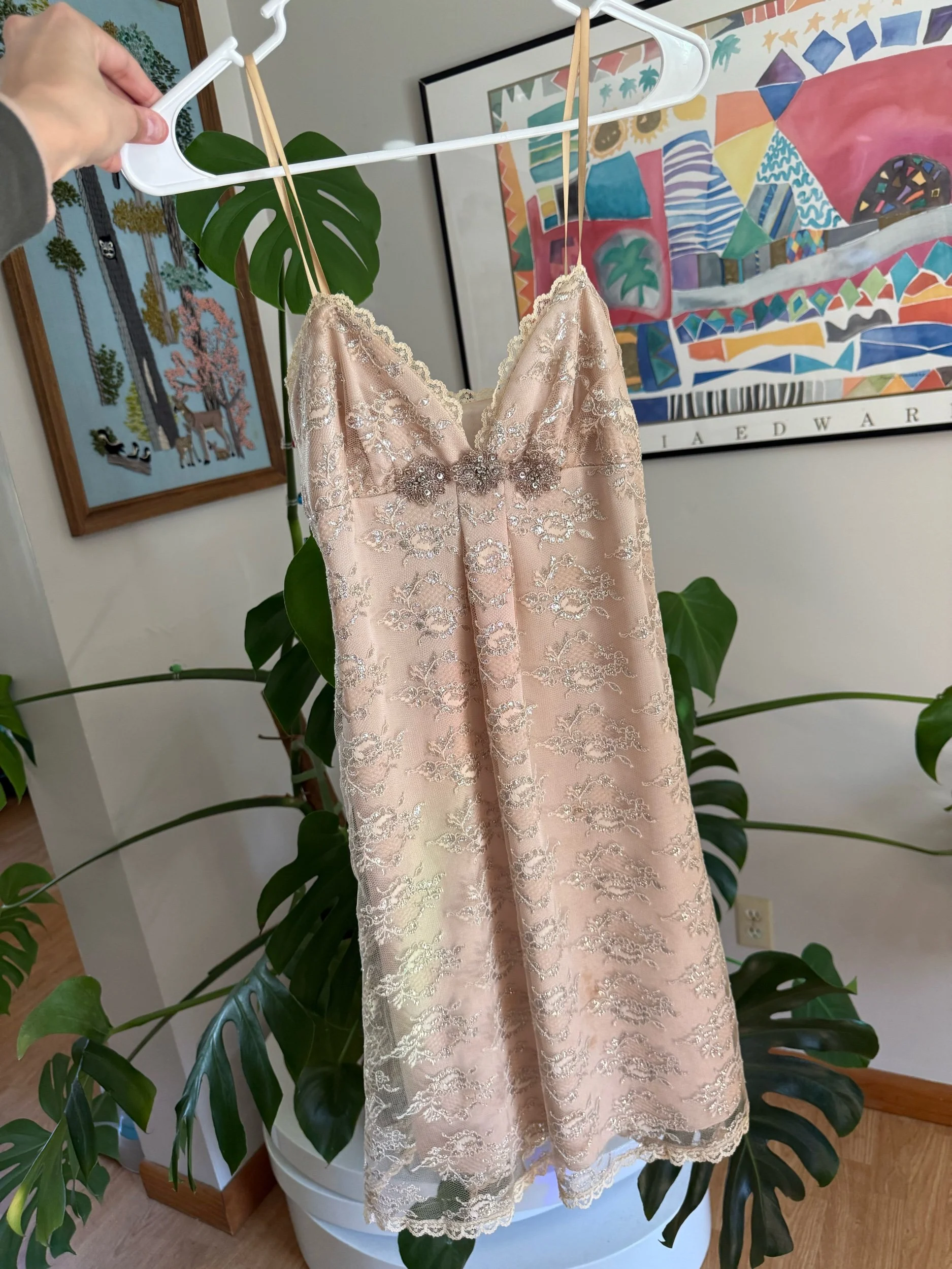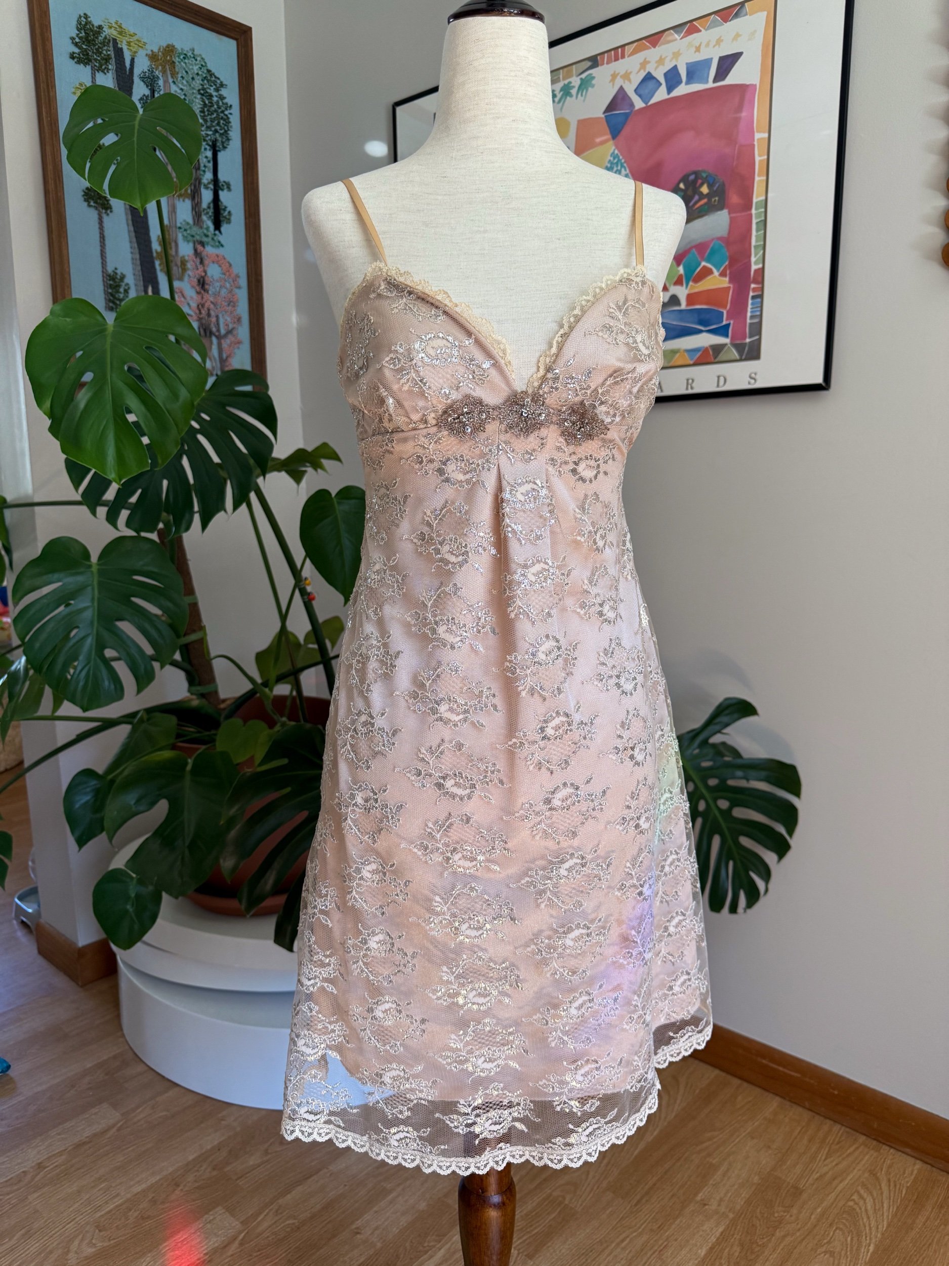 Beautiful & timeless vintage paper tag “Guess” dress, with detailed top & metallic lace all over / has adjustable straps / *Please note there is a small flaw in the lace fabric, as shown in last photo