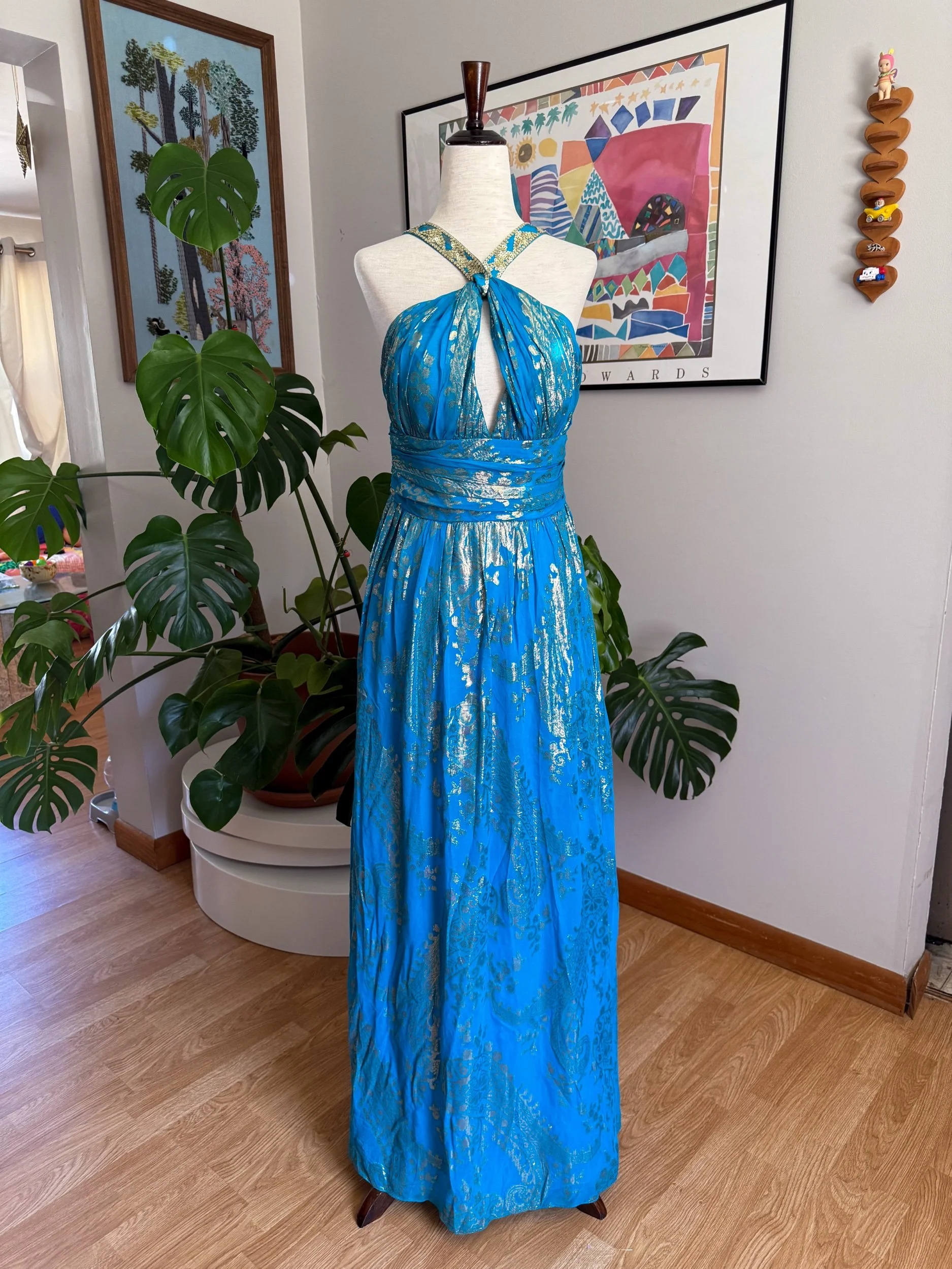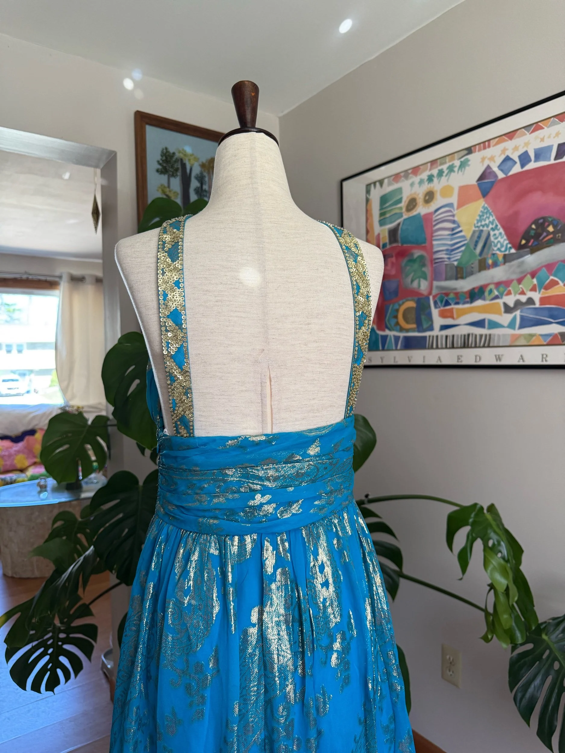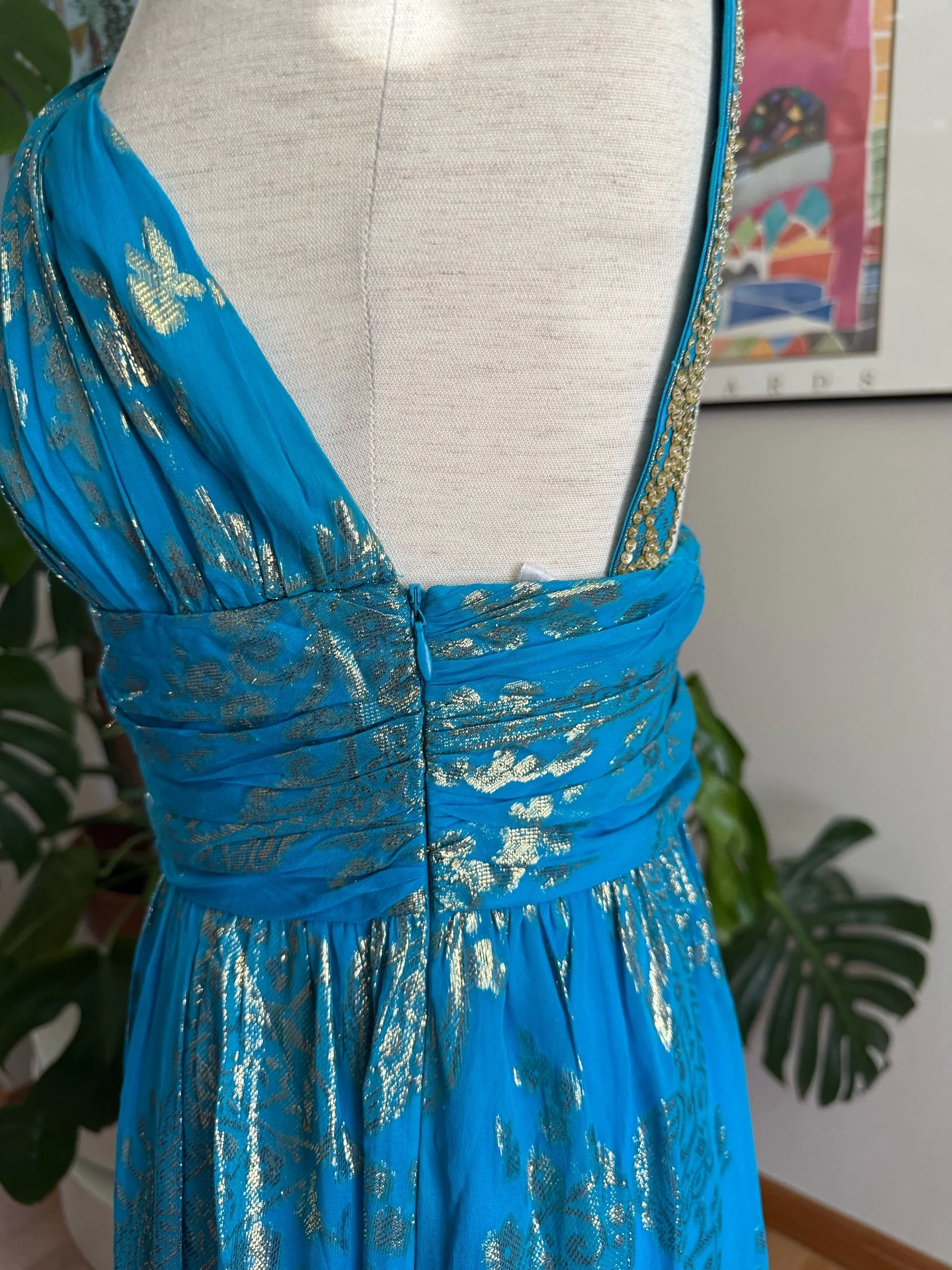 Beautiful shimmering & shining gold and blue dress, with beaded straps, and flowy bottom. This beauty has a side zipper closure