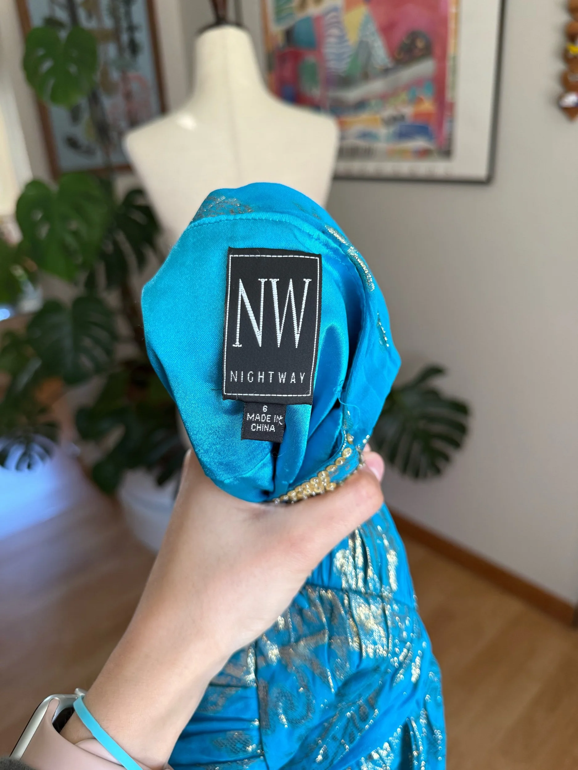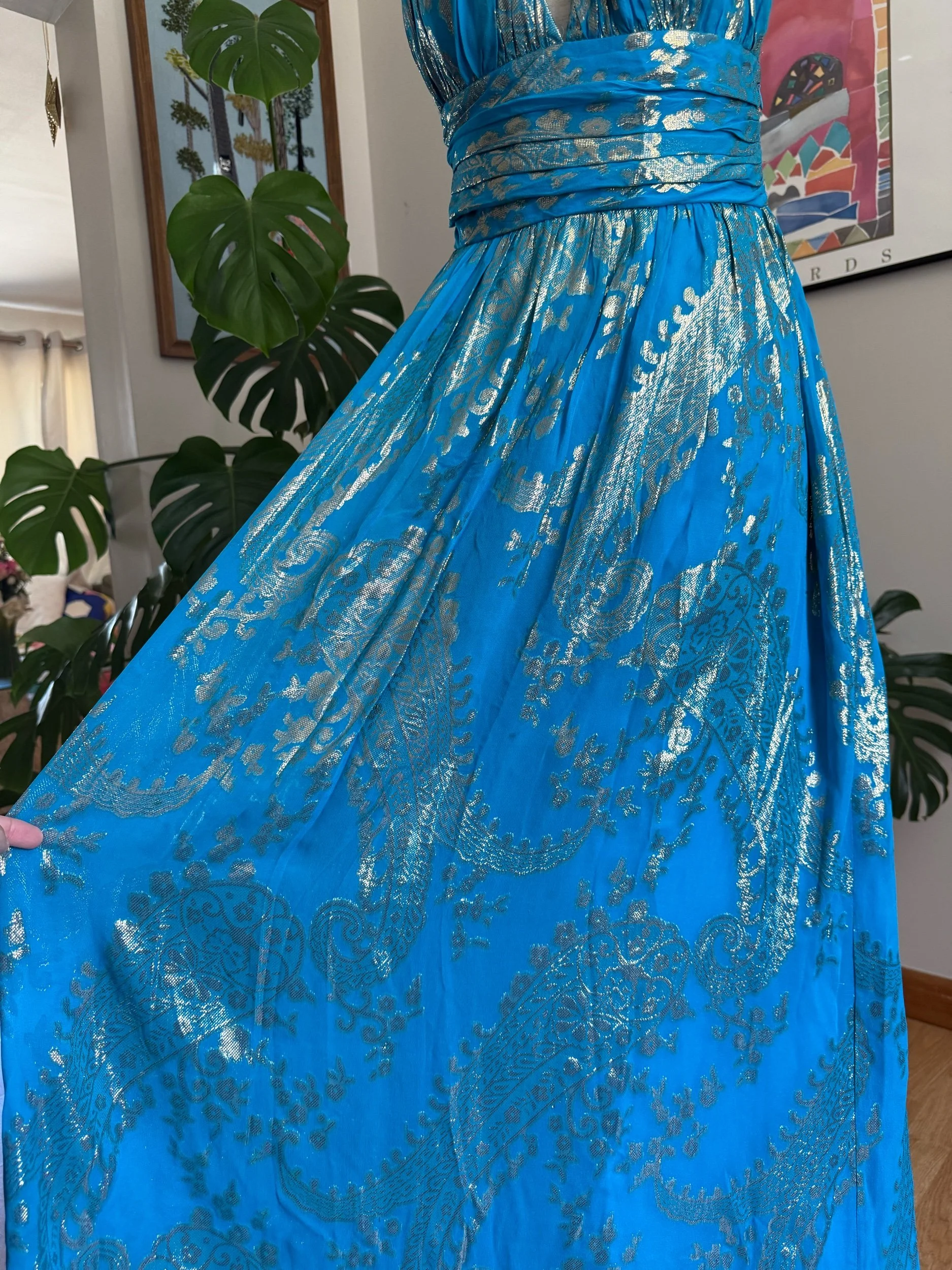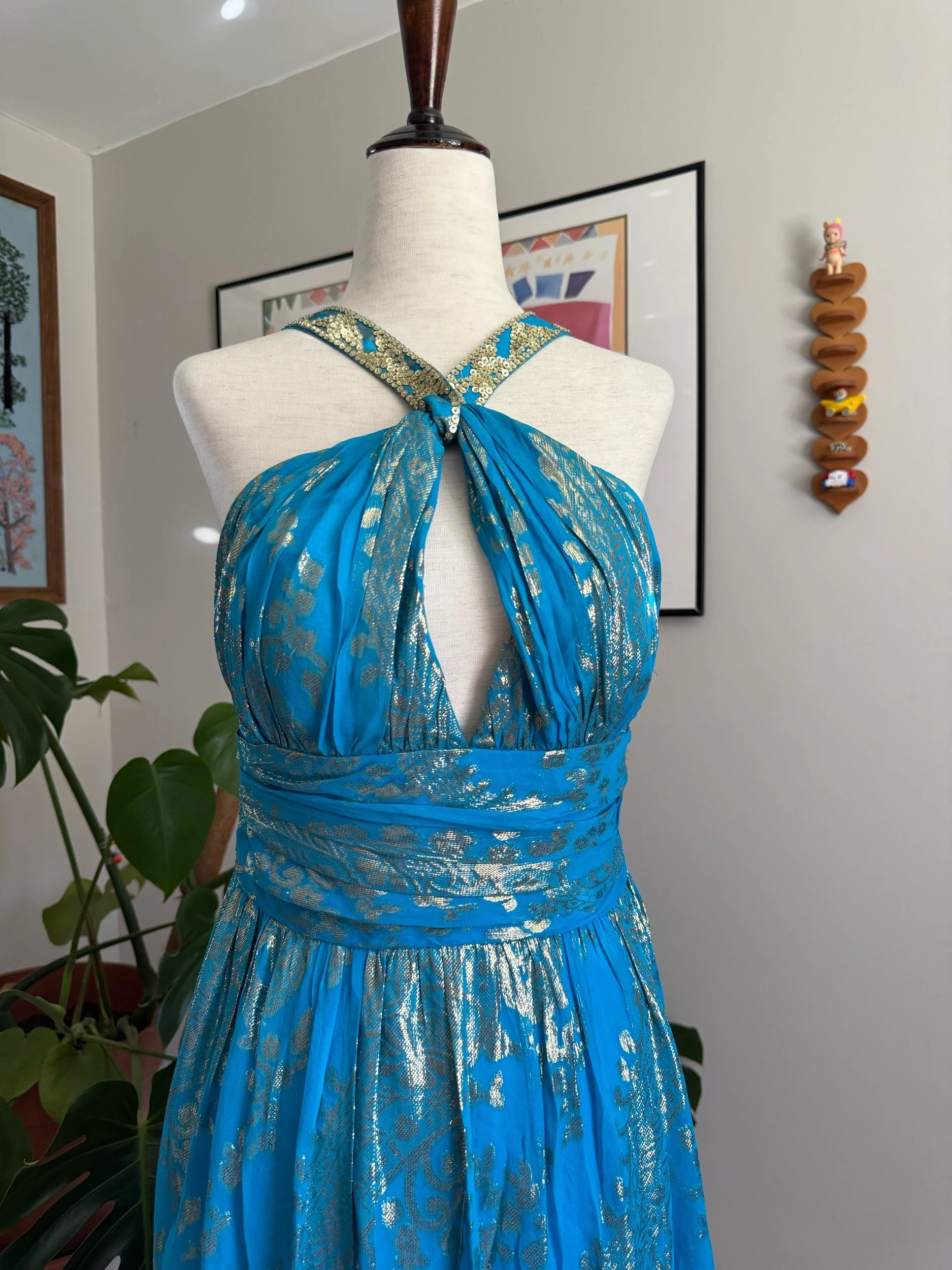 Beautiful shimmering & shining gold and blue dress, with beaded straps, and flowy bottom. This beauty has a side zipper closure