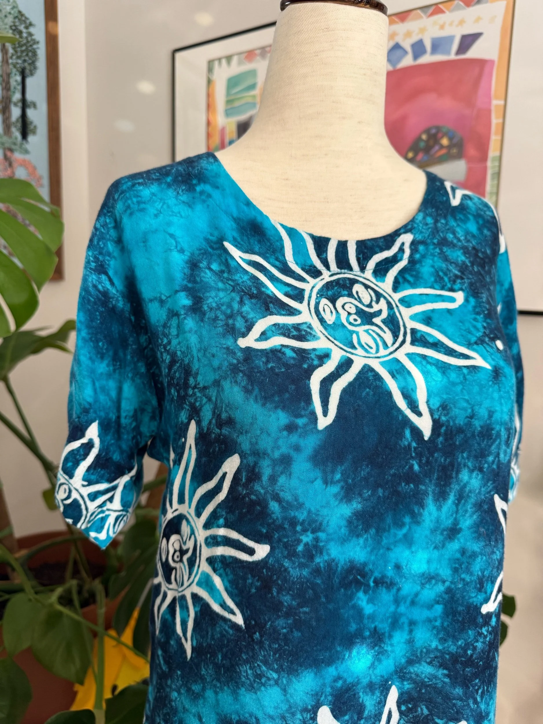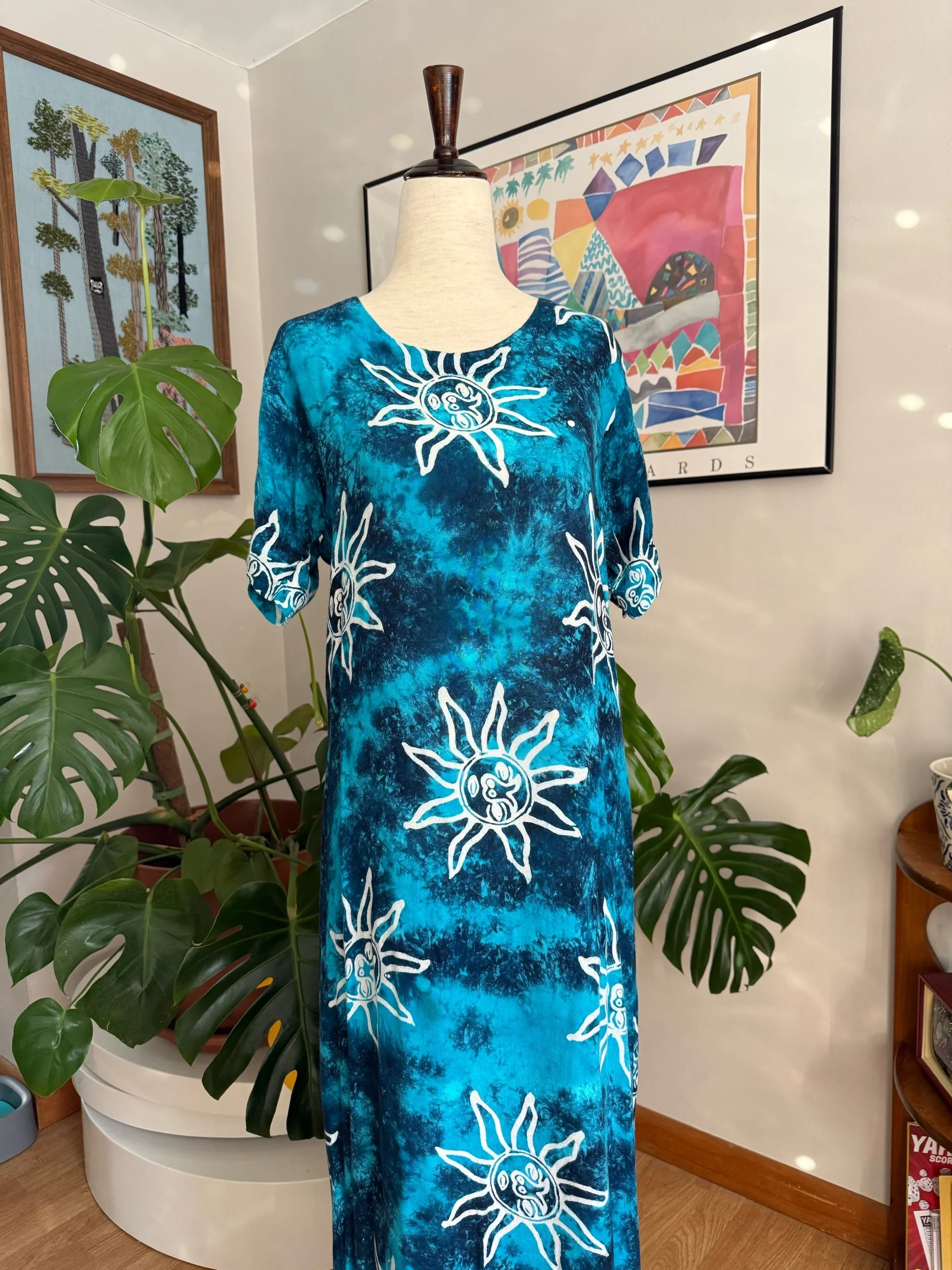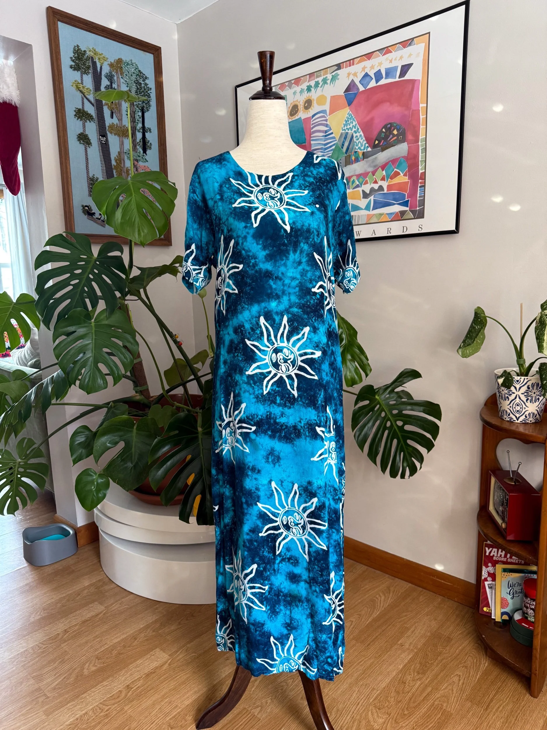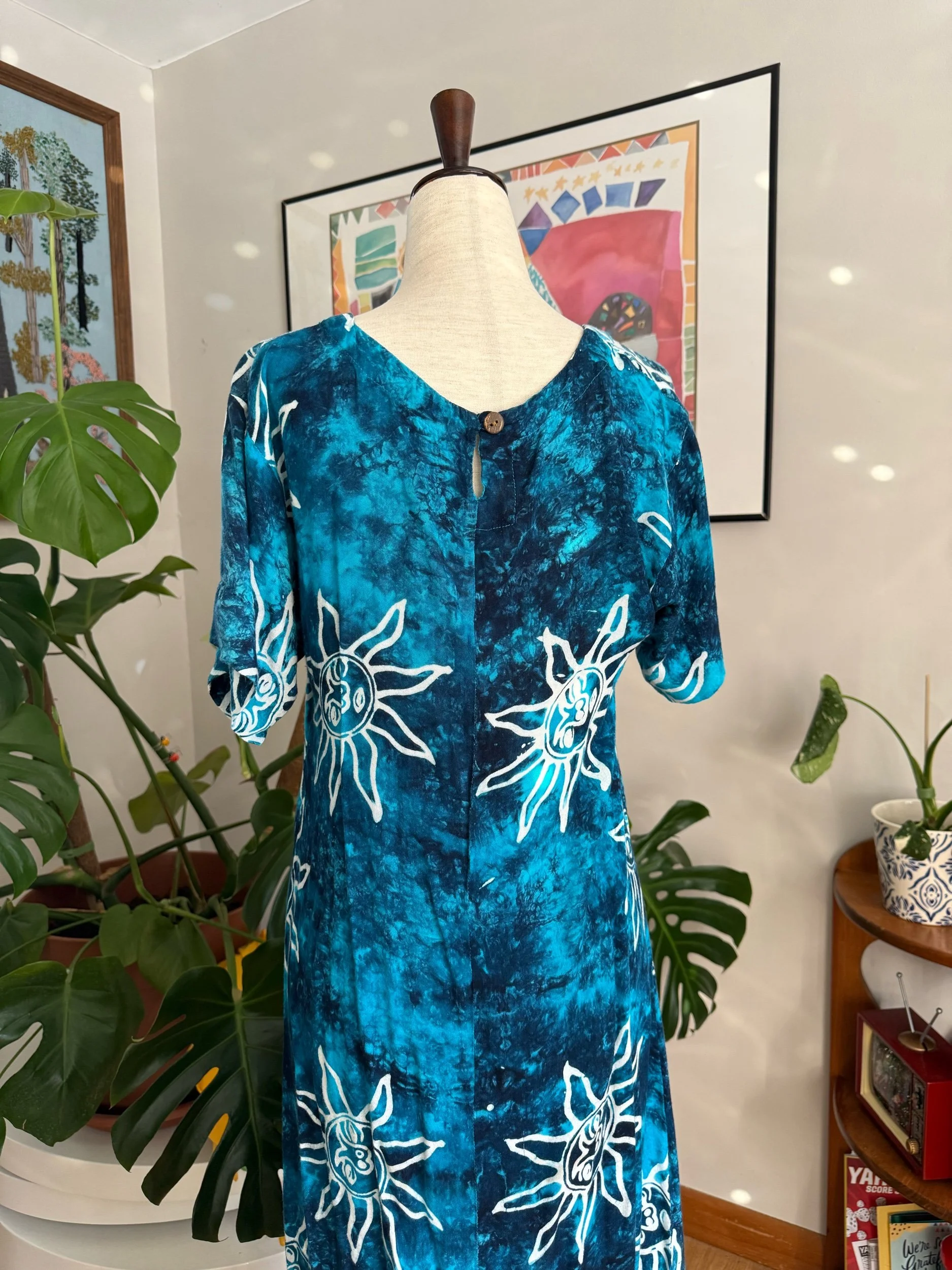 stunning vibrant blue vintage celestial dress :) has button closure at the back of the neck