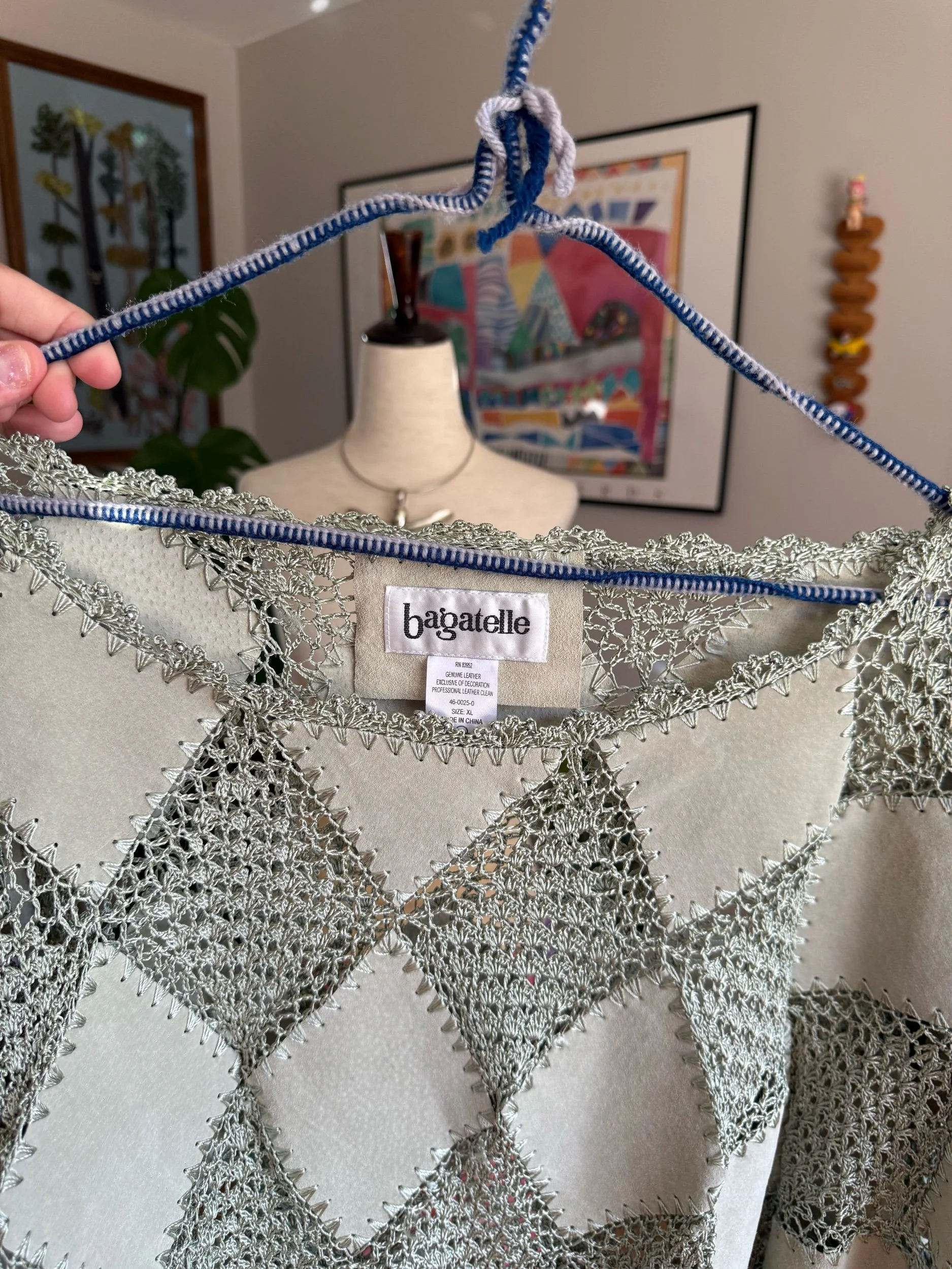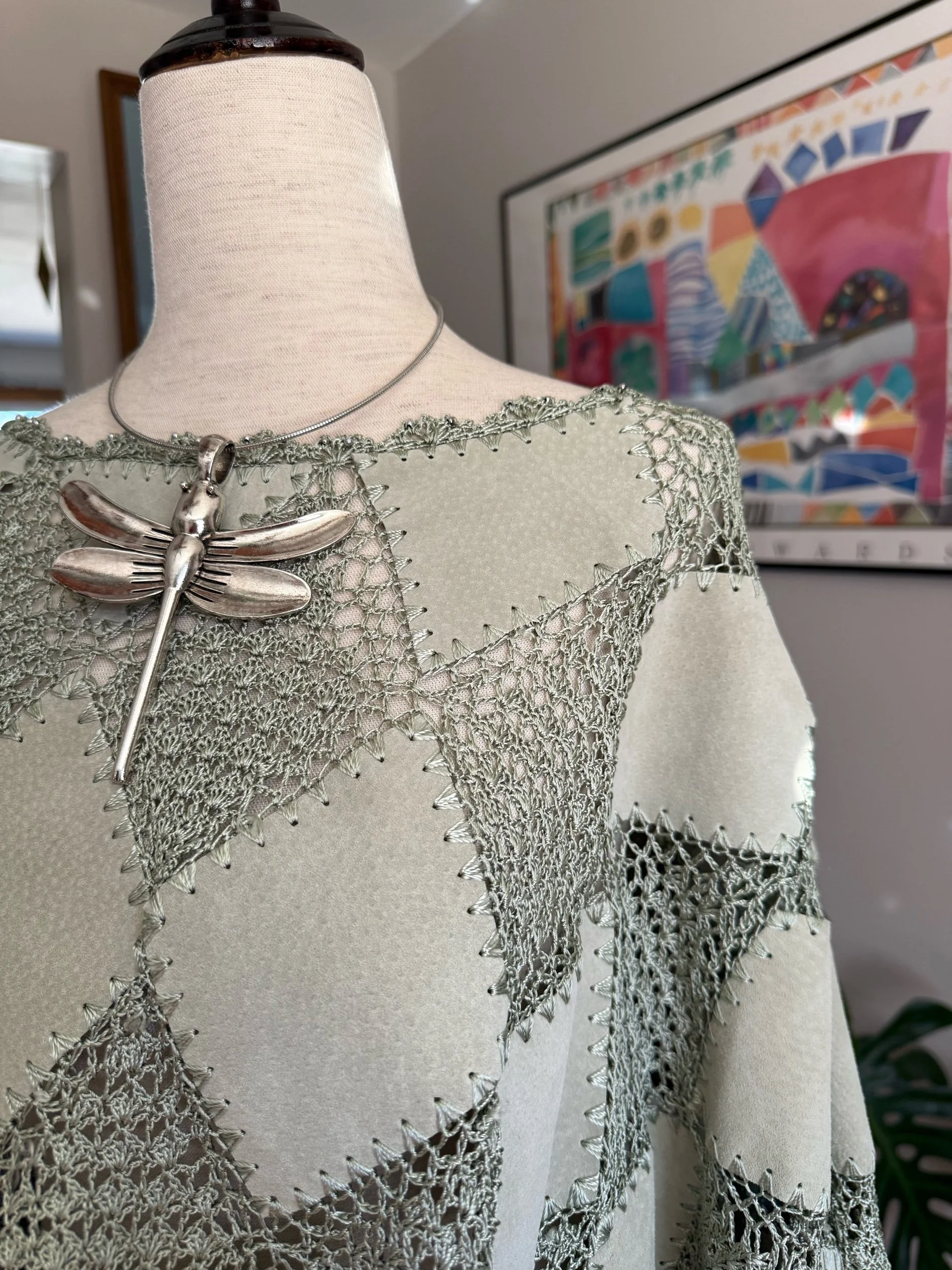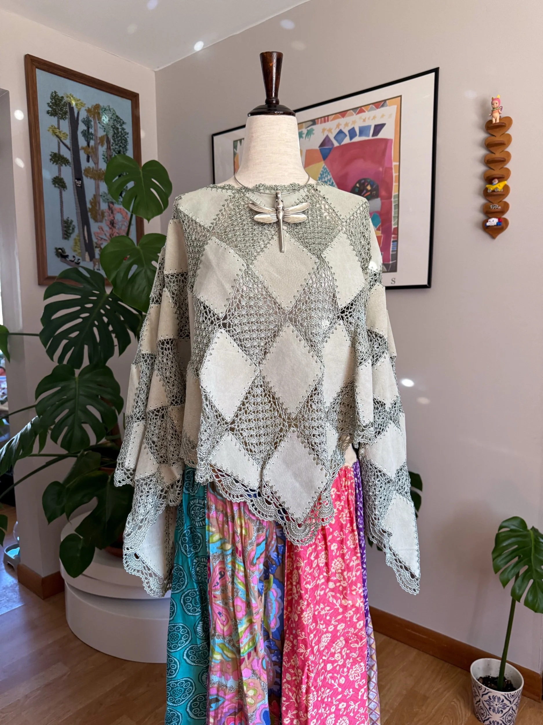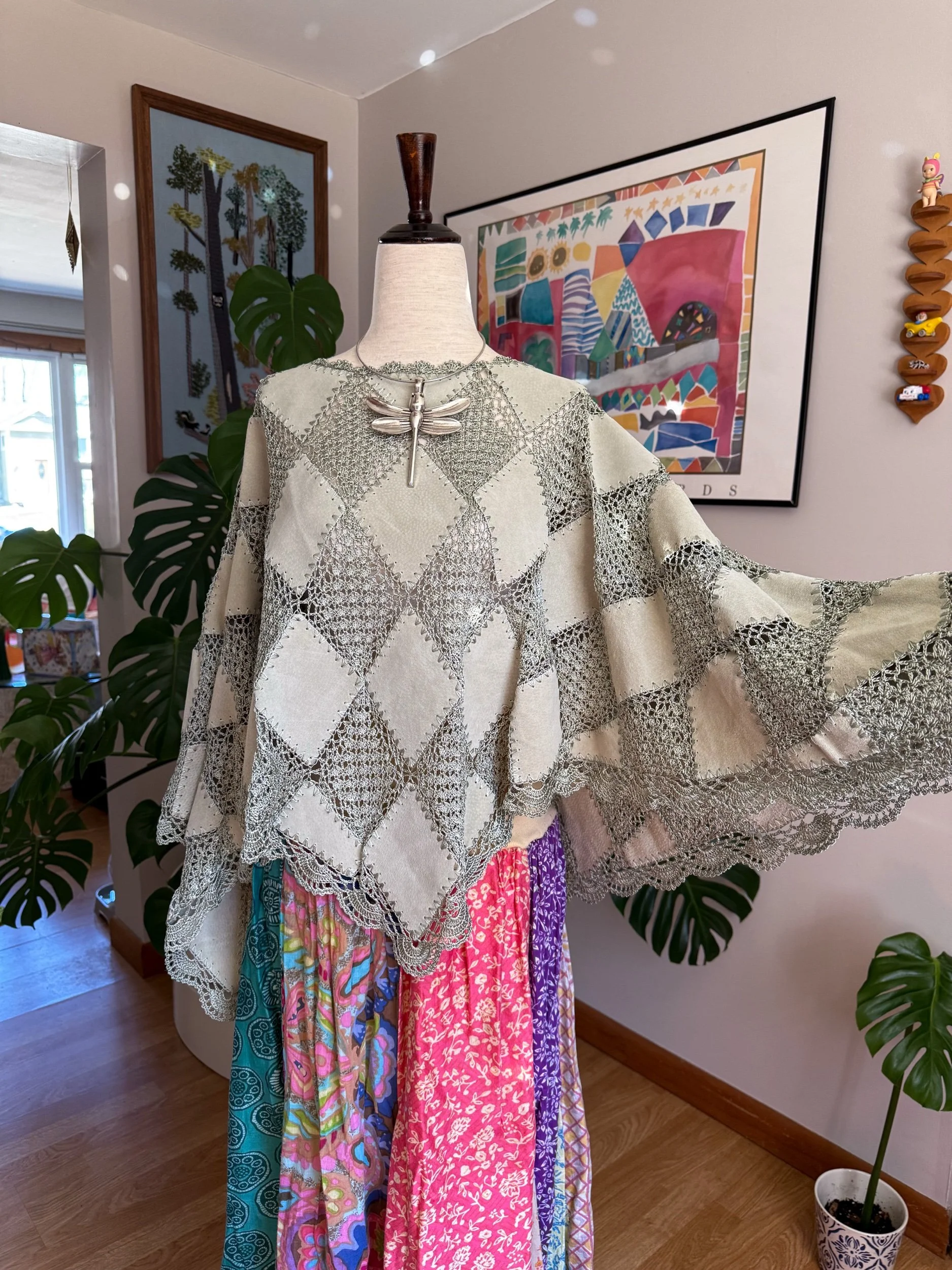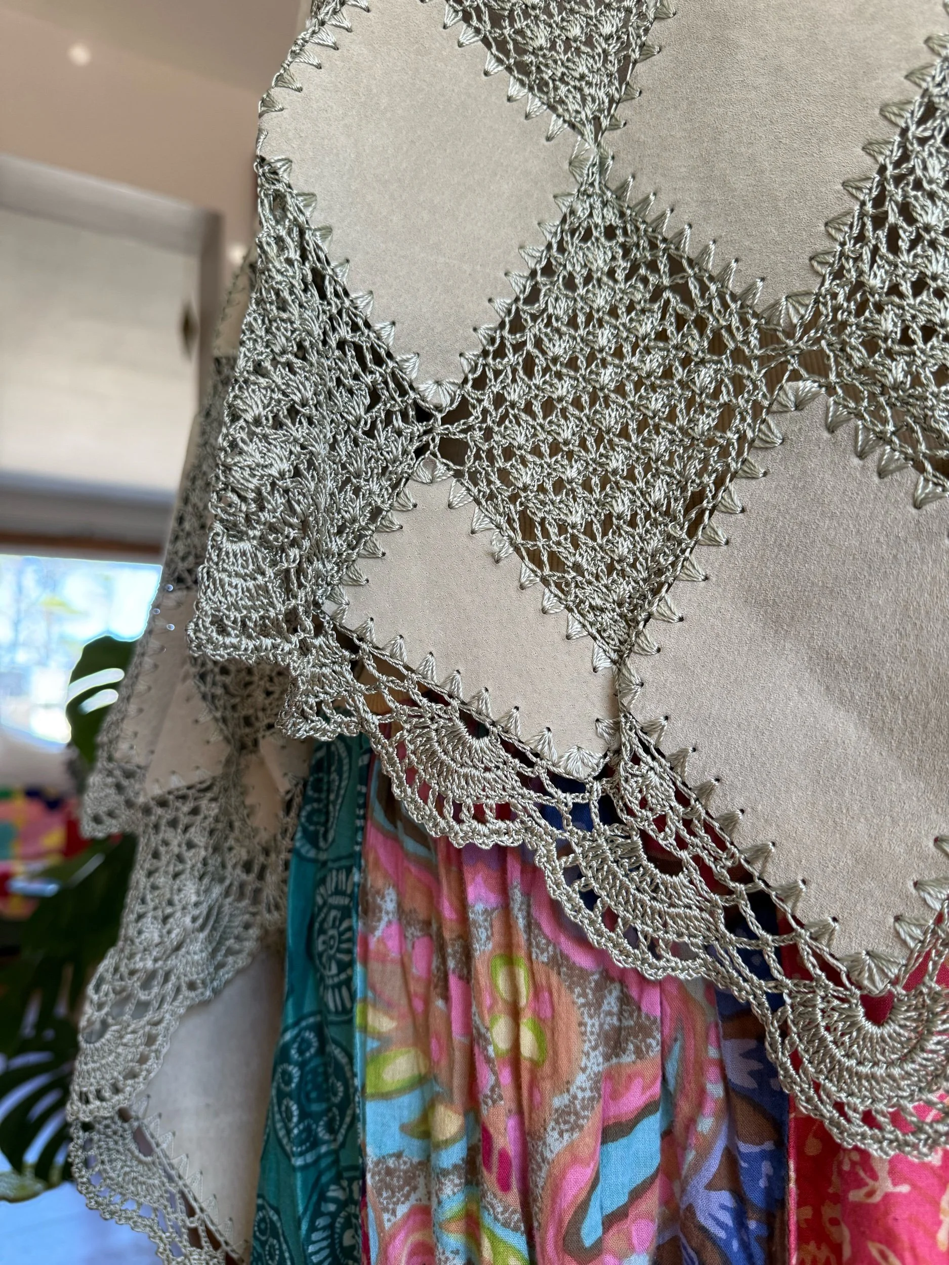 truly remarkable rare piece, a beautiful earthy green leather shawl with patchwork & crochet detailing