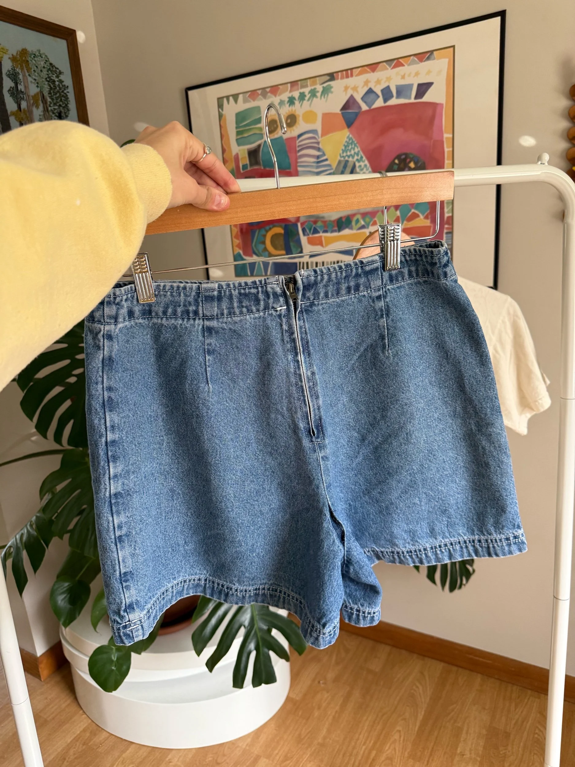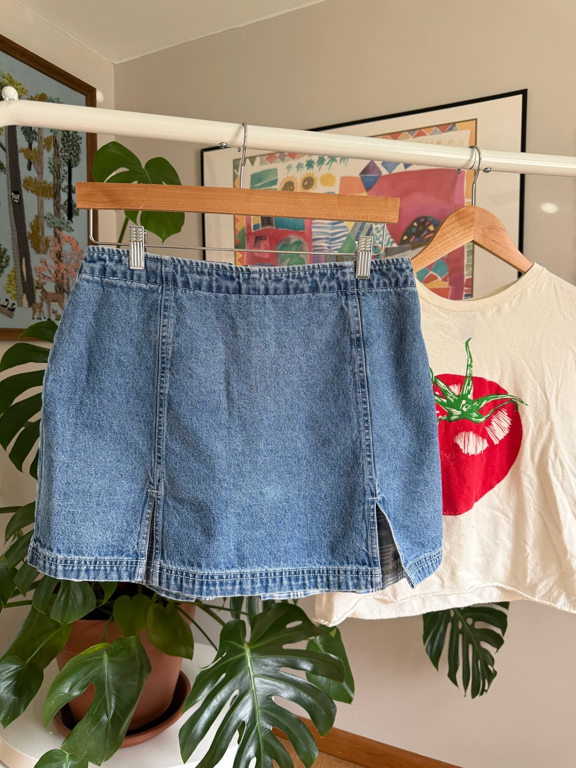 adorable denim skort with plaid under-layer, and zipper back :)