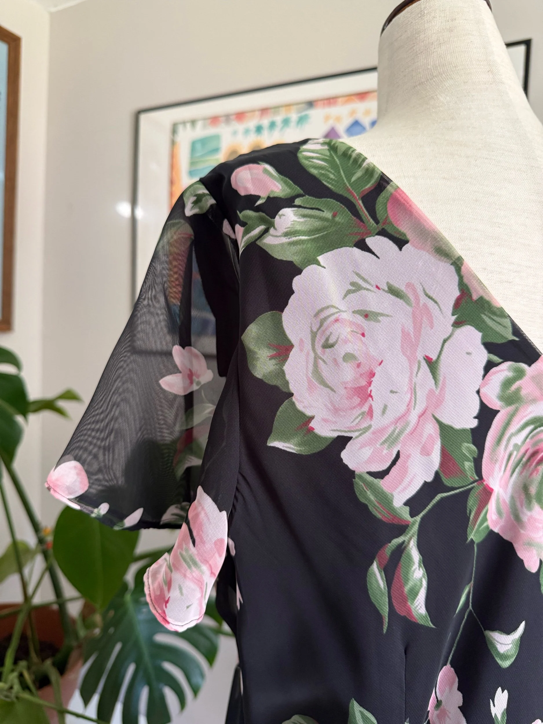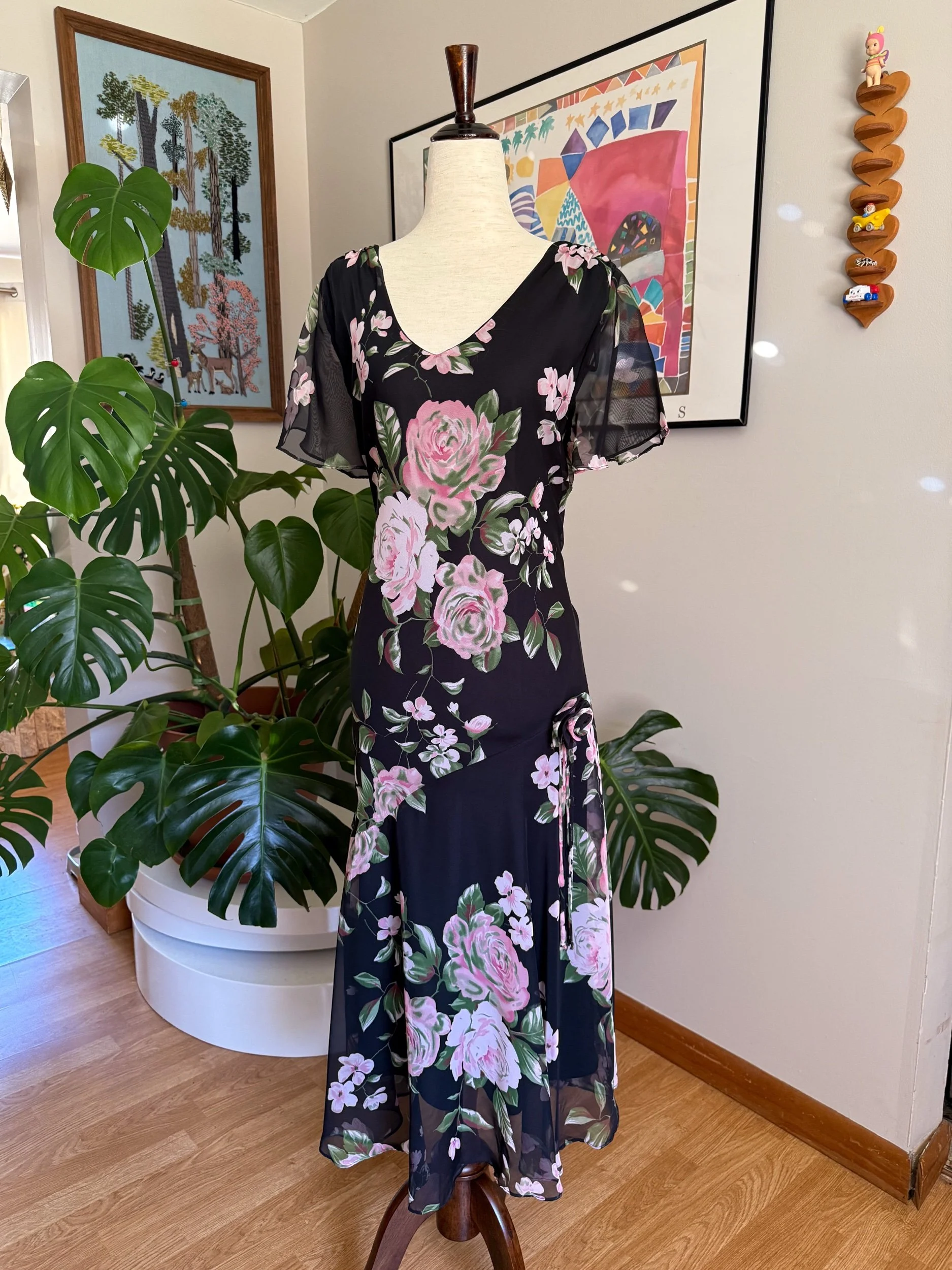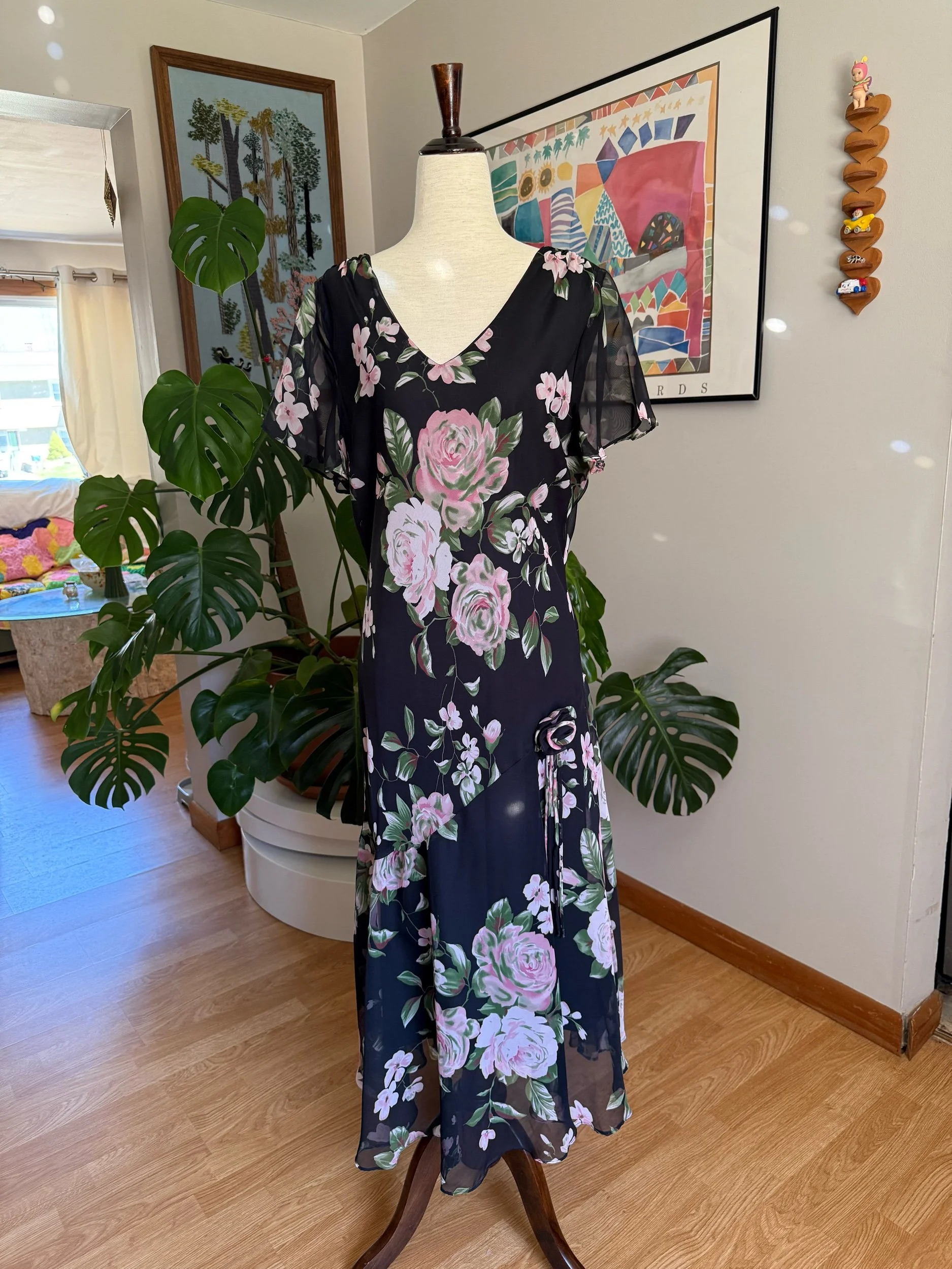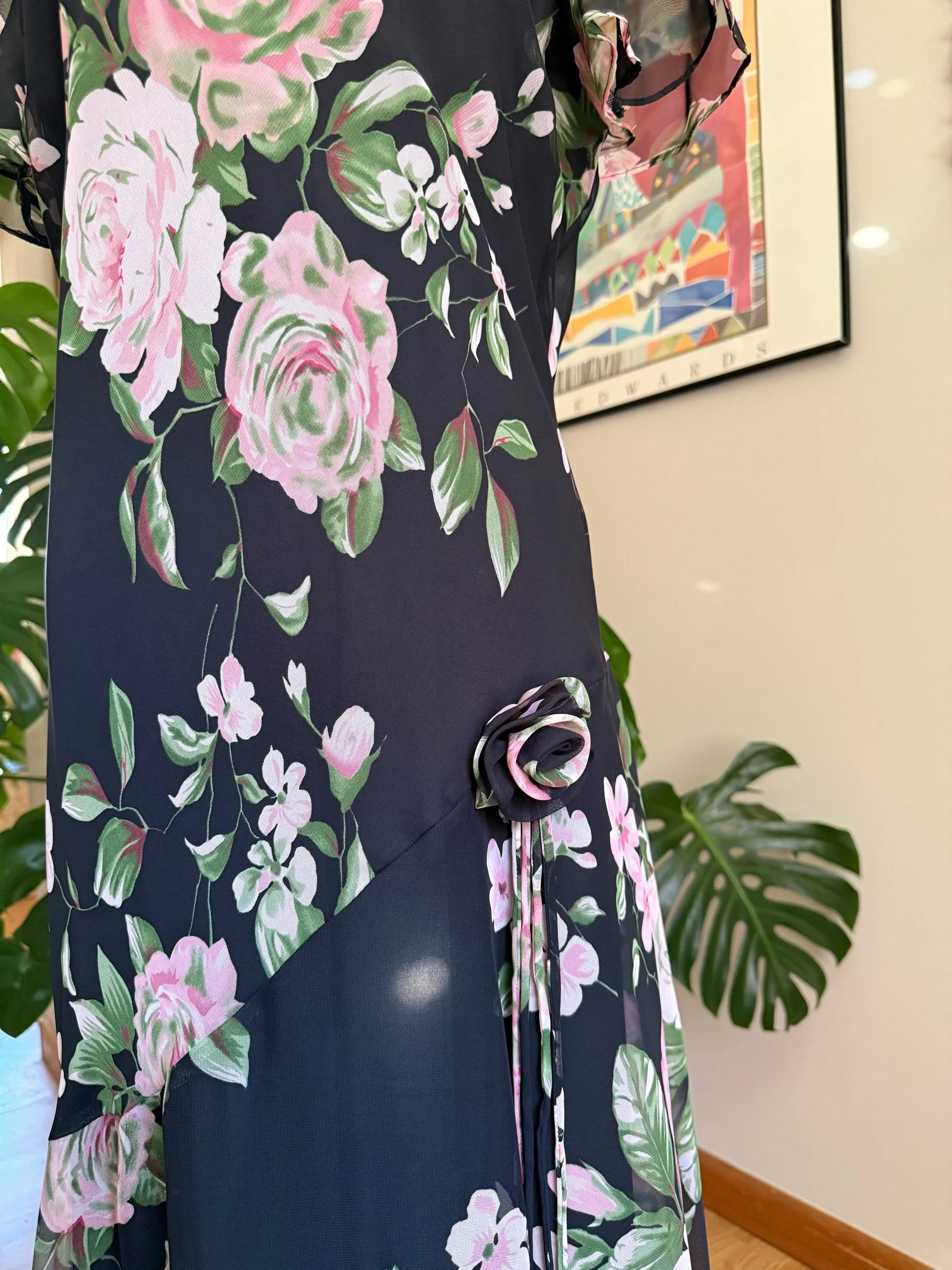 Beautiful & lightweight black flowy dress, with large rosette, and ruffle hem