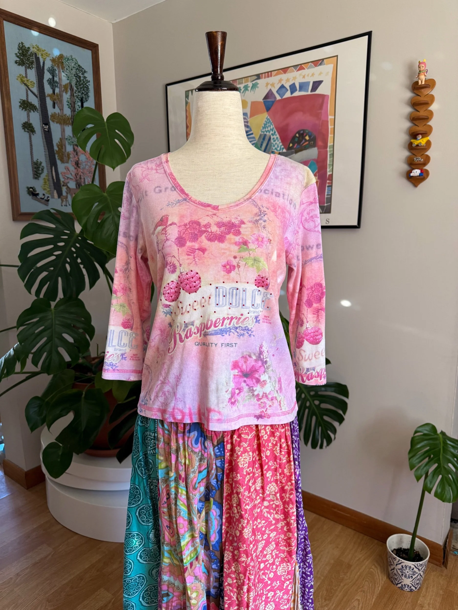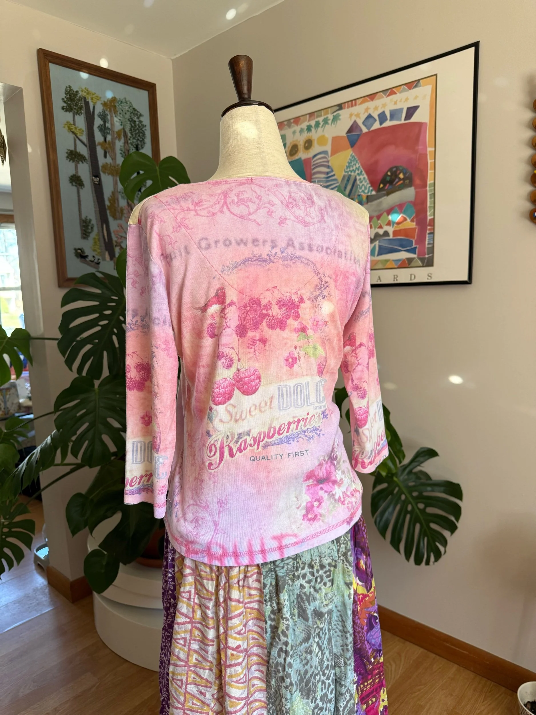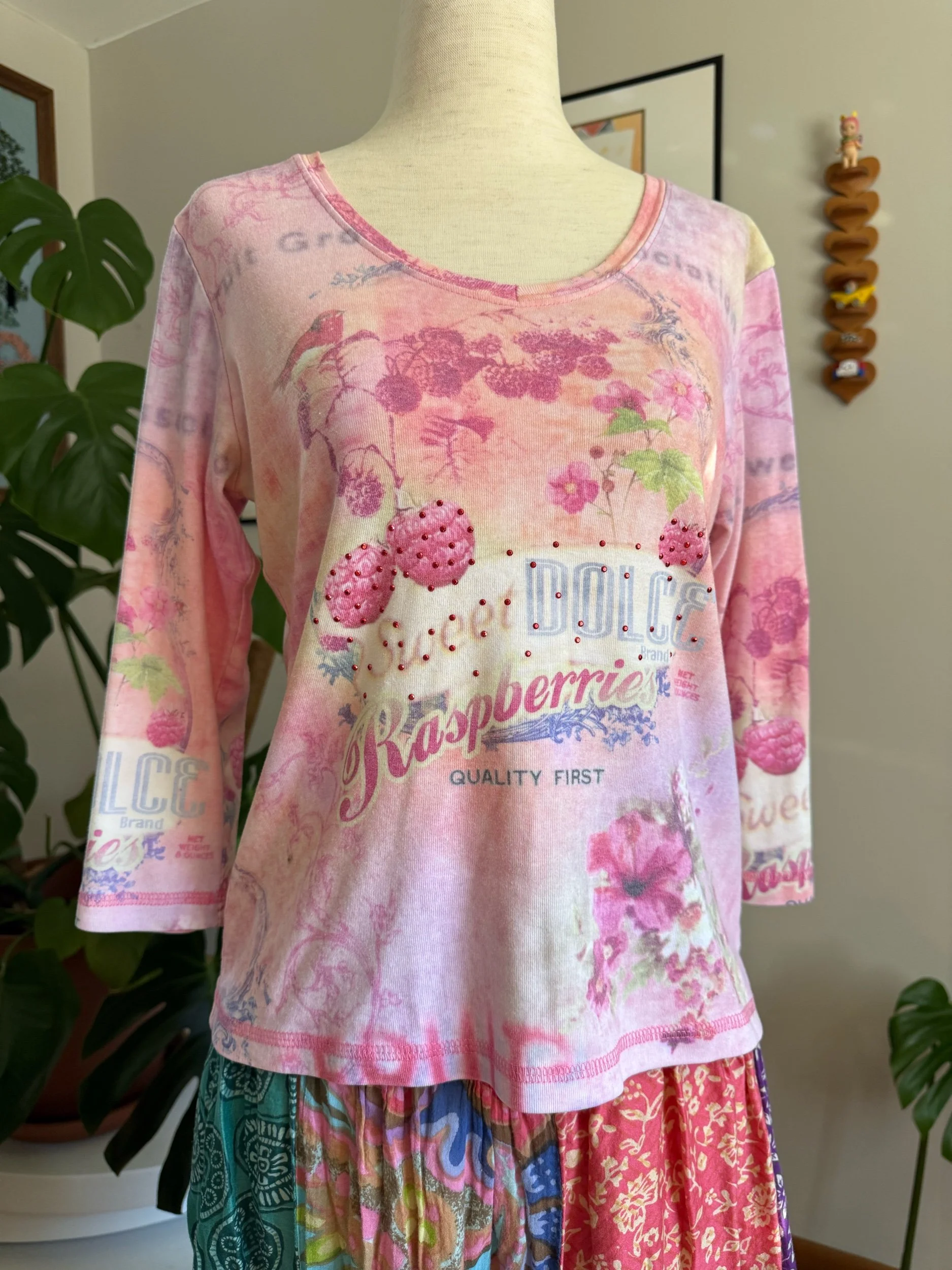 one of my favorite tops I’ve come across! I love the colors, the collage-like print, and the little beading on the raspberries hehe :)
