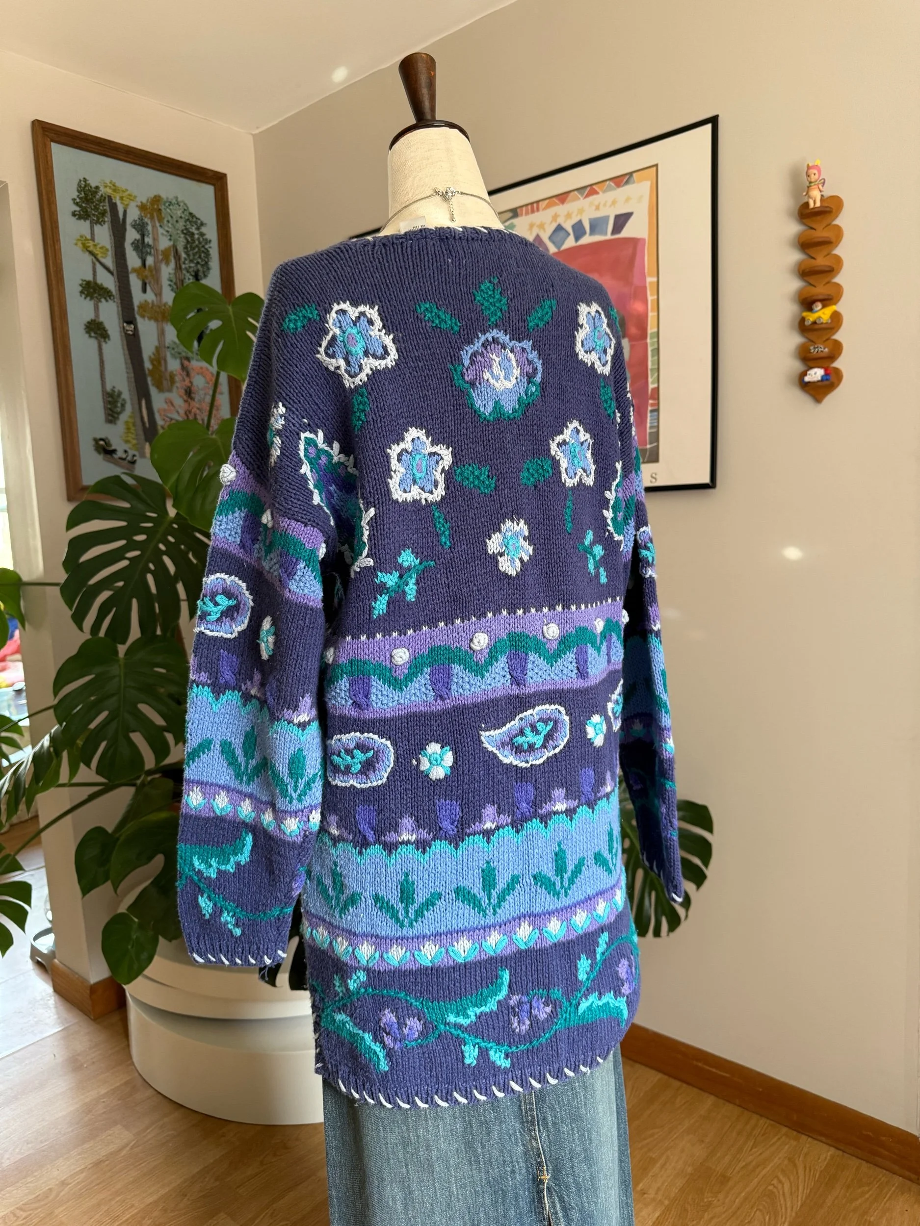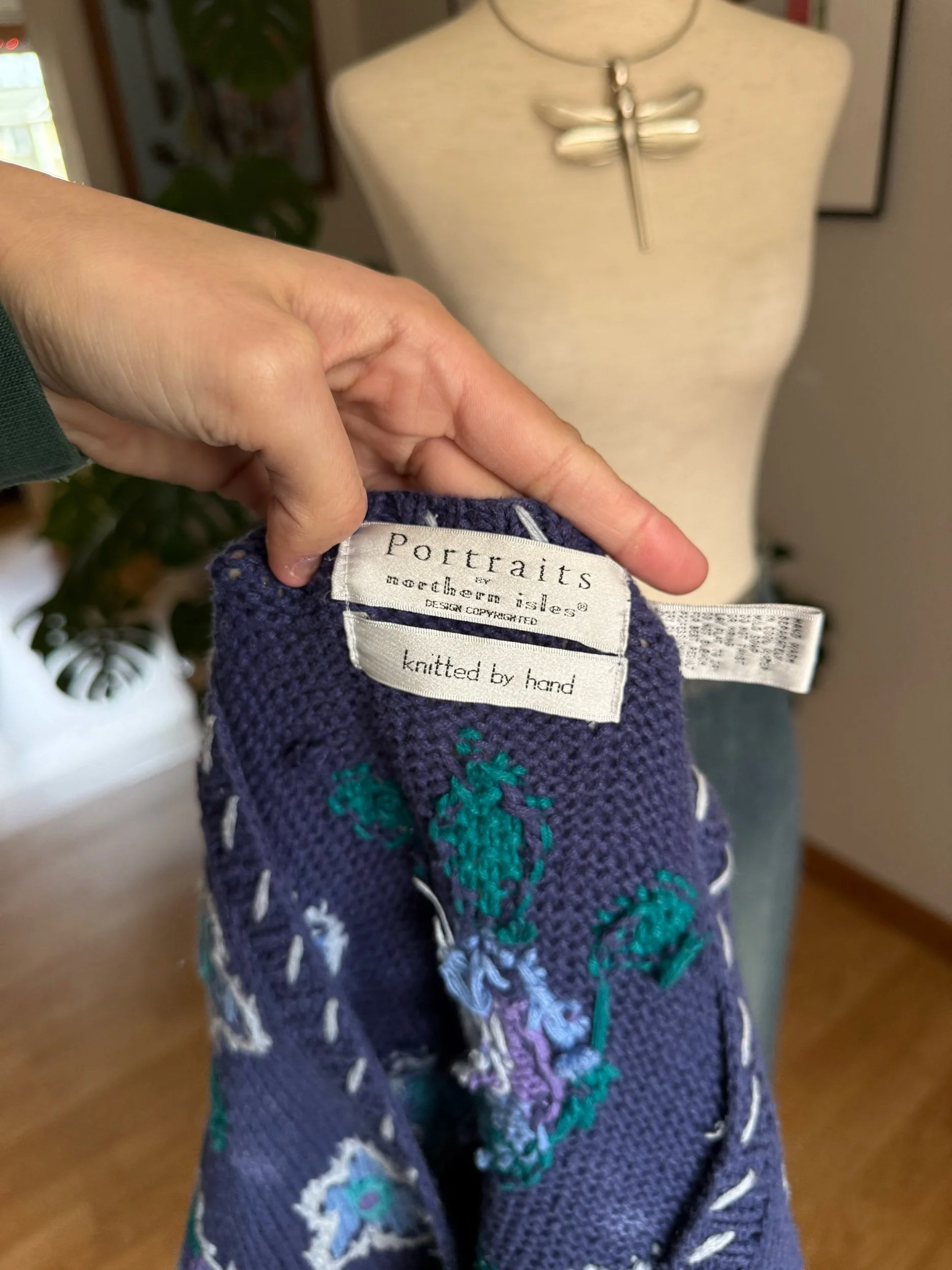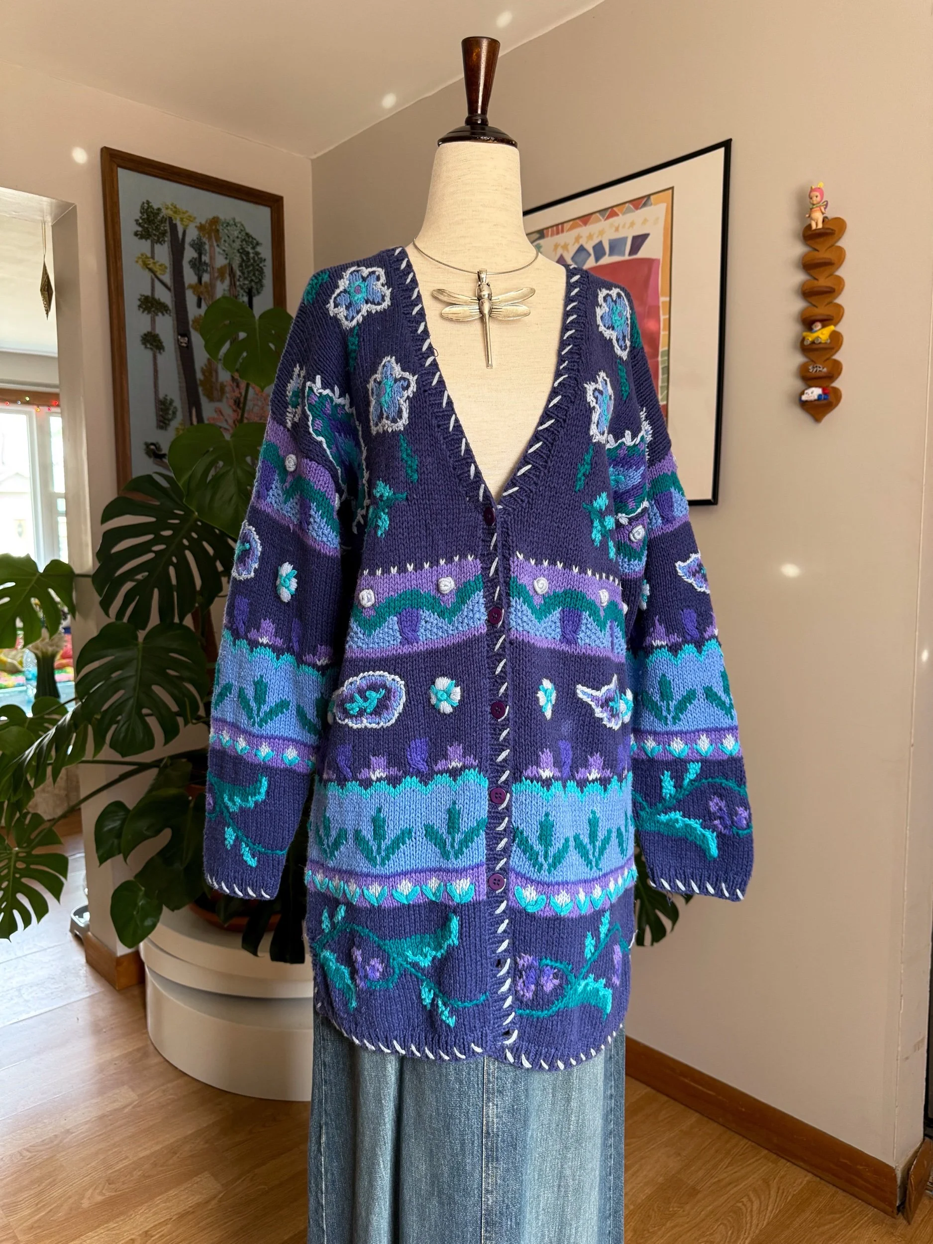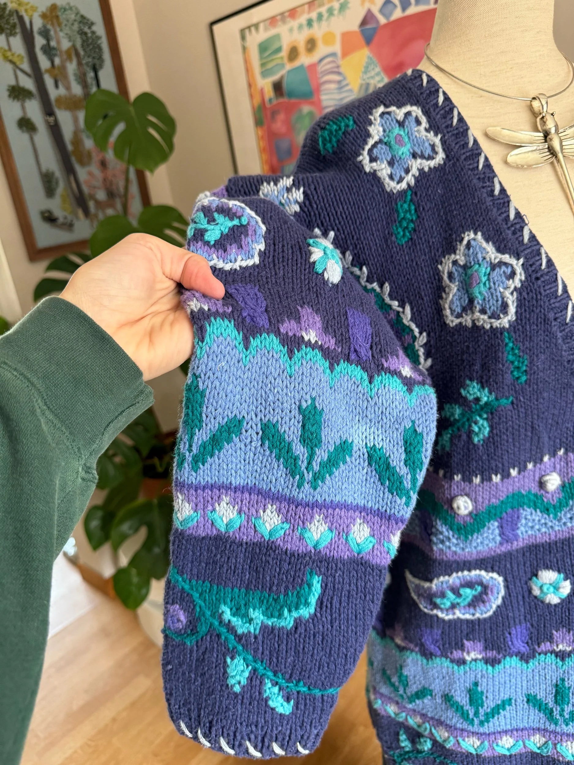 truly beautiful thick vintage knit cardigan, with details everywhere! I adore the color palette of this, and all the beautiful parts and embroidery details of this