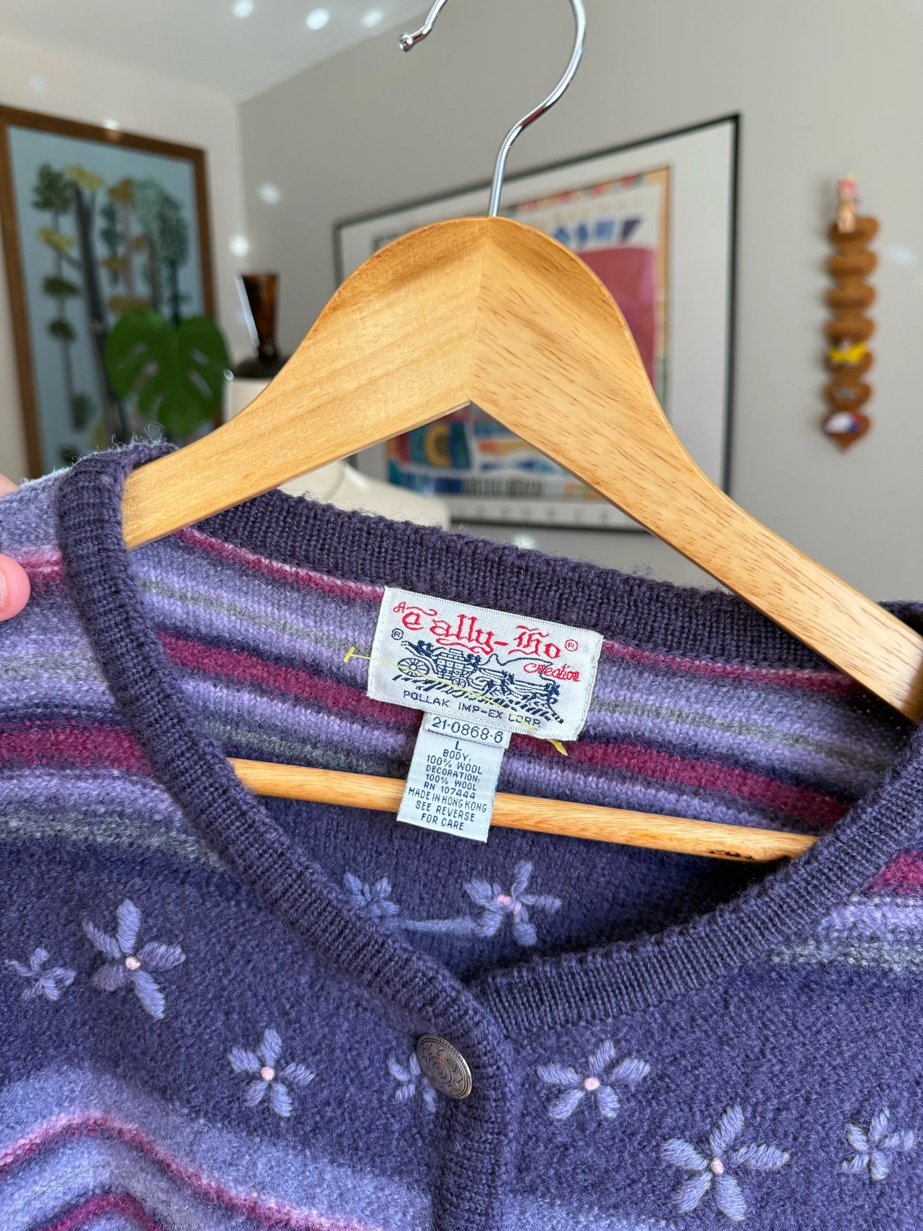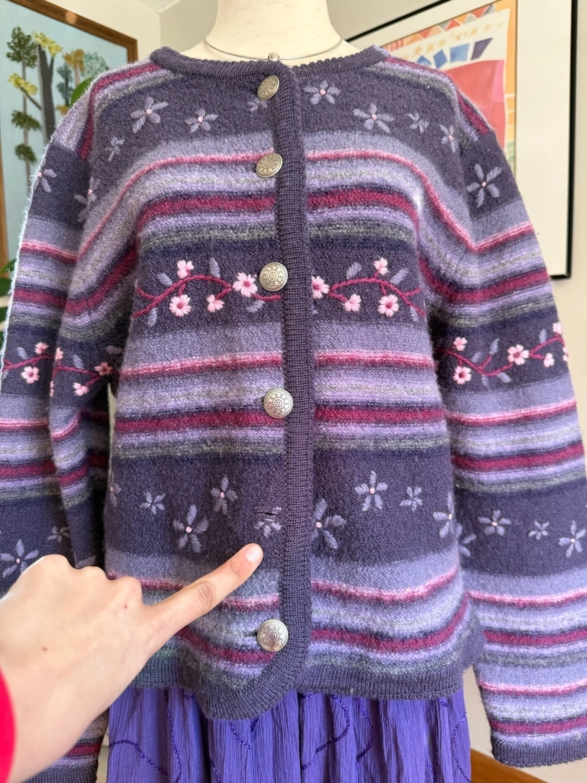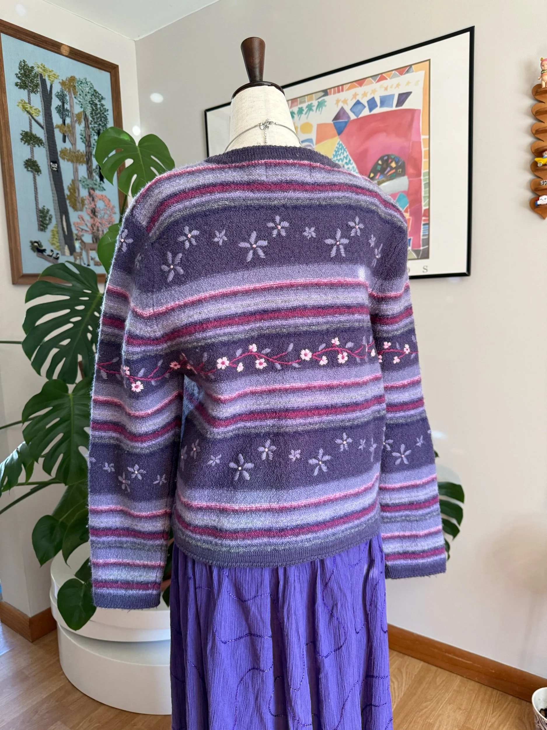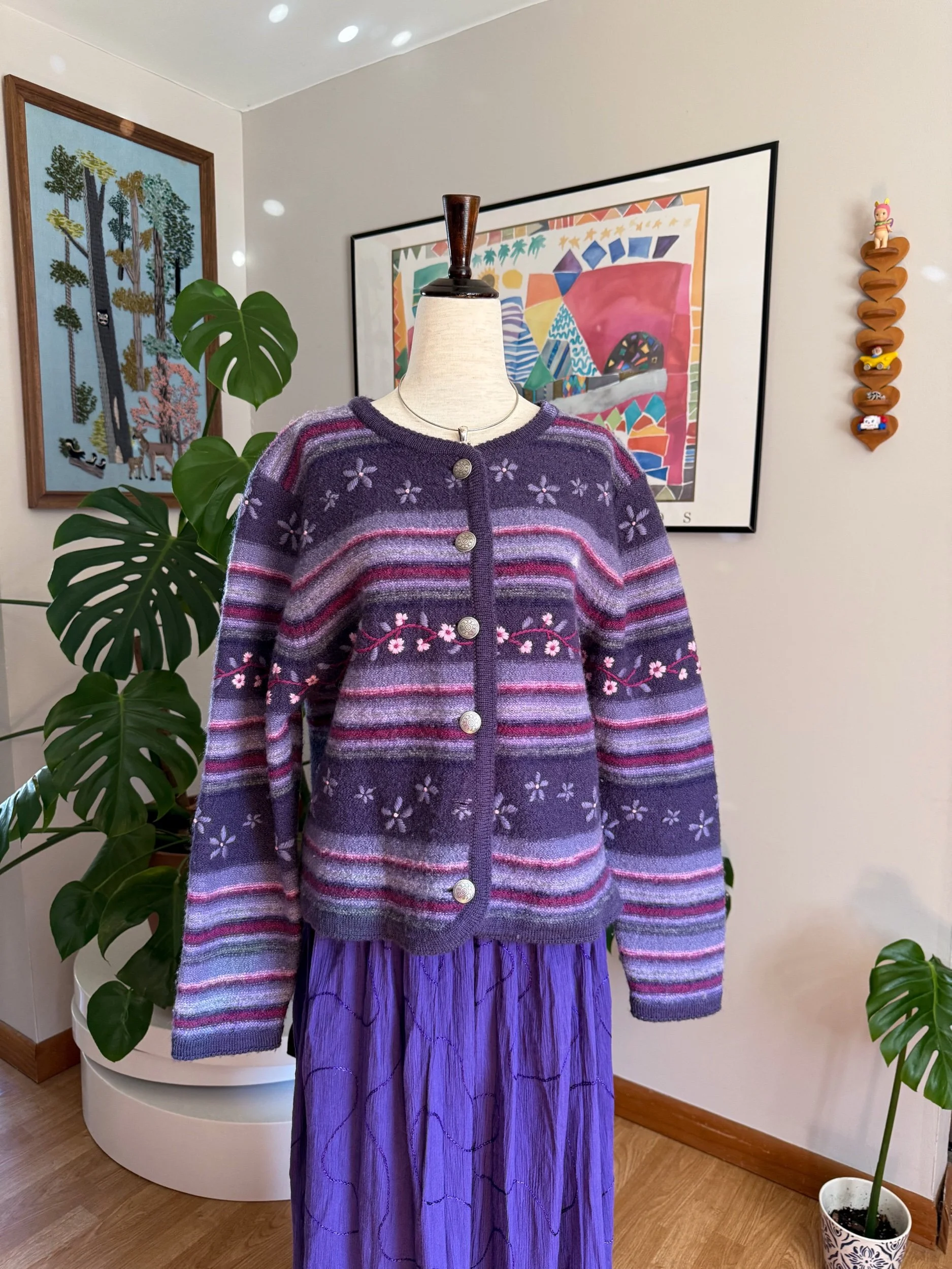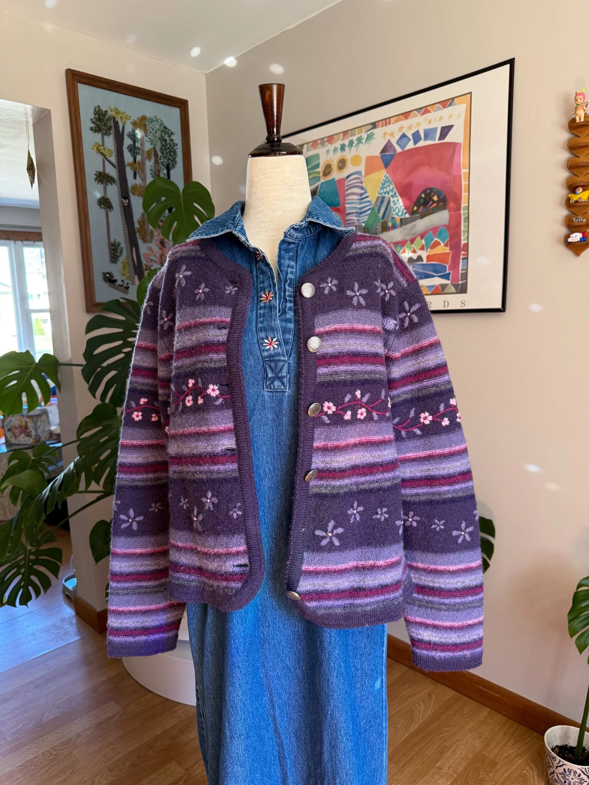 beautiful warm purple button cardigan, with floral embroidery throughout :)