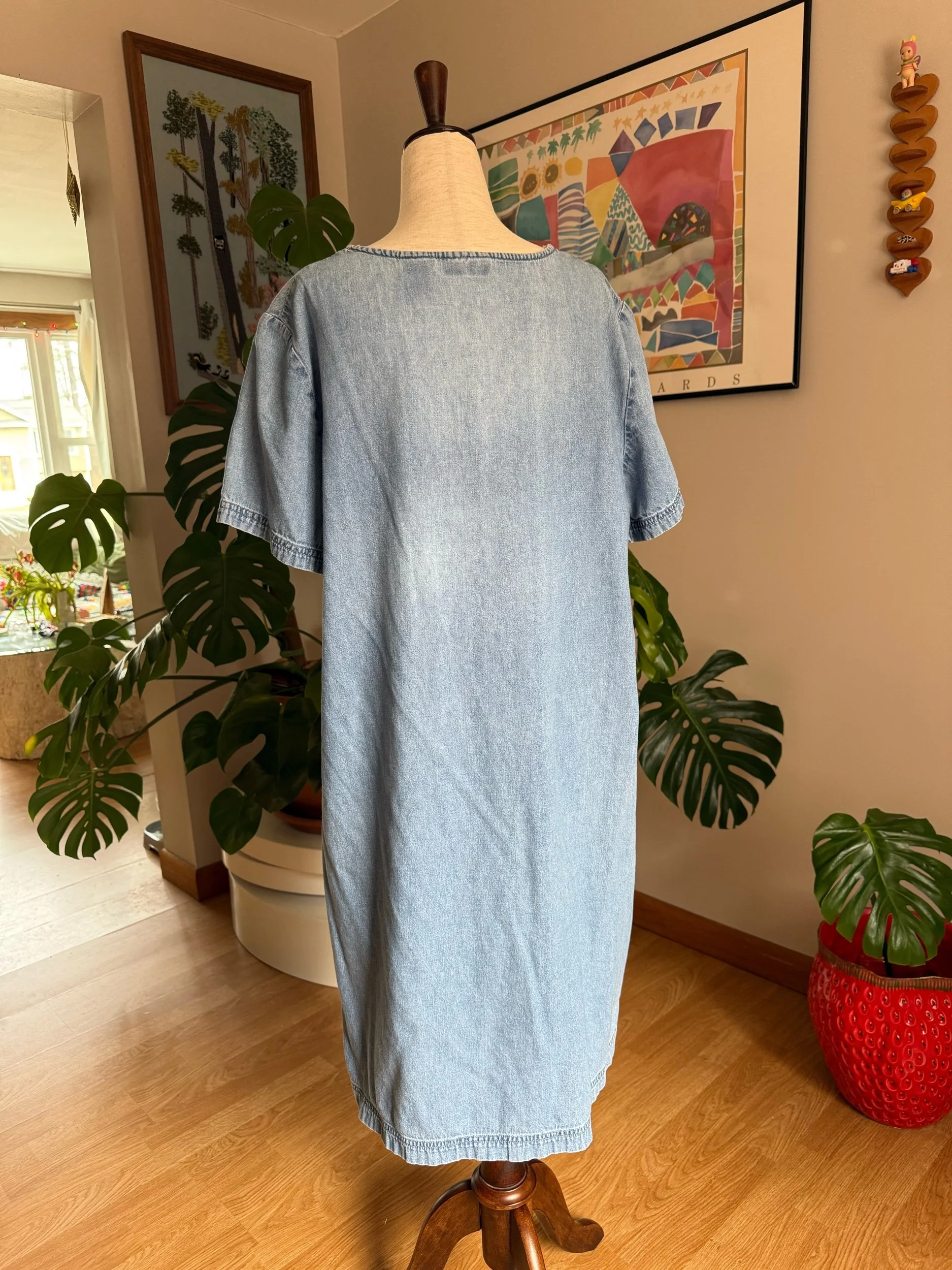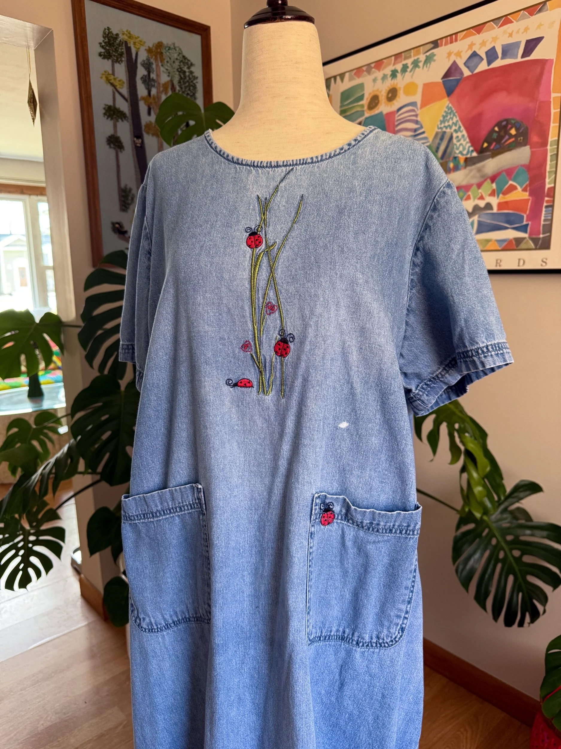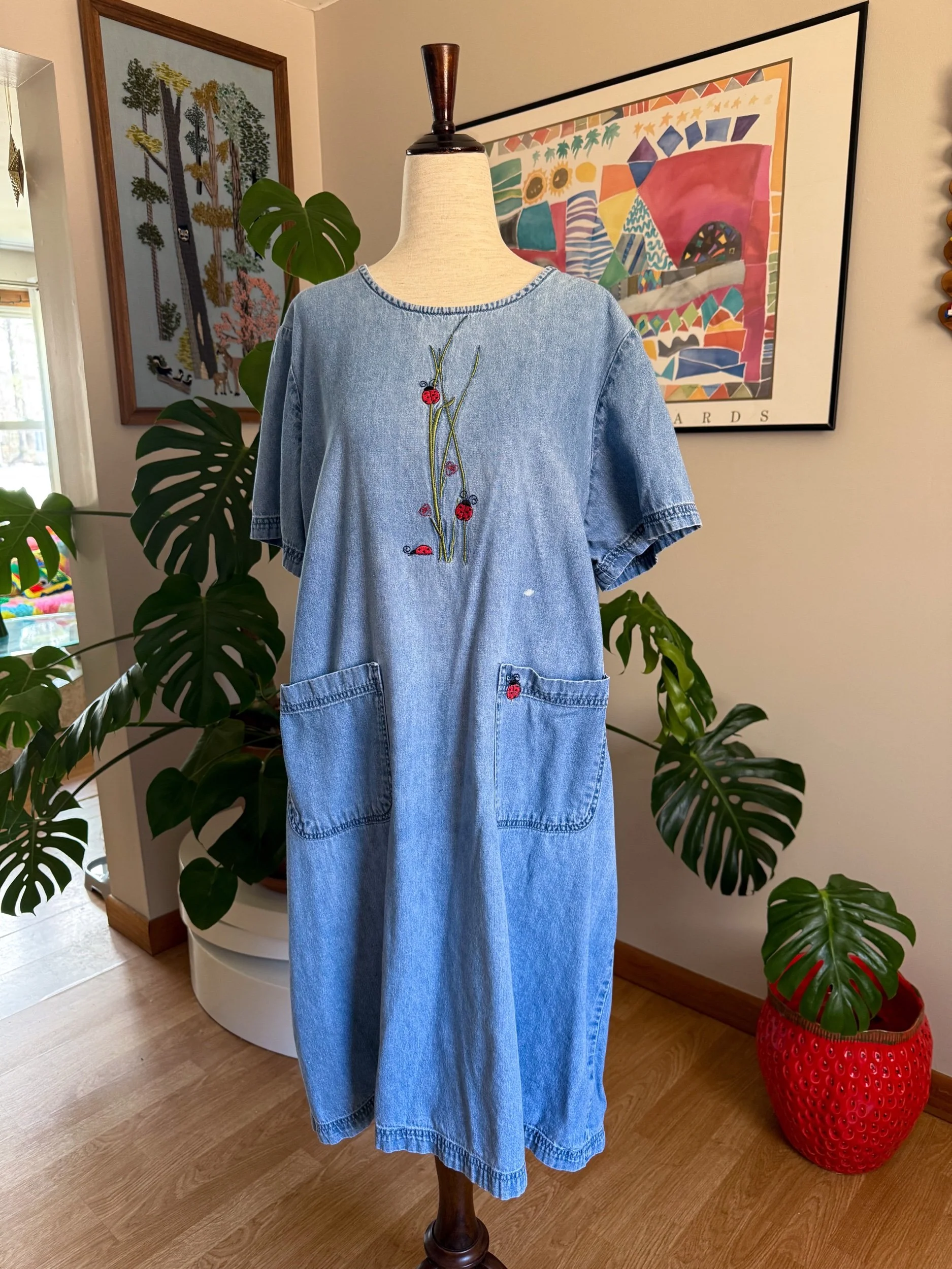 the sweetest vintage denim dress with pockets & embroidery little ladybugs!
