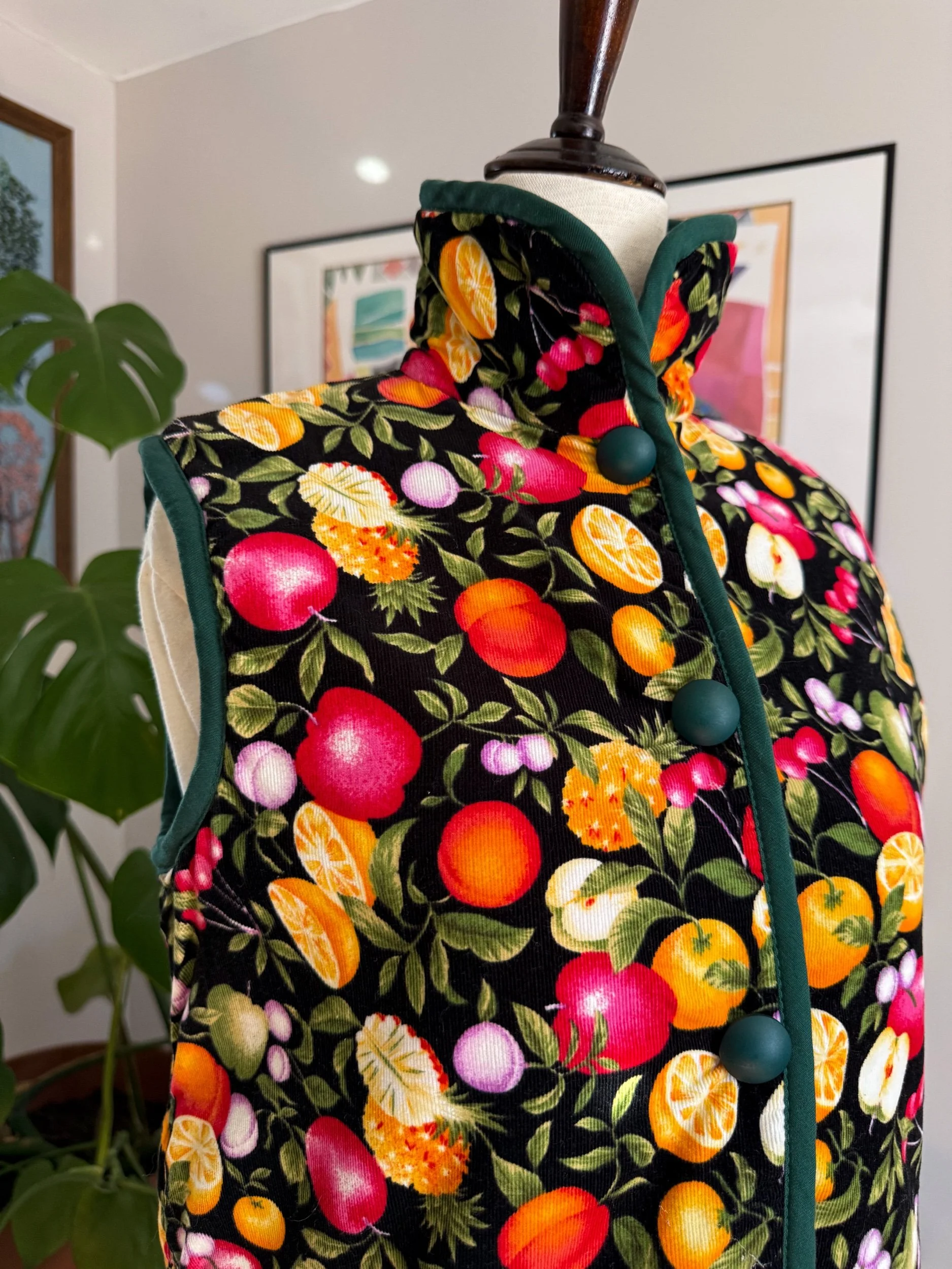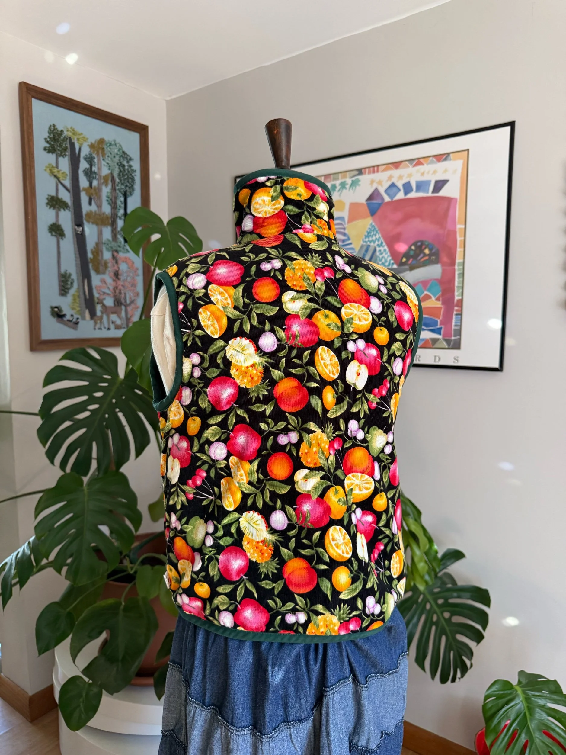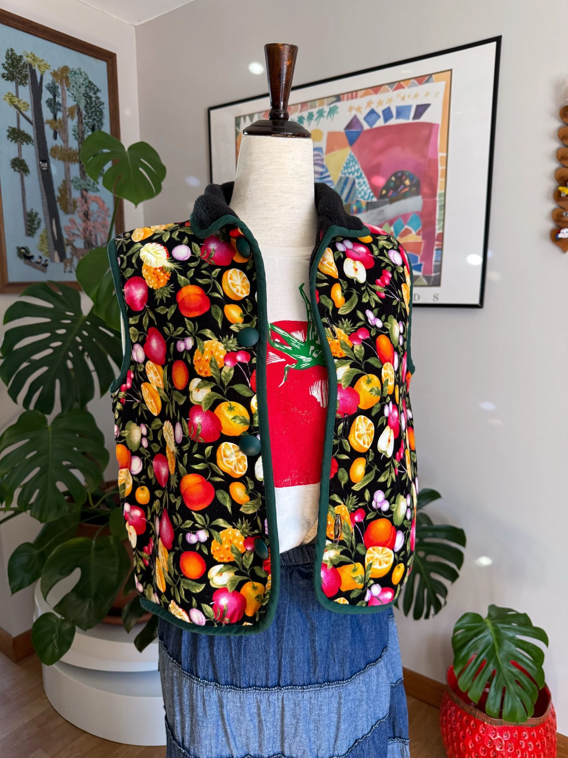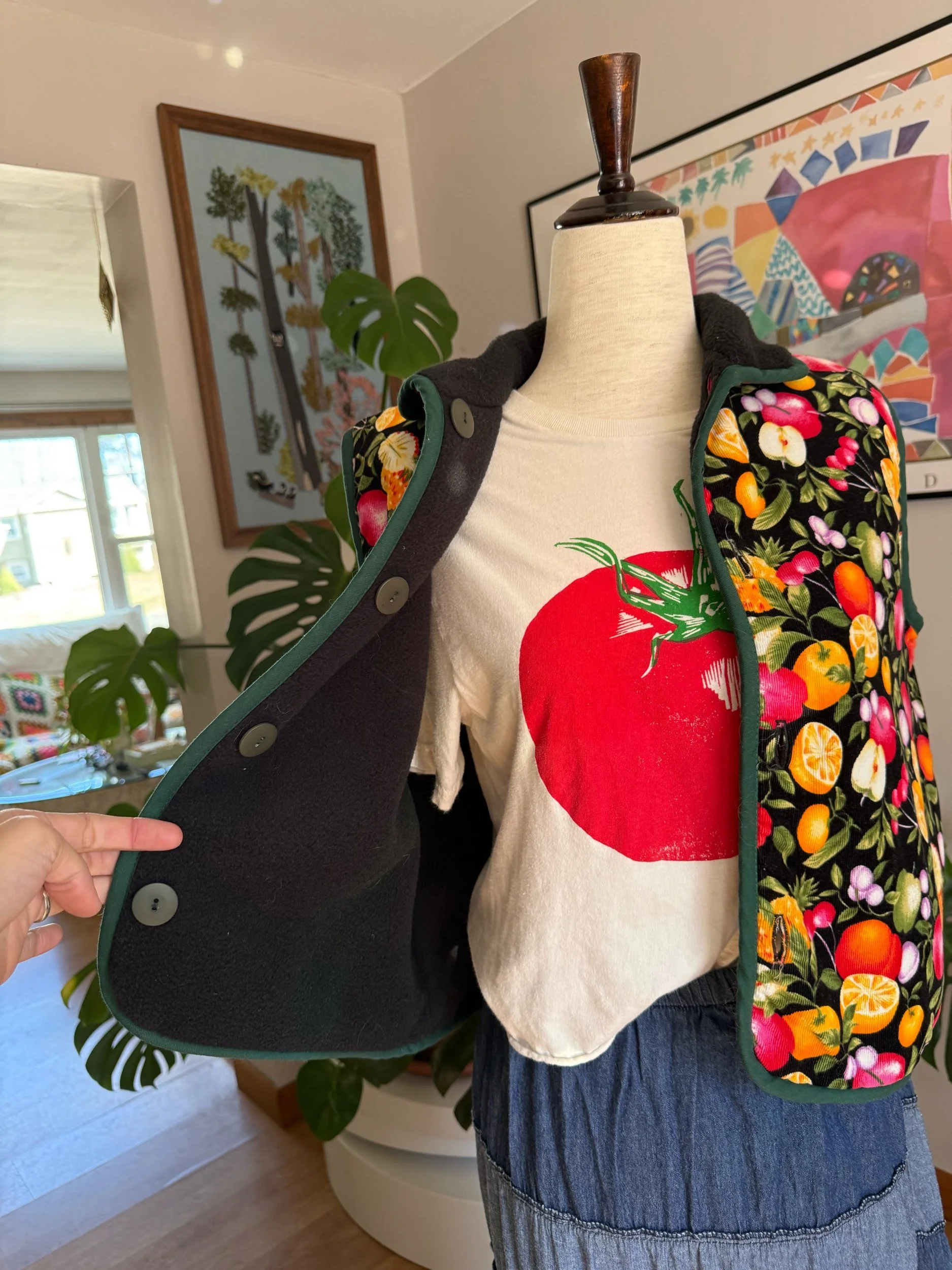 you guys!!!! I literally cannot get over this piece! Not only does it have the cutest vibrant fruit print, but it’s reversible!! The inside is fleece black :) Has button closure