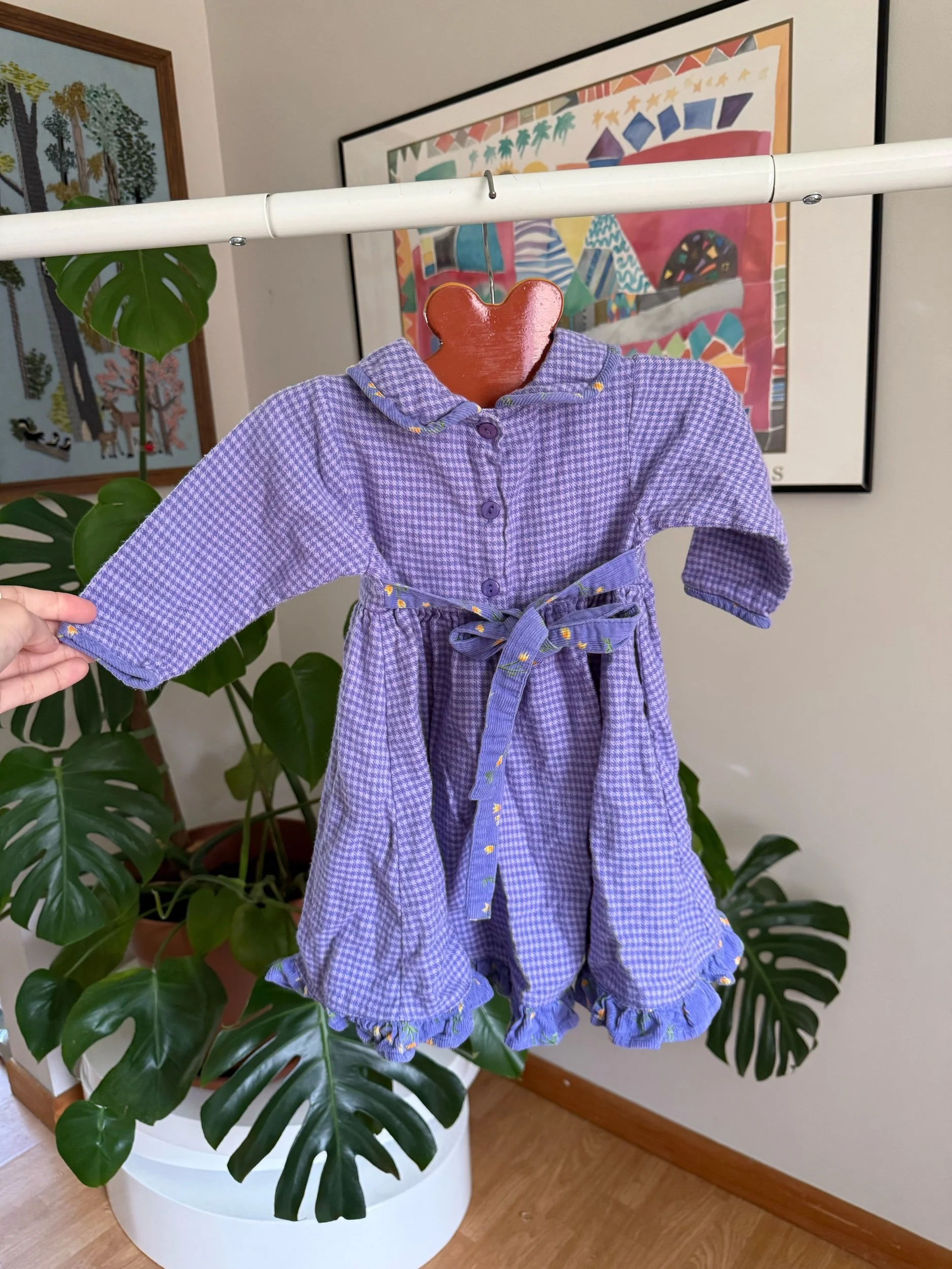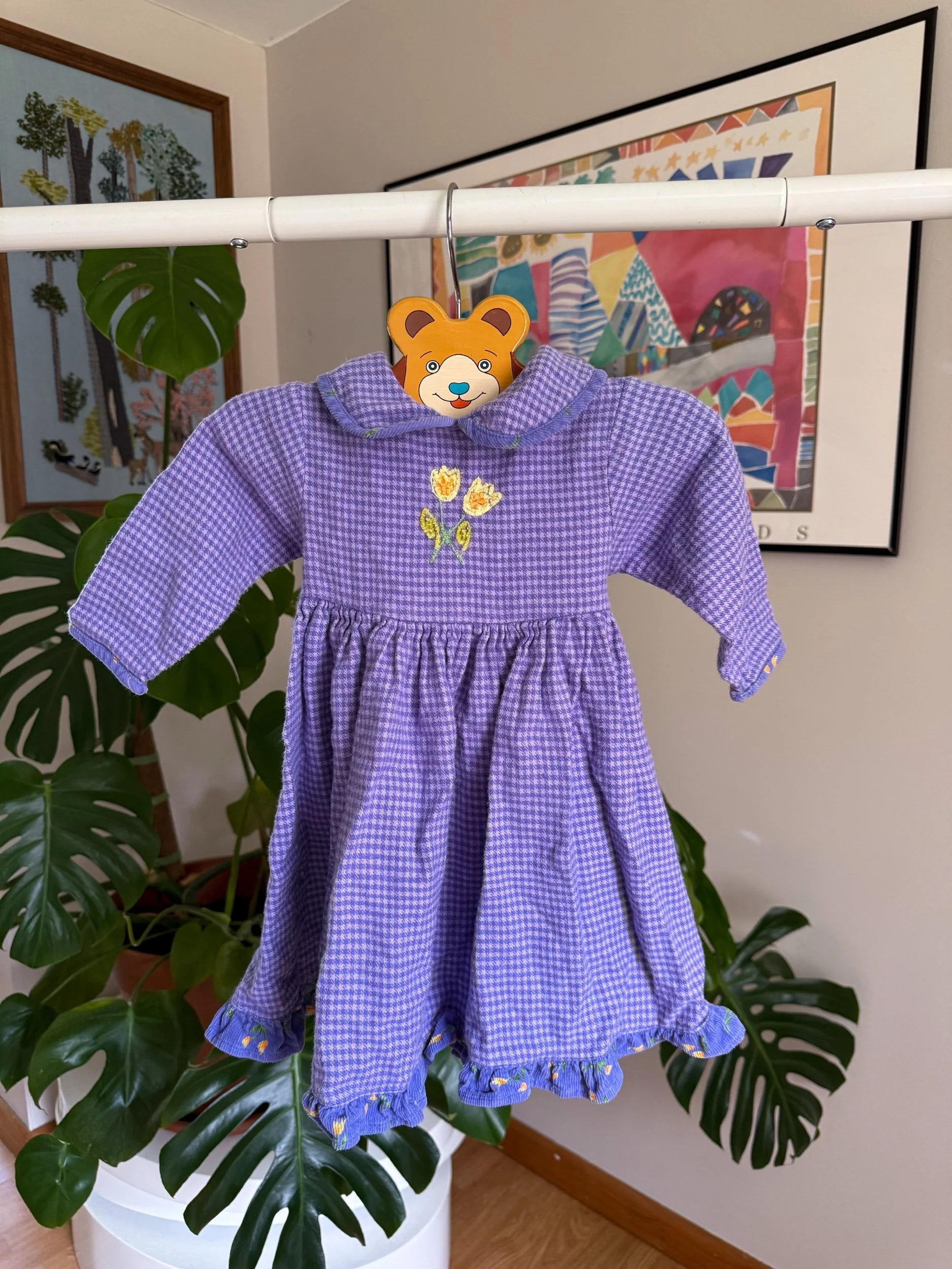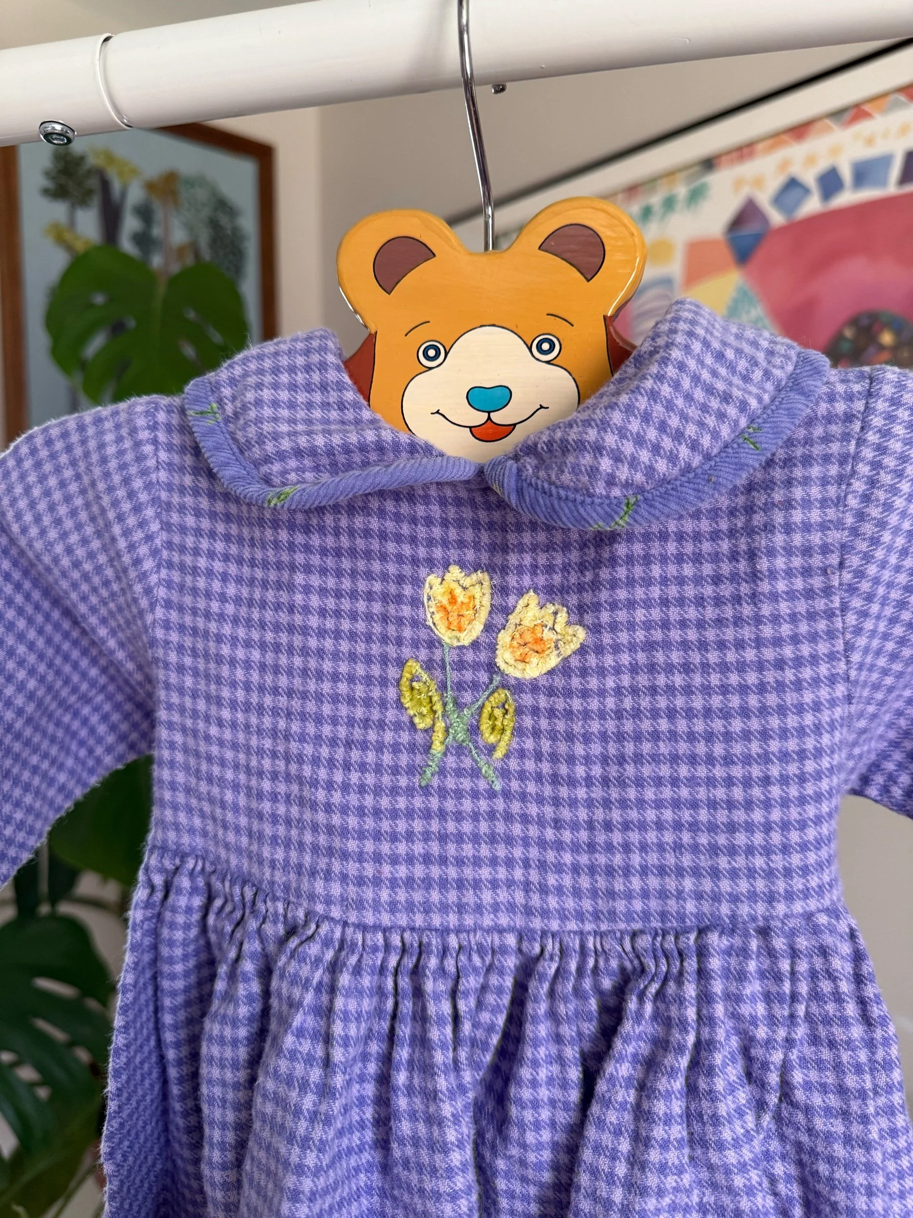 adorable gingham purple with collar, tie-back, and little yellow tulip embroidery :)