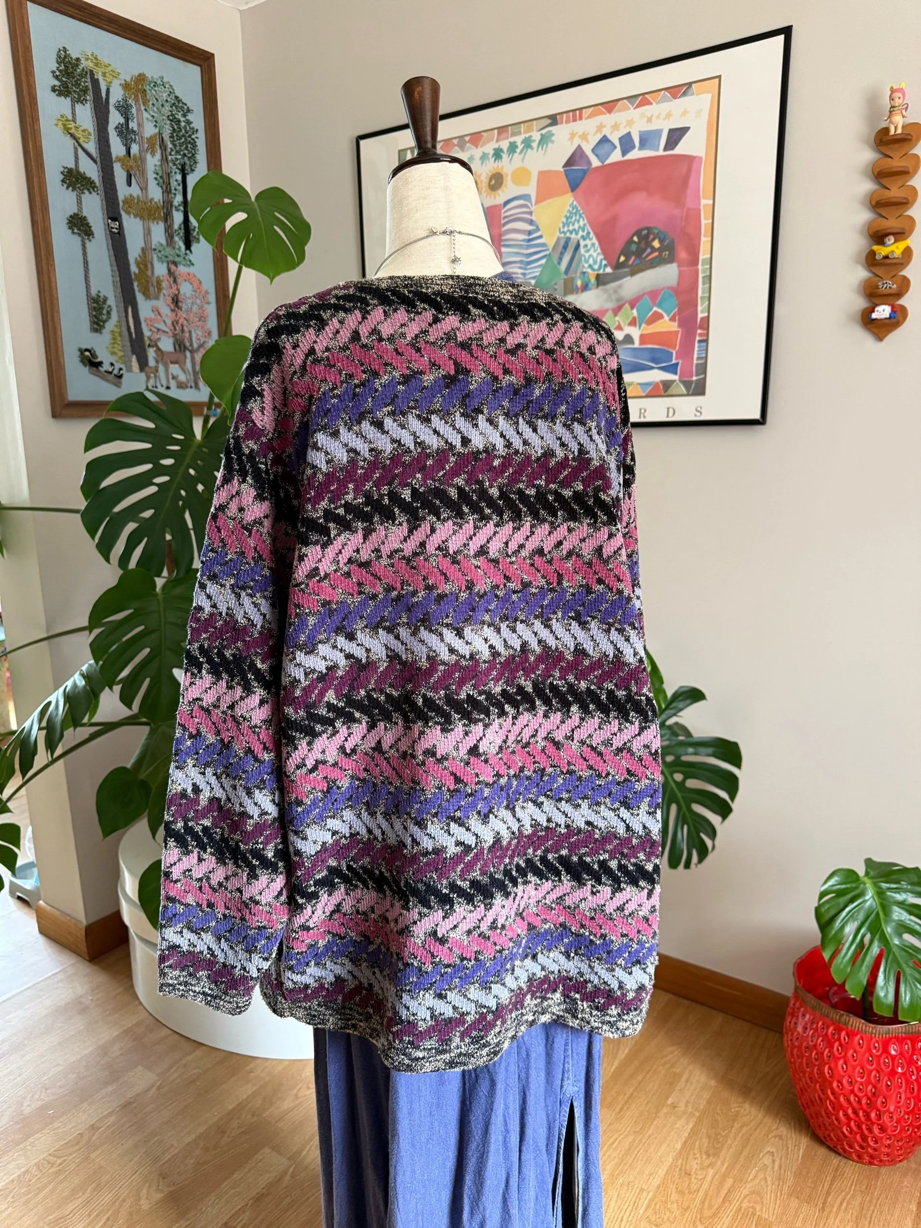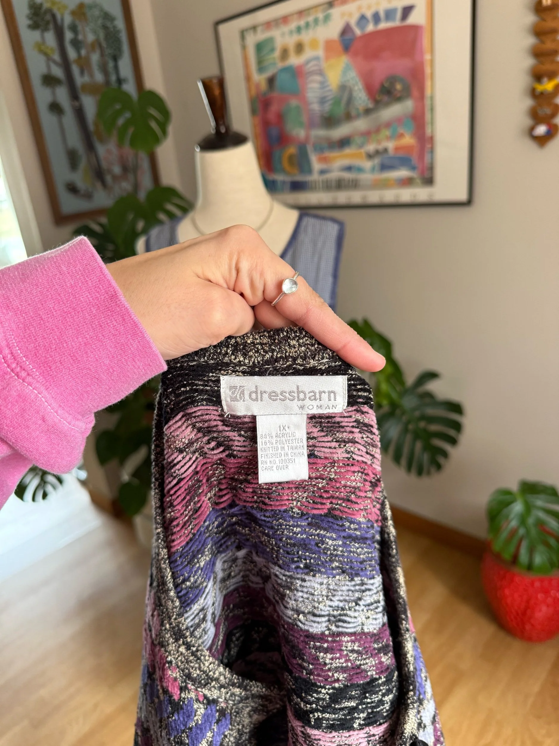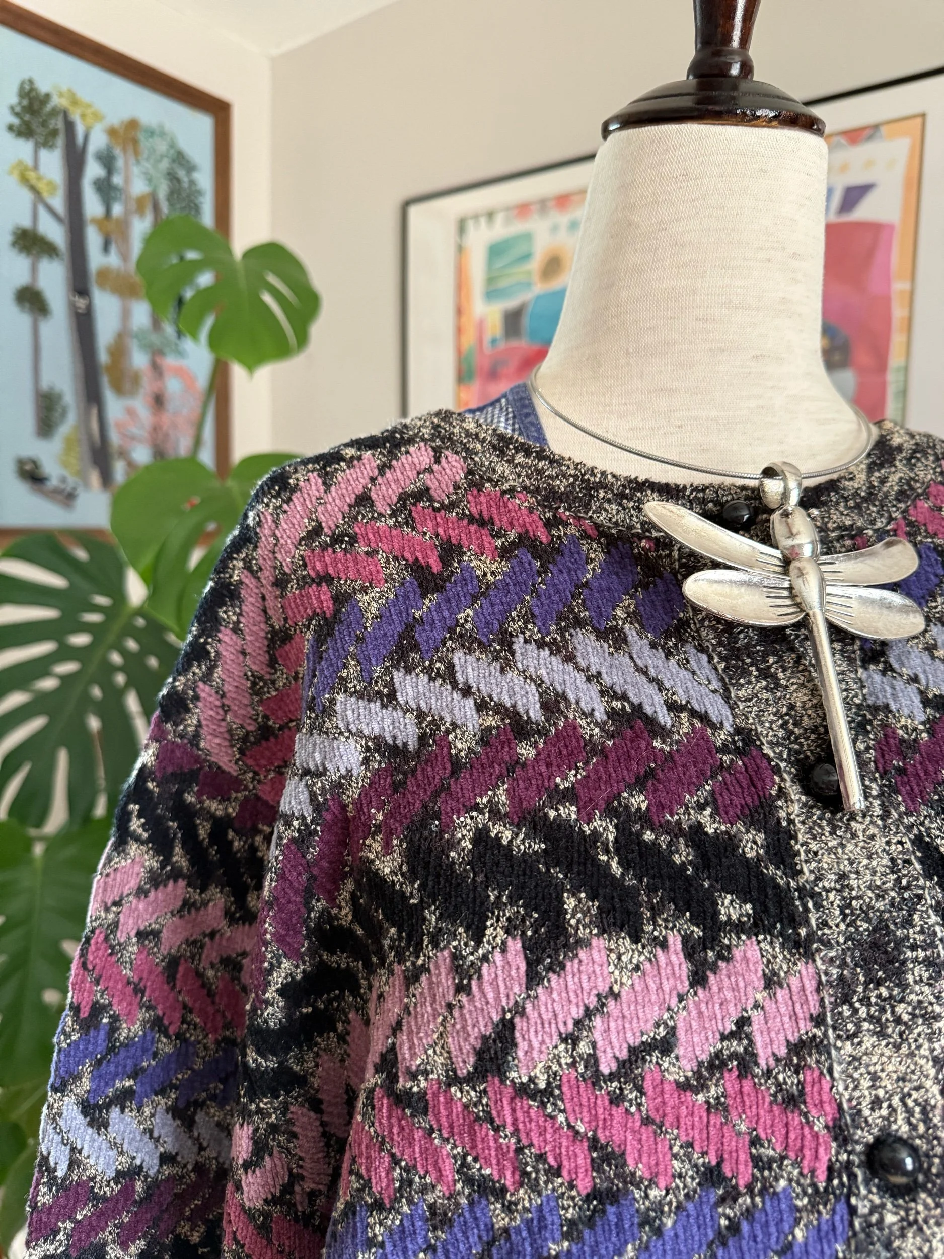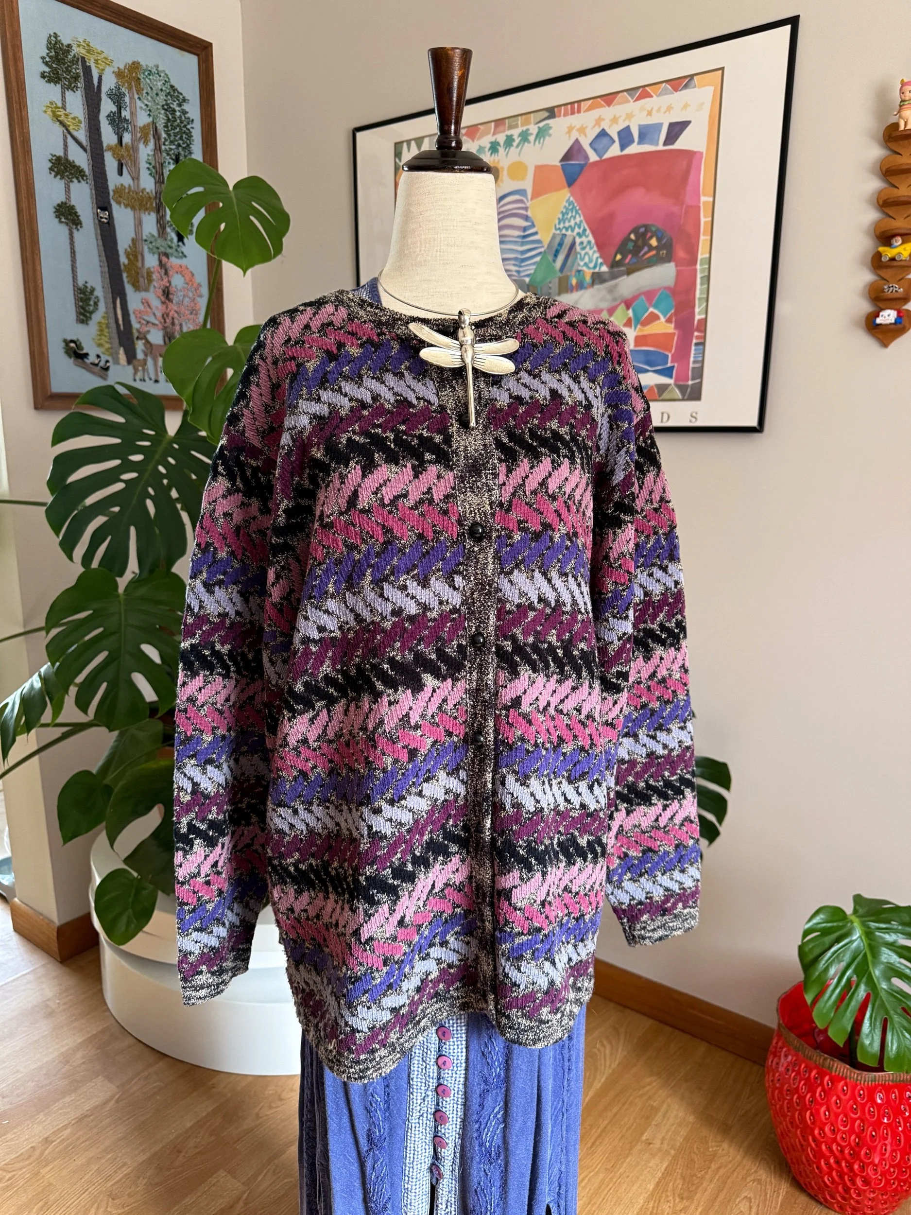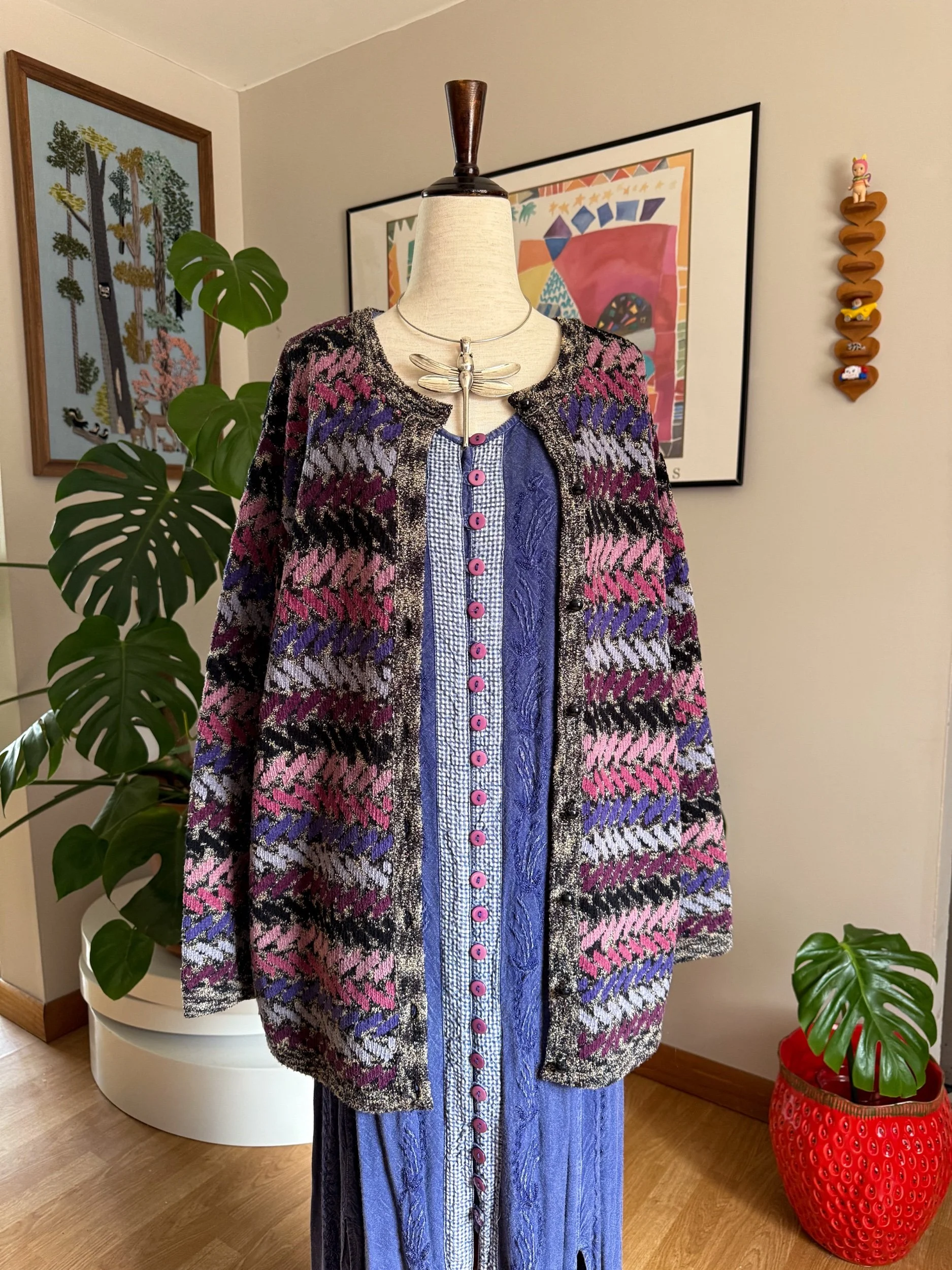 cozy & whimsical blue & purple hue cardigan with pattern all around :) has button closure