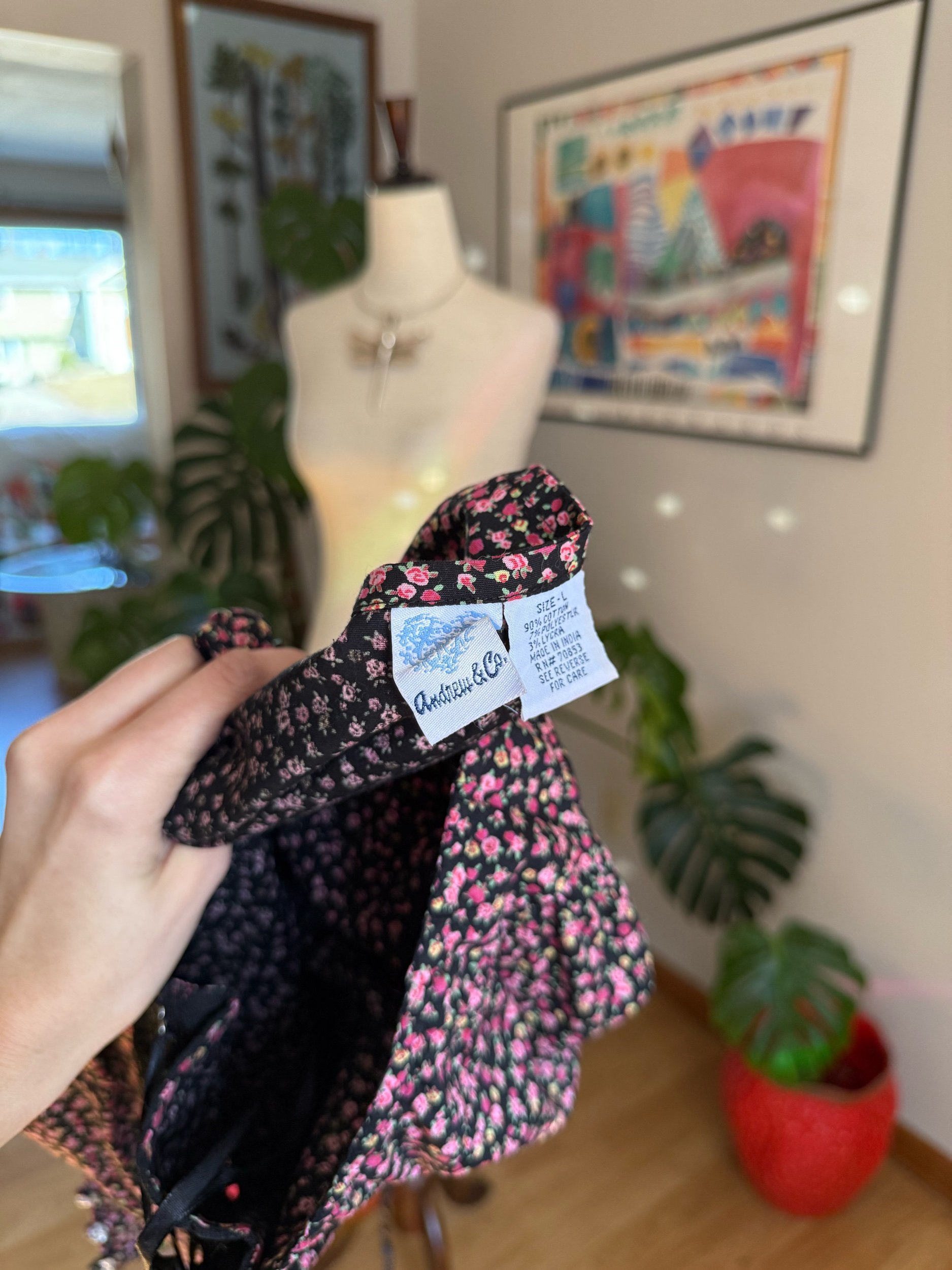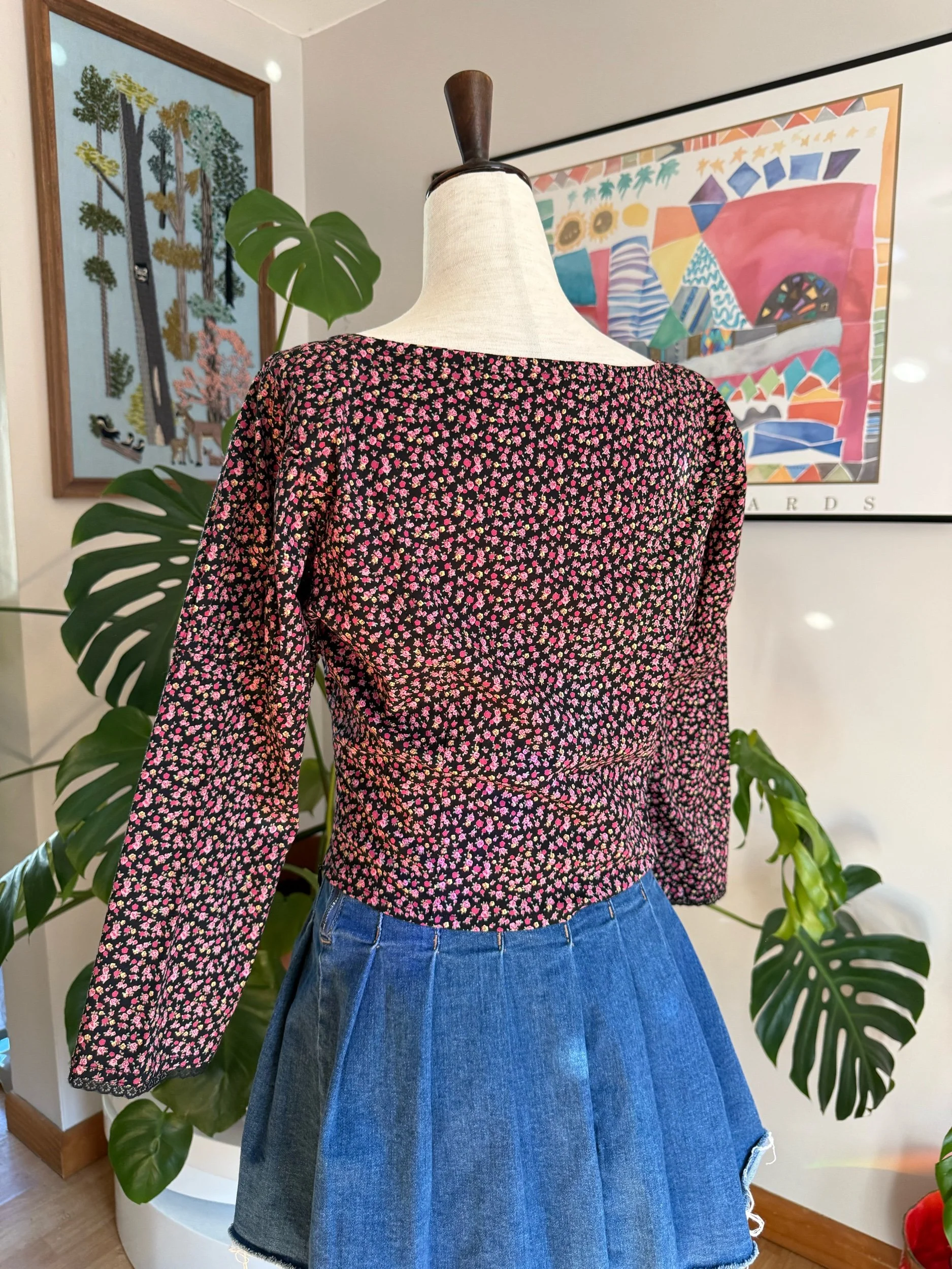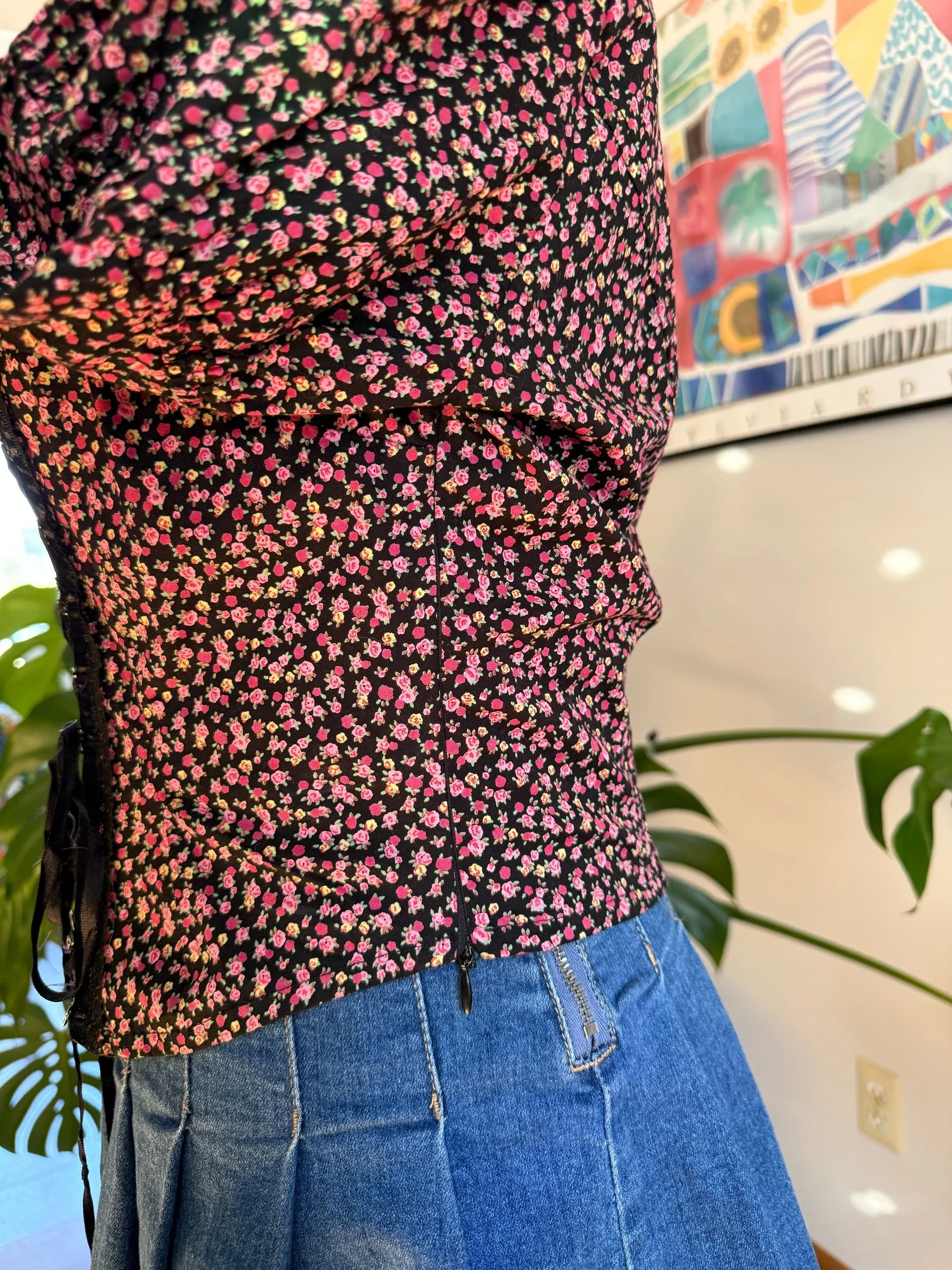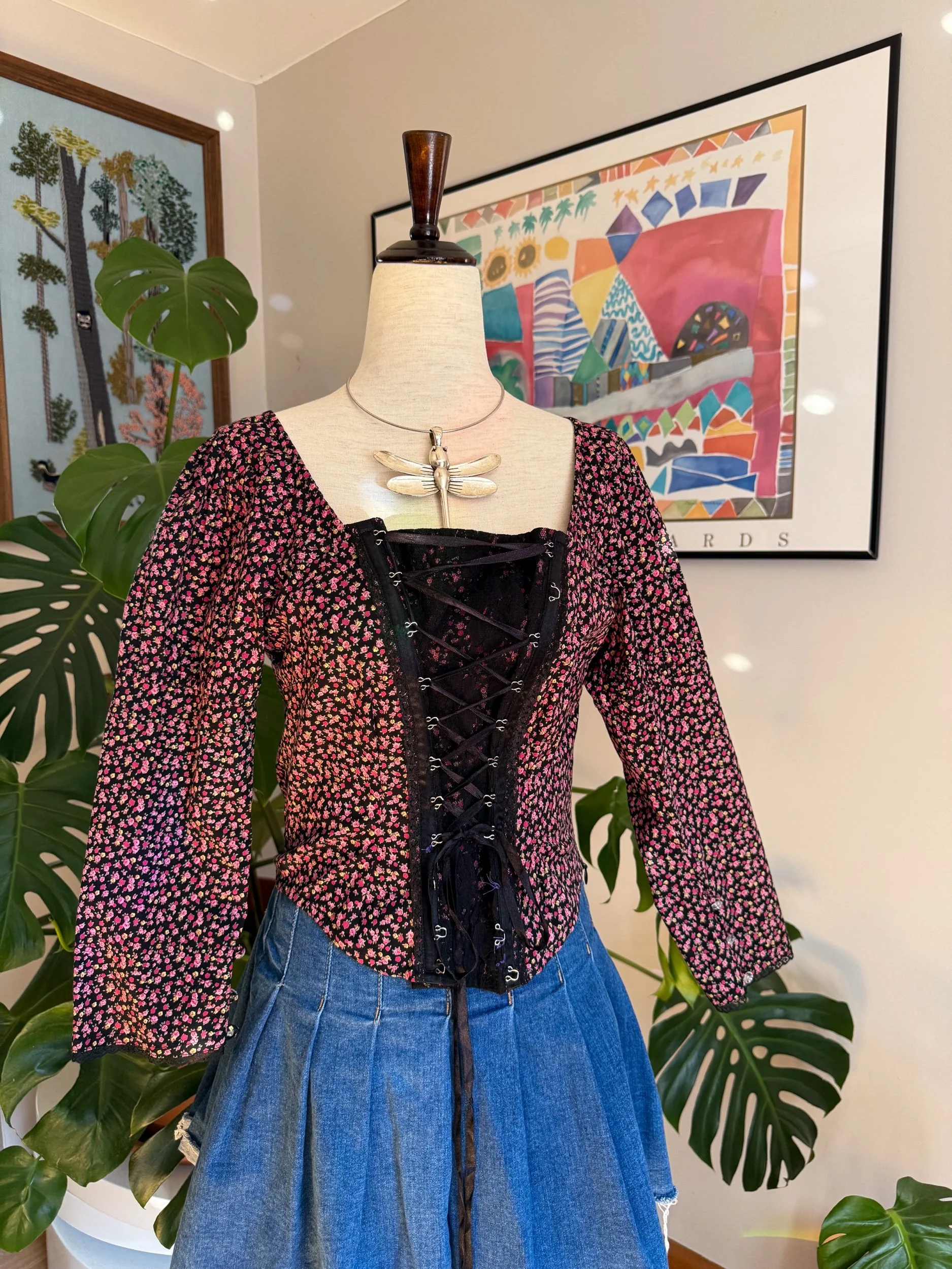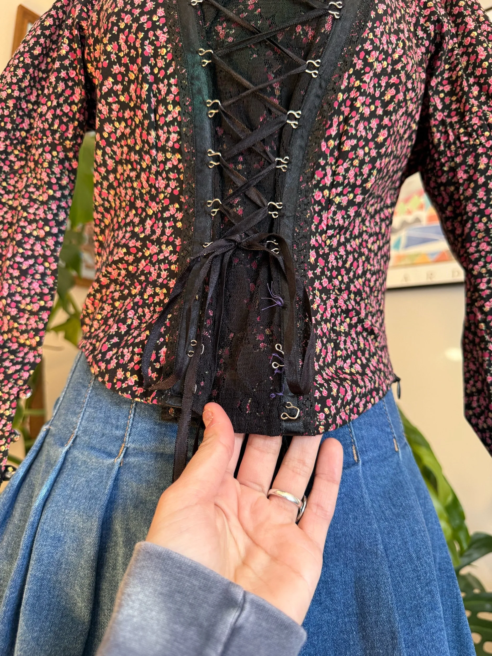 beautiful vintage corset tie floral top, with statement sleeves & small floral pattern / has a zipper on the side / corset top string comes out & is able to be adjusted!