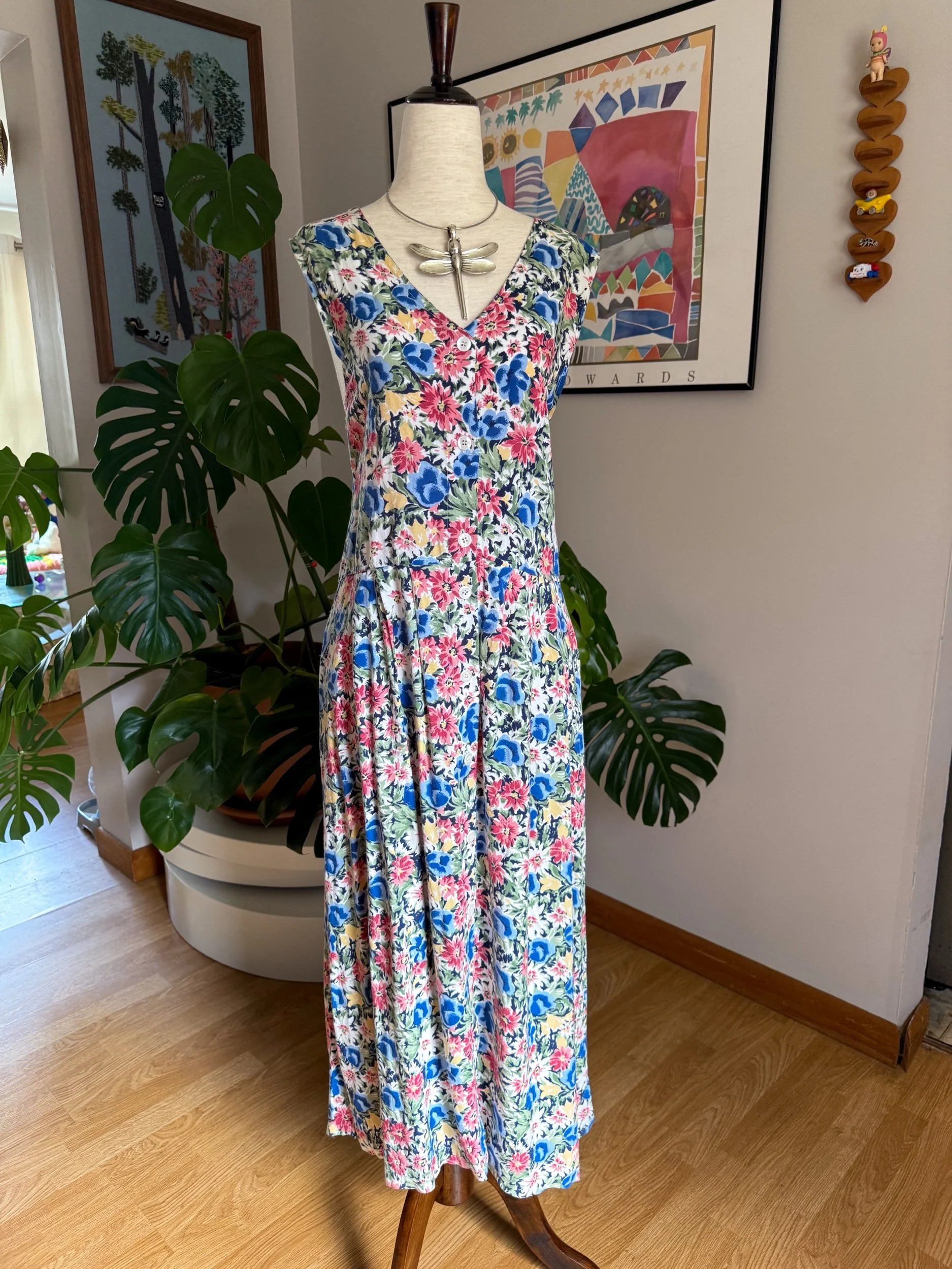 beautiful & colorful maxi dress with button detailing down the center :) and yes, she has pockets!!