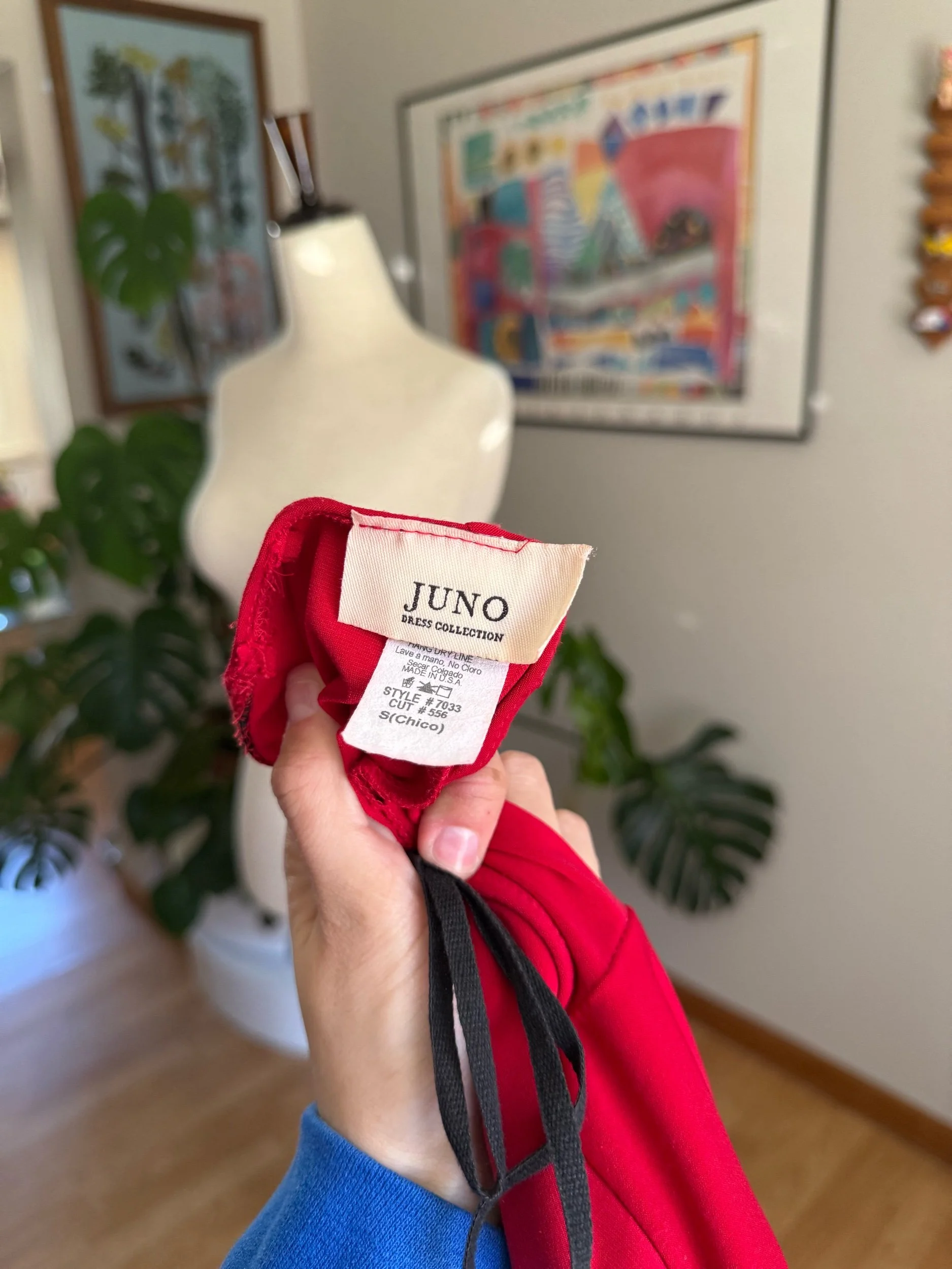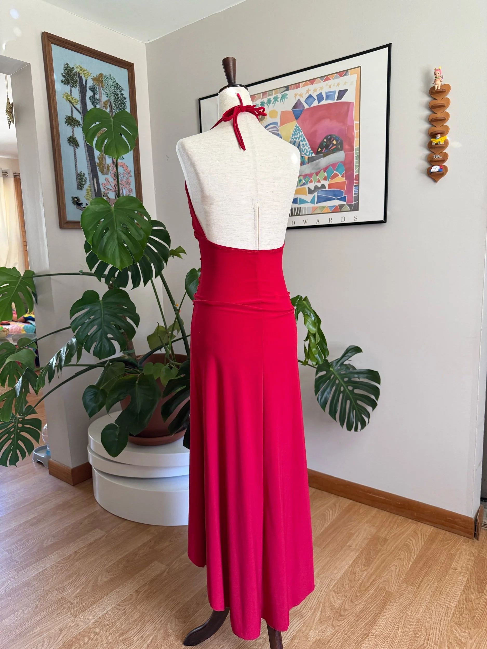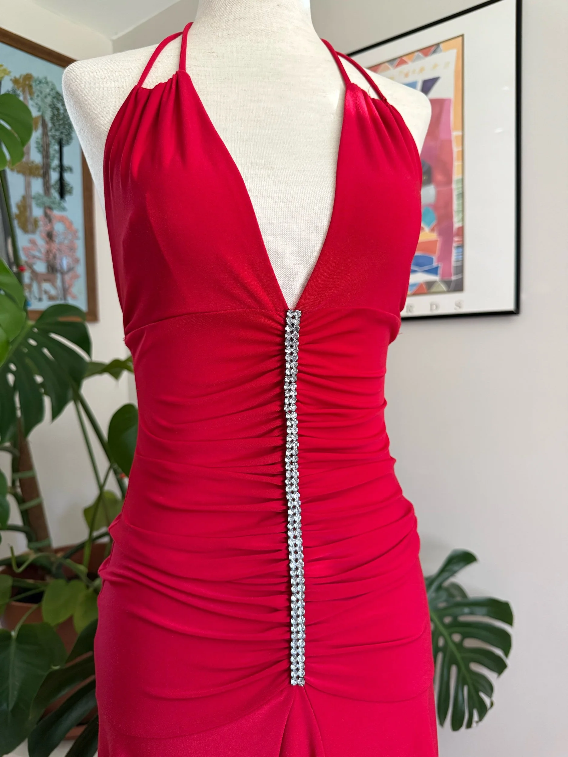 Flattering & vibrant, this vintage dress with gem detail is flowy & stunning! The open back is one of my favorite parts, as well as the flowy bottom. The straps are adjustable & able to tie however you’d like!