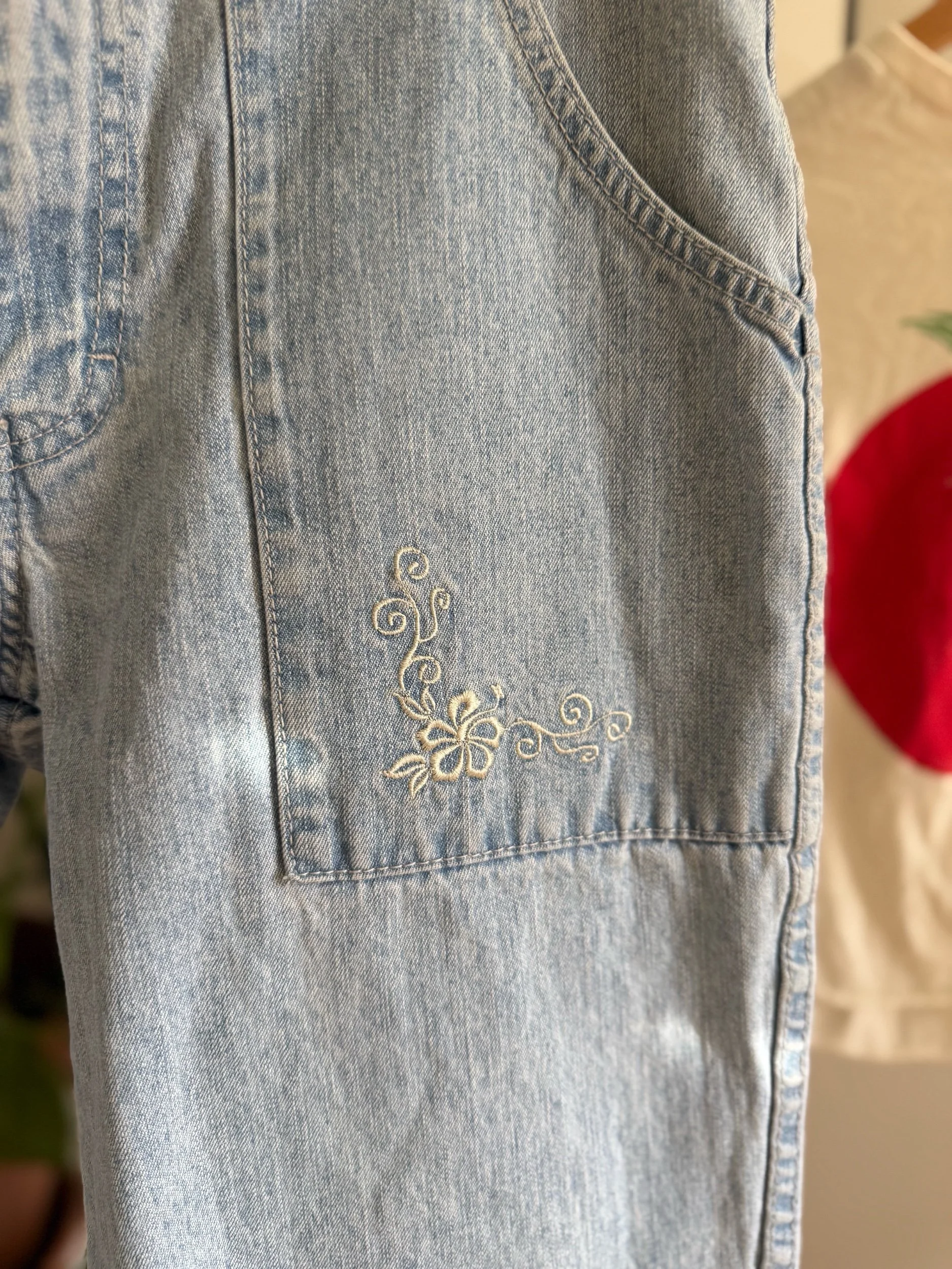 the cutest early 2000s denim capris with distressed hems, rope waist-tie, and flower embroidery :)